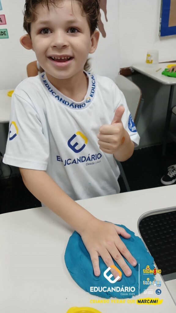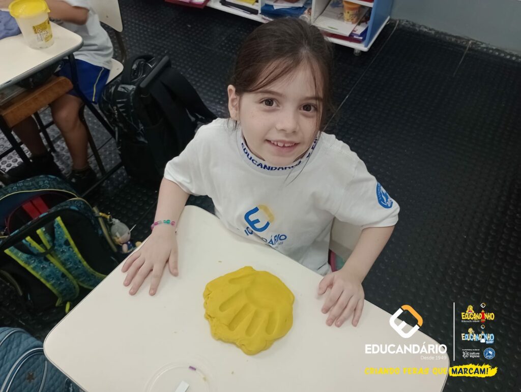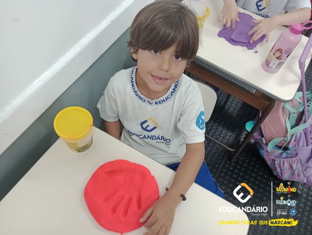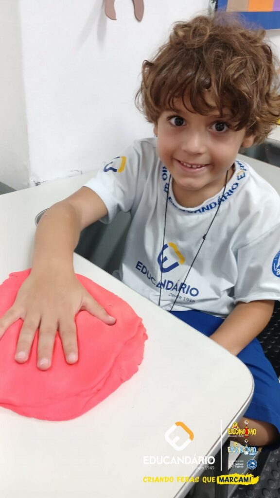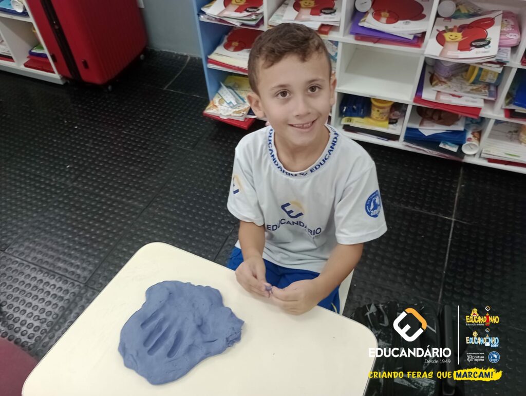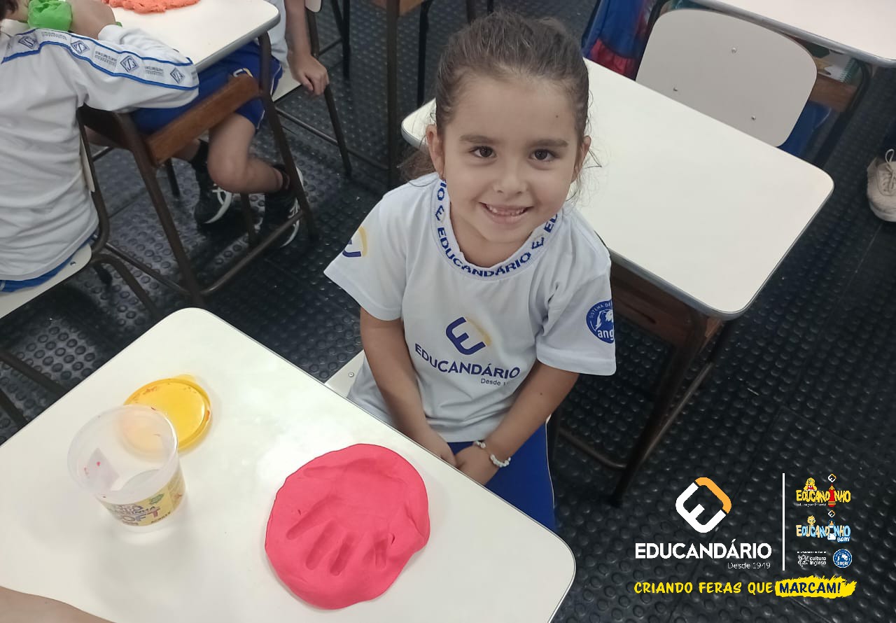 Conforme a parlenda estudada em sala de aula, os alunos reconheceram os nomes dos dedos e para intensificar a aprendizagem a turma do 1º ano utilizou a massinha para fazer a impressão das mãos.