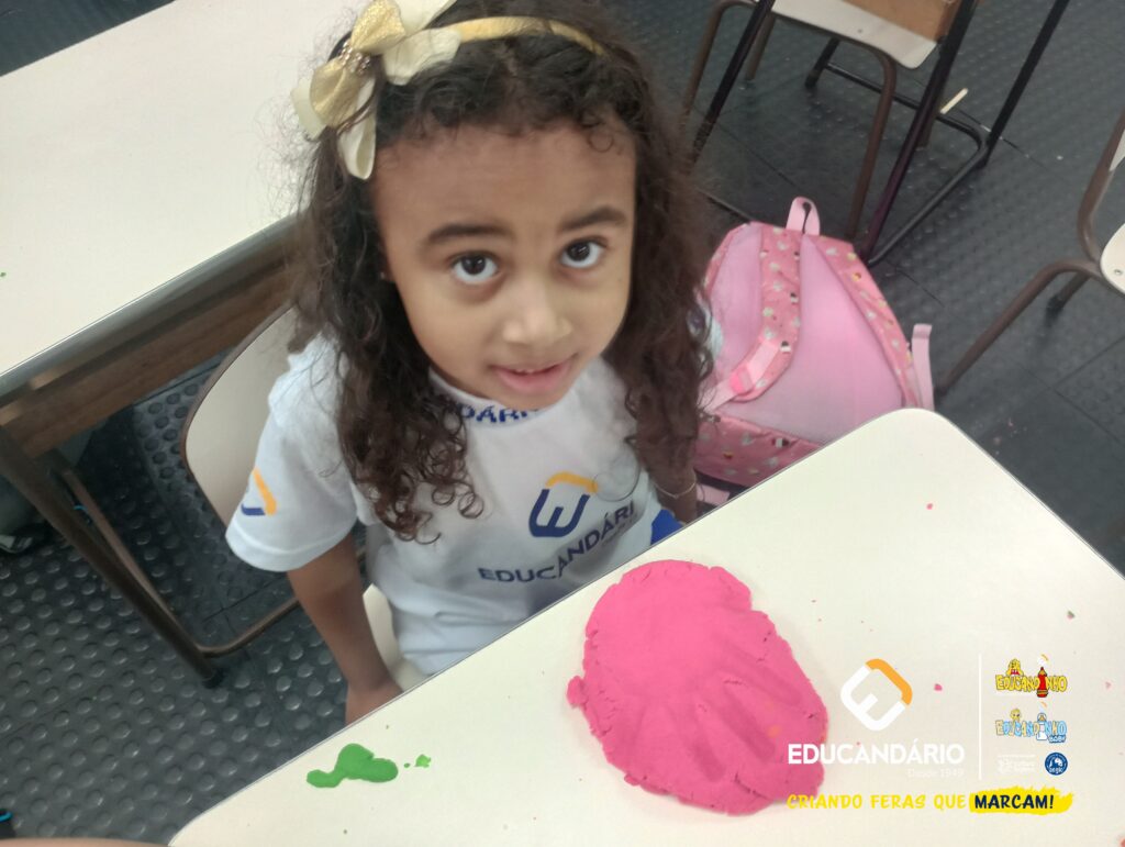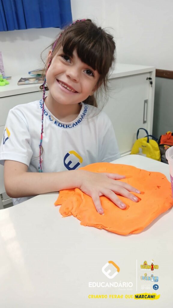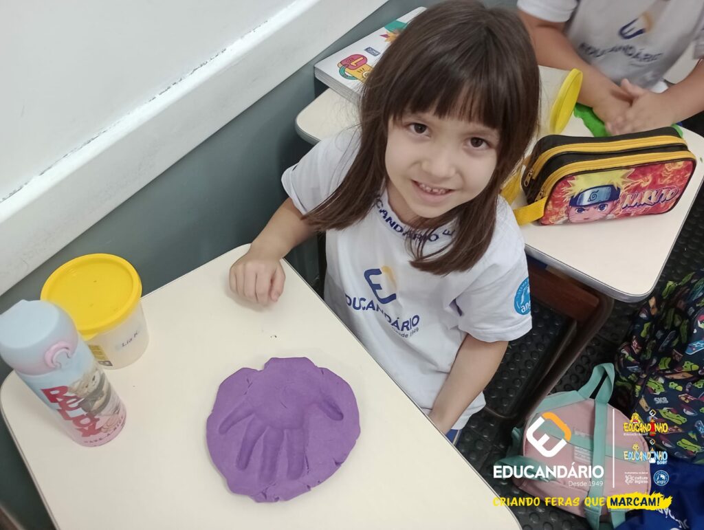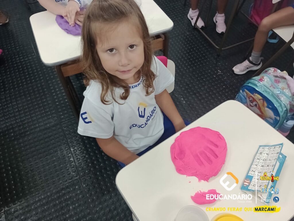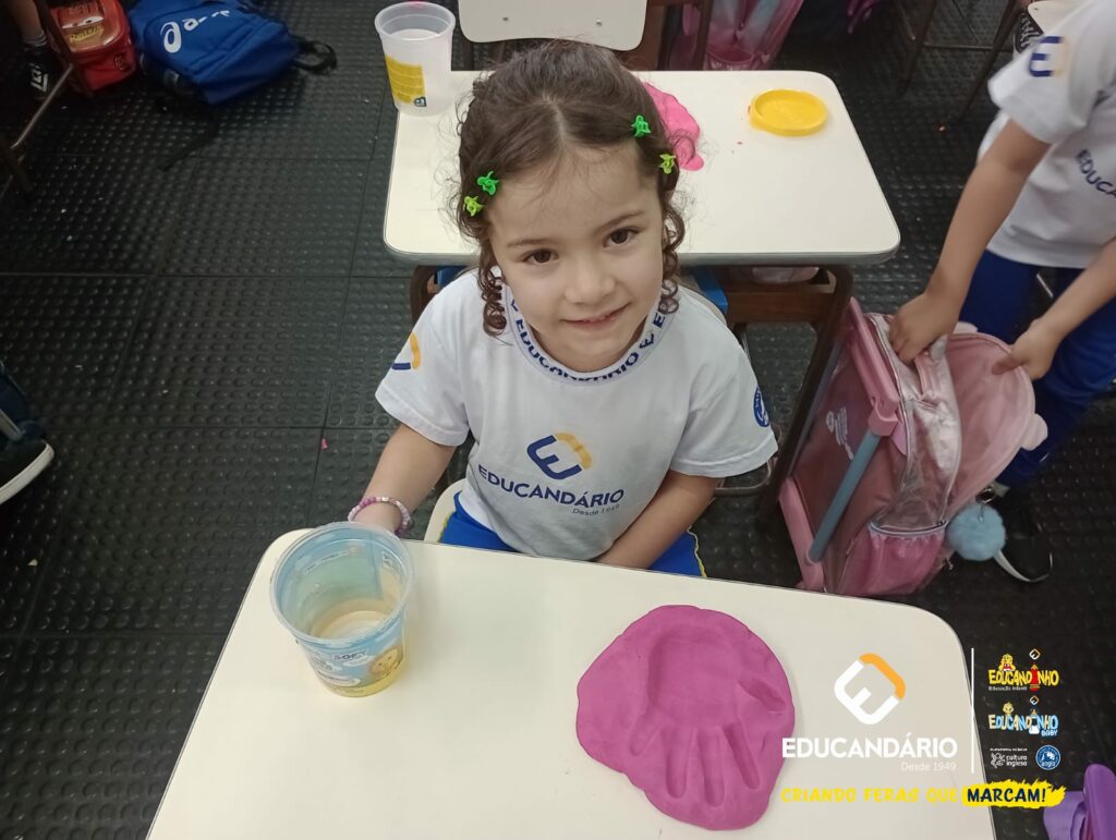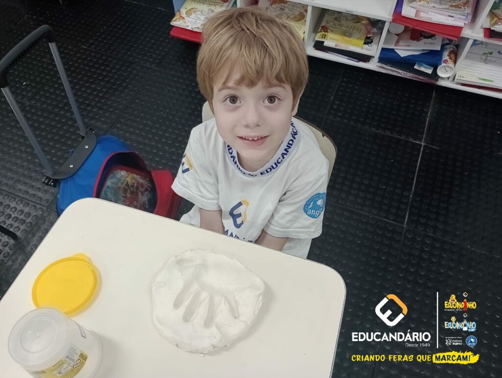 Conforme a parlenda estudada em sala de aula, os alunos reconheceram os nomes dos dedos e para intensificar a aprendizagem a turma do 1º ano utilizou a massinha para fazer a impressão das mãos.