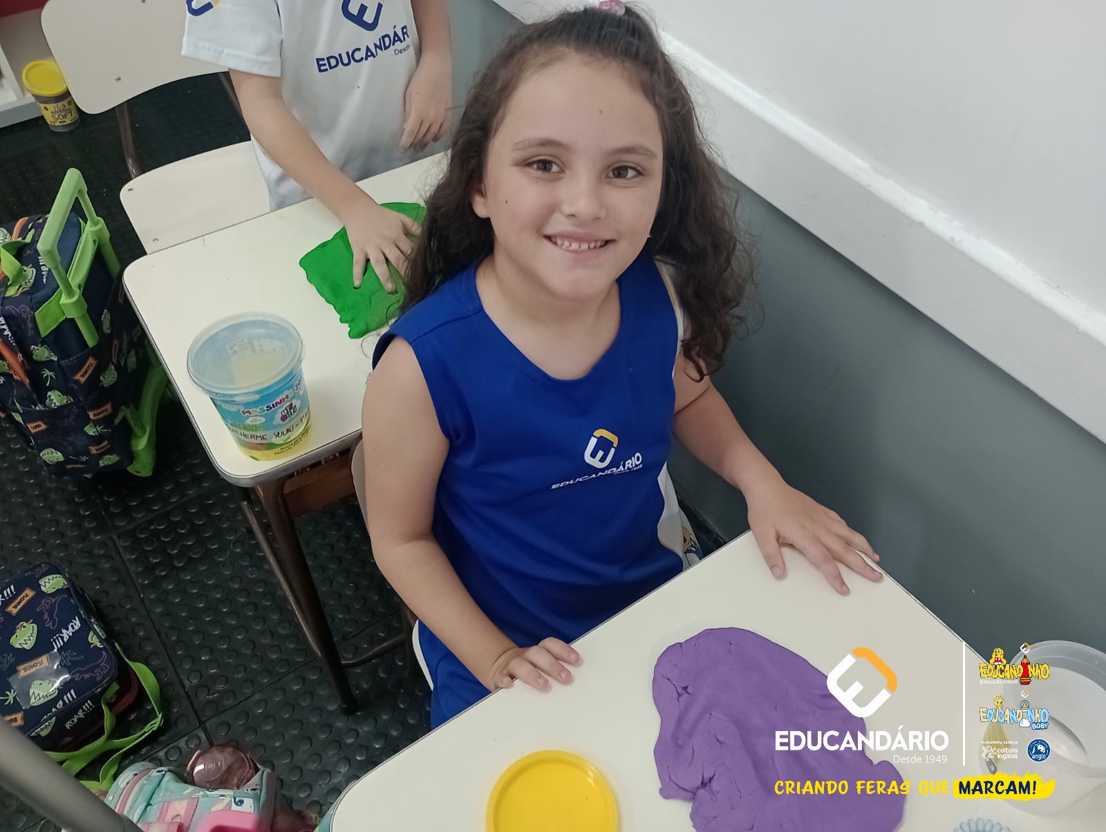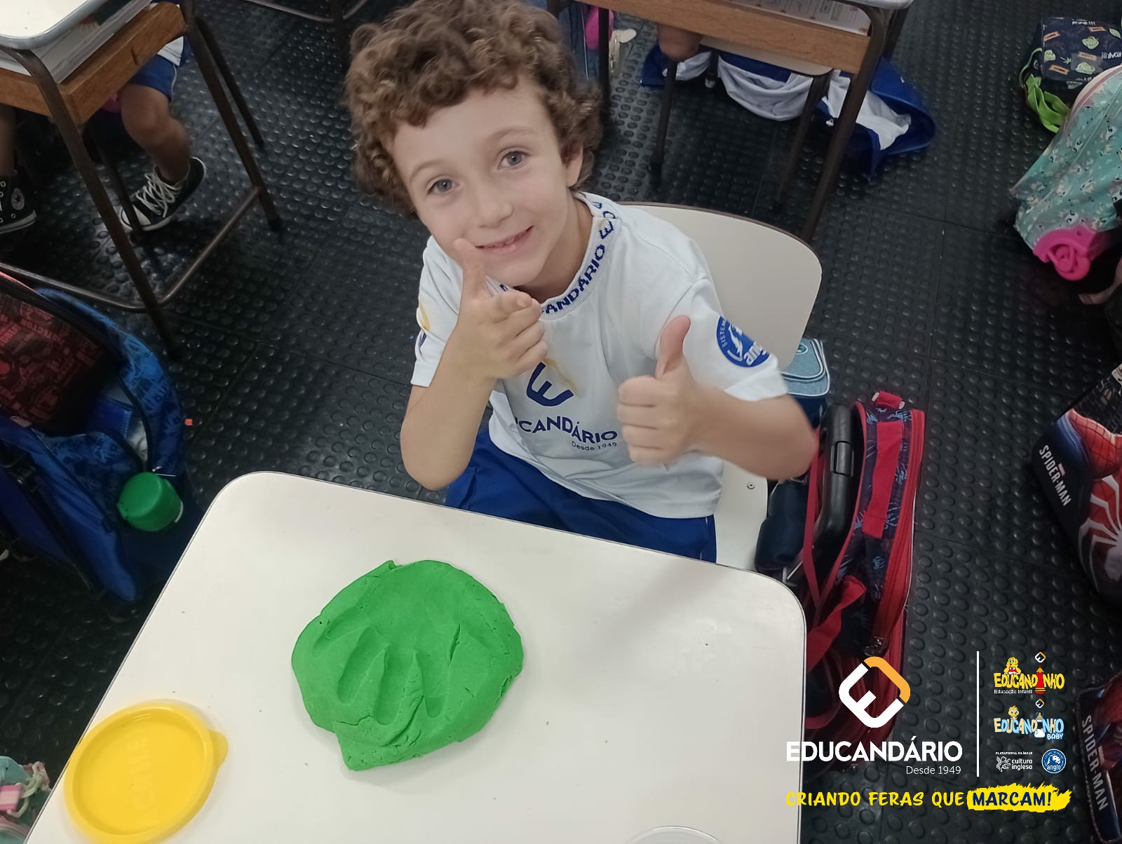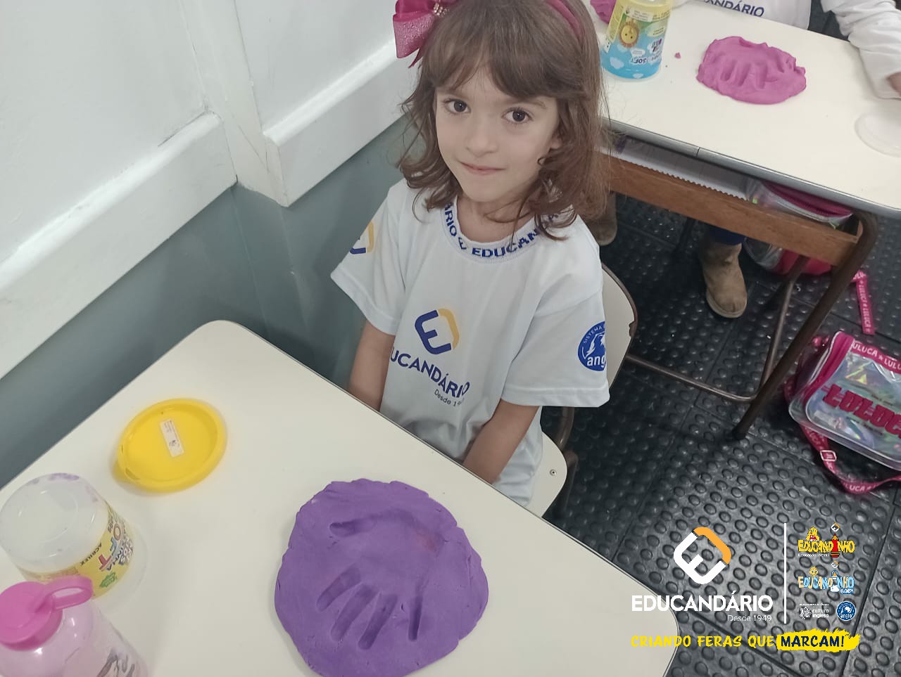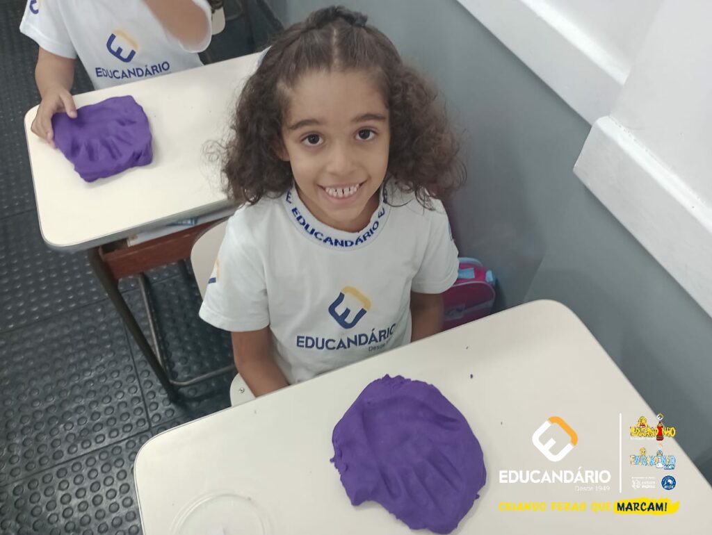 Conforme a parlenda estudada em sala de aula, os alunos reconheceram os nomes dos dedos e para intensificar a aprendizagem a turma do 1º ano utilizou a massinha para fazer a impressão das mãos.