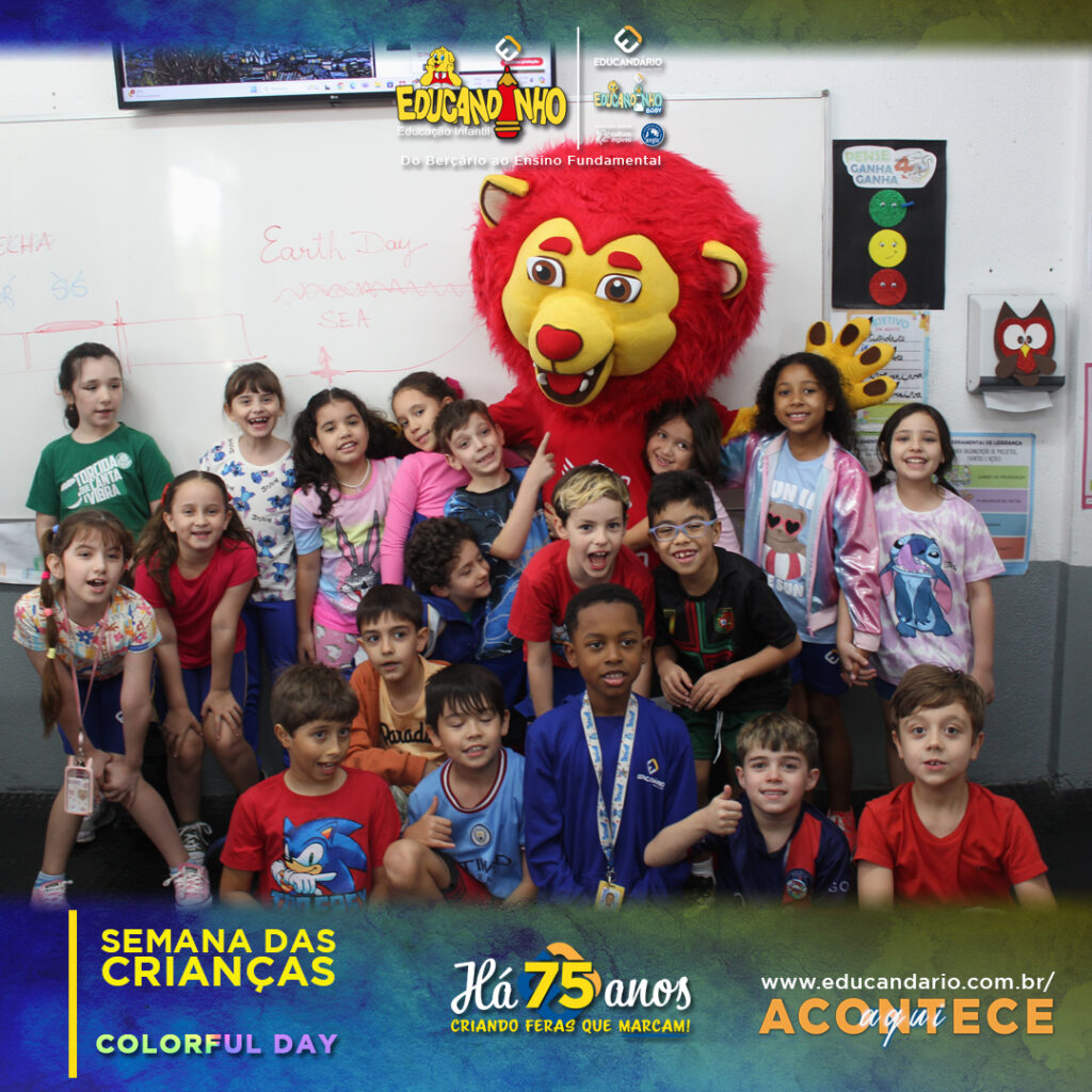 No COLORFUL DAY da Semana das Crianças, as crianças se vestiram com roupas coloridas e participaram de várias atividades recreativas. O dia também contou com uma visita especial: o Lion da Cultura Inglesa, que trouxe ainda mais alegria ao evento. Agradecimentos: Cultura Inglesa.