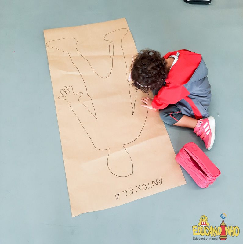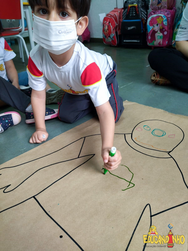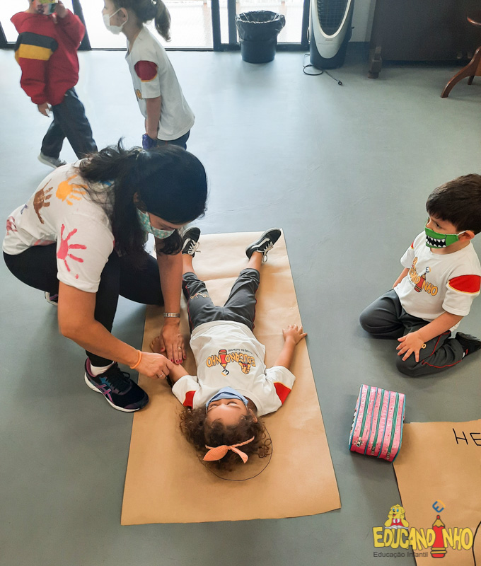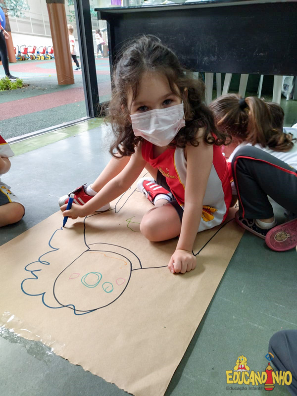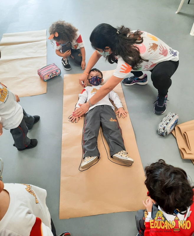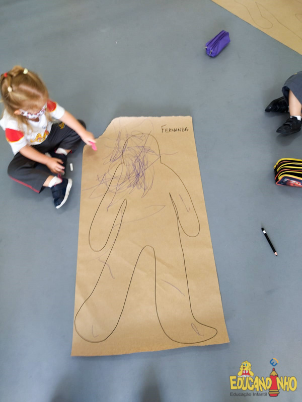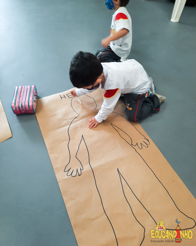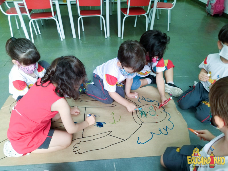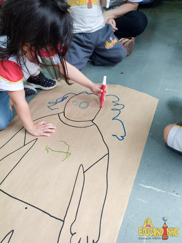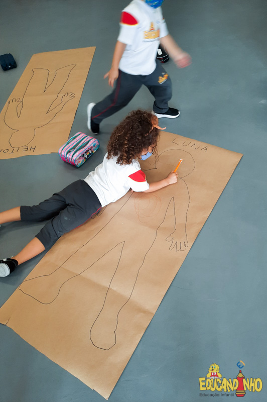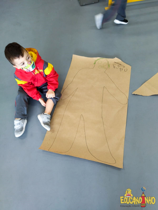Brincando e aprendendo as crianças do Infantil 2, reconheceram as partes do corpo desenhando-as em papel Kraft. Depois, andaram em um tapete sensorial, para sentir diferentes texturas através dos pés.