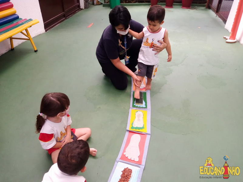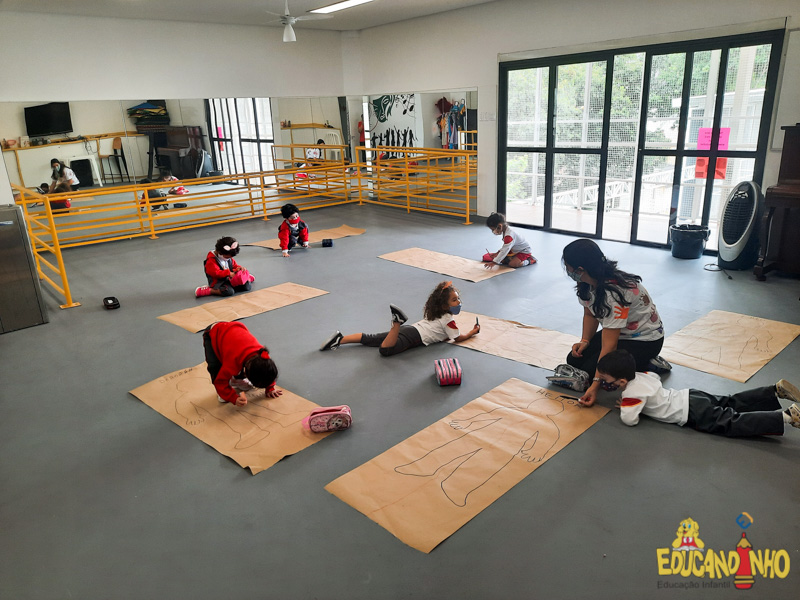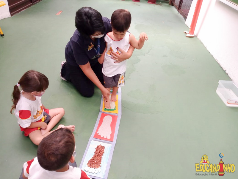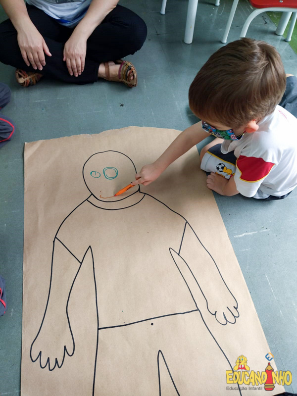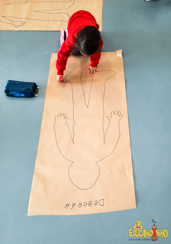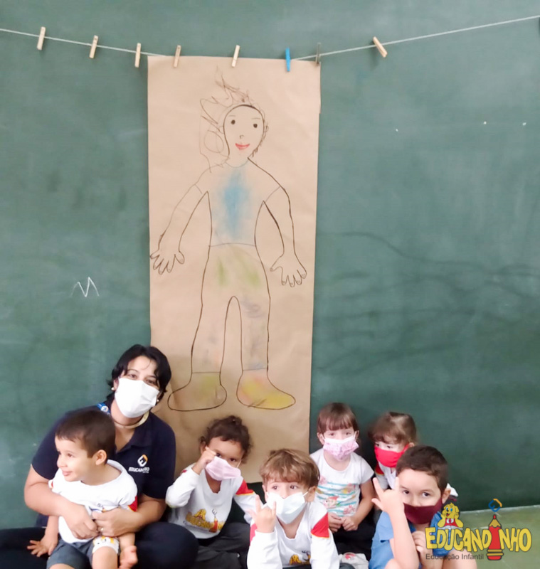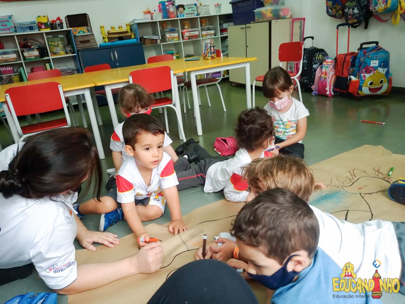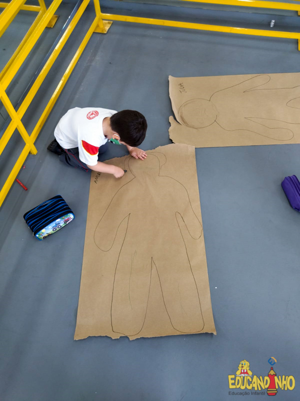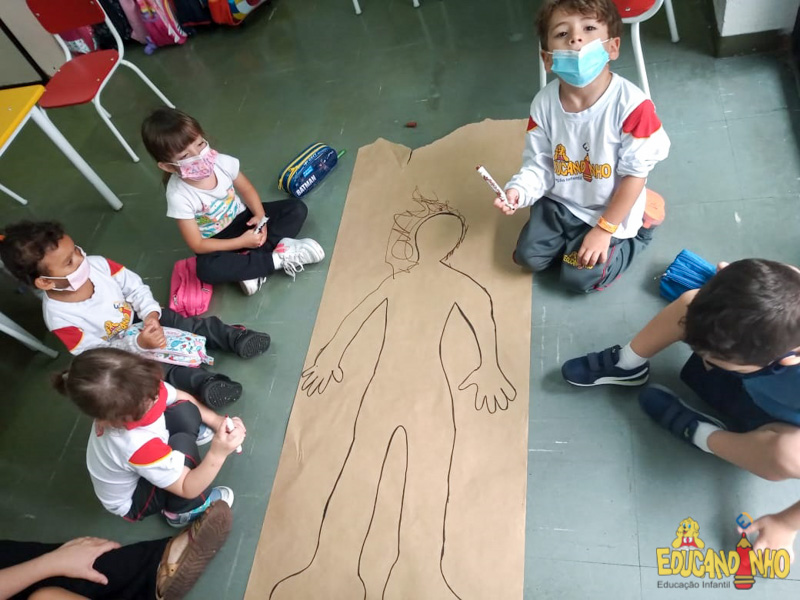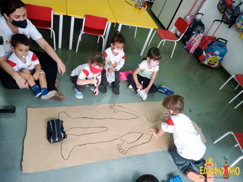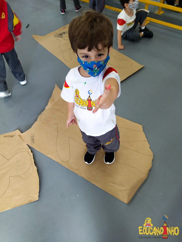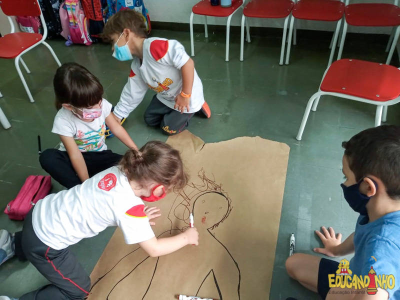 Brincando e aprendendo as crianças do Infantil 2, reconheceram as partes do corpo desenhando-as em papel Kraft. Depois, andaram em um tapete sensorial, para sentir diferentes texturas através dos pés.