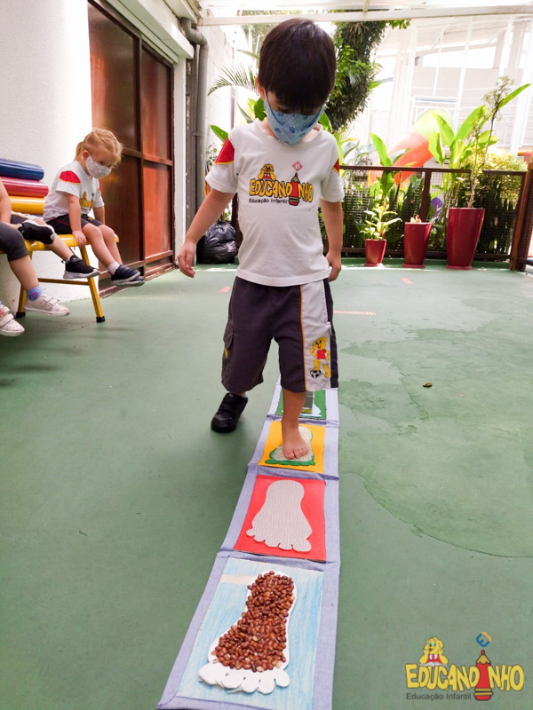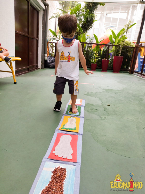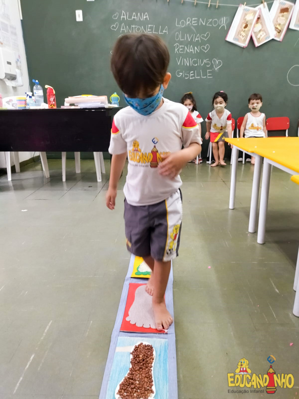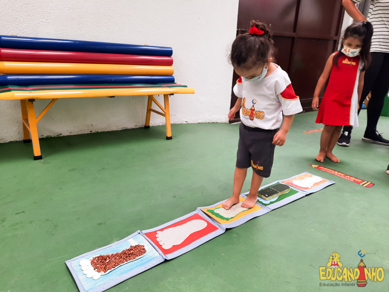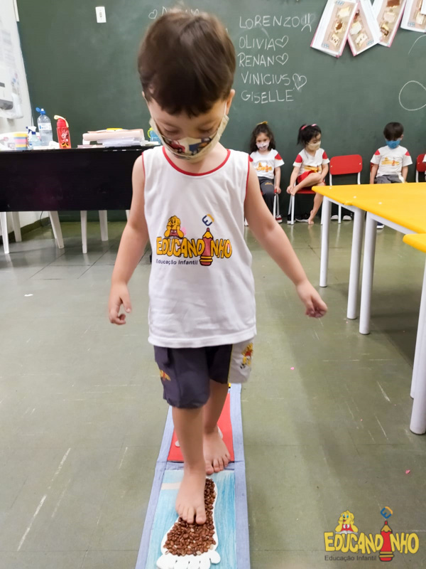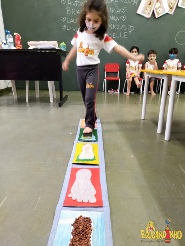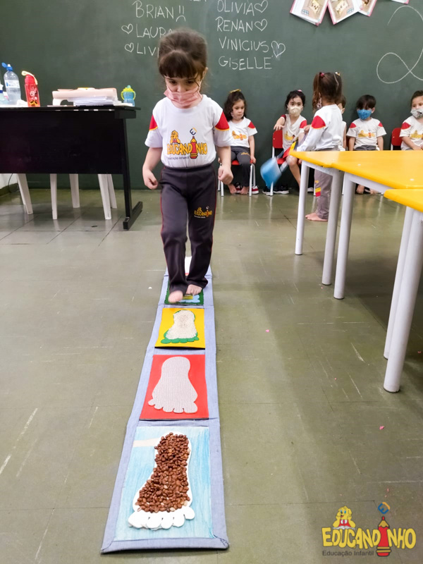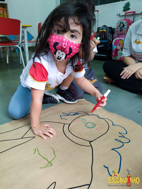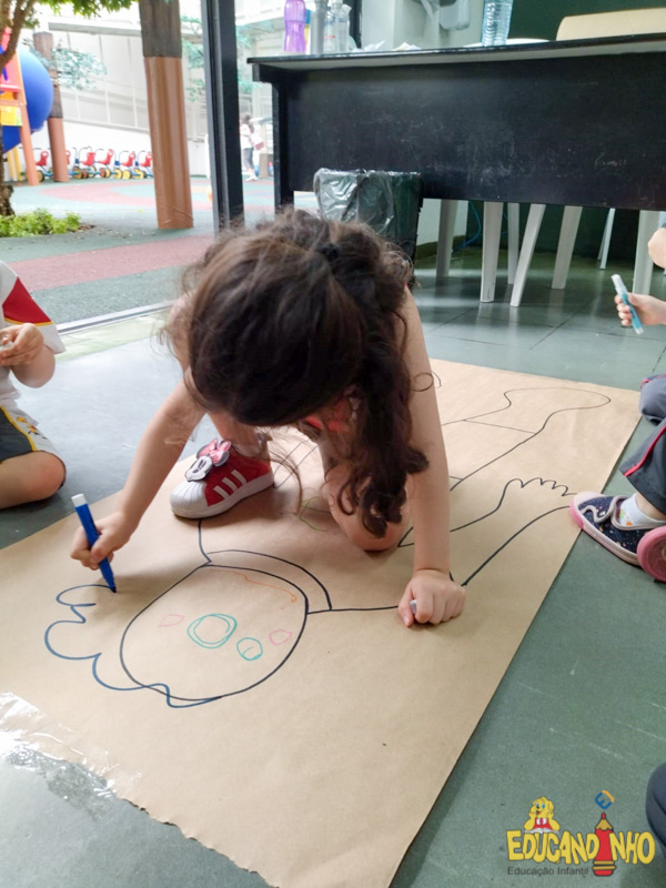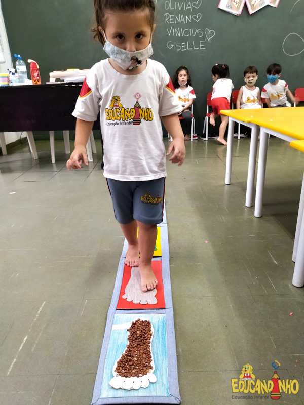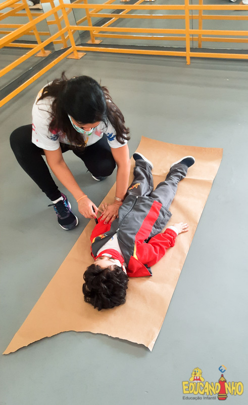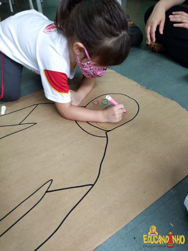 Brincando e aprendendo as crianças do Infantil 2, reconheceram as partes do corpo desenhando-as em papel Kraft. Depois, andaram em um tapete sensorial, para sentir diferentes texturas através dos pés.