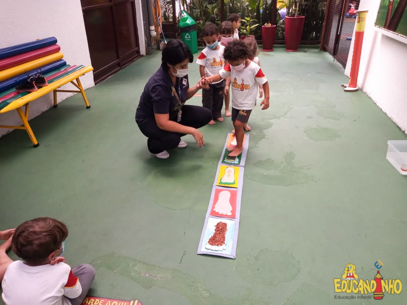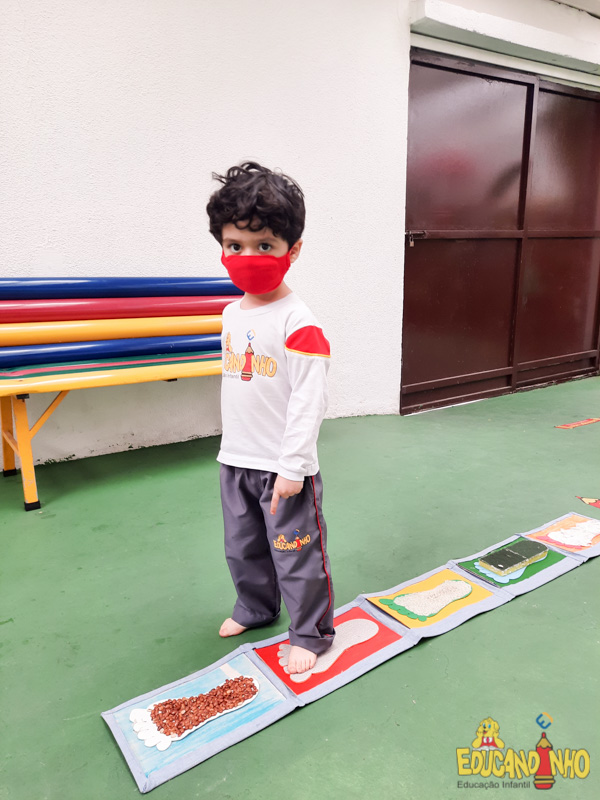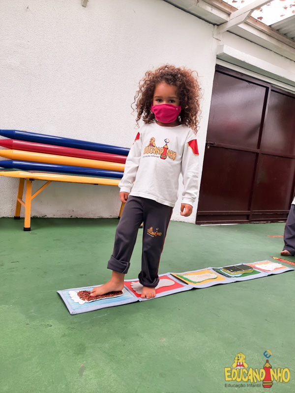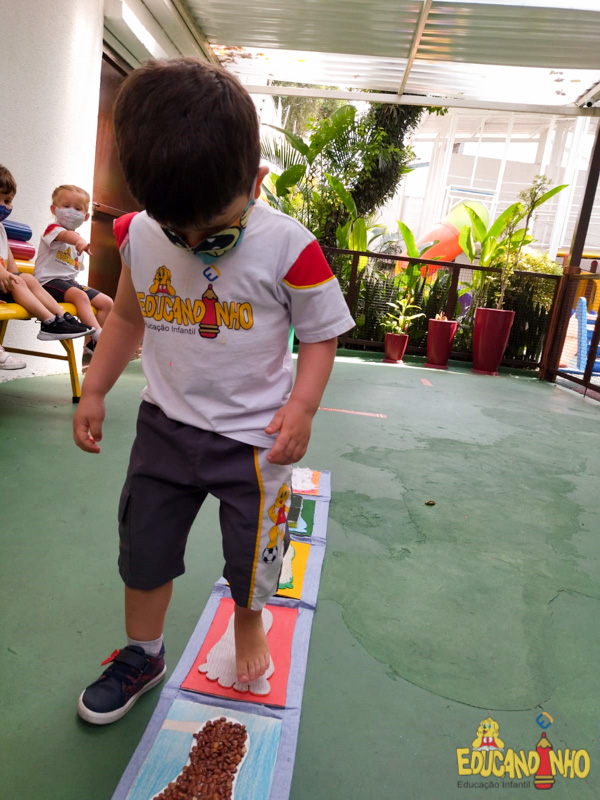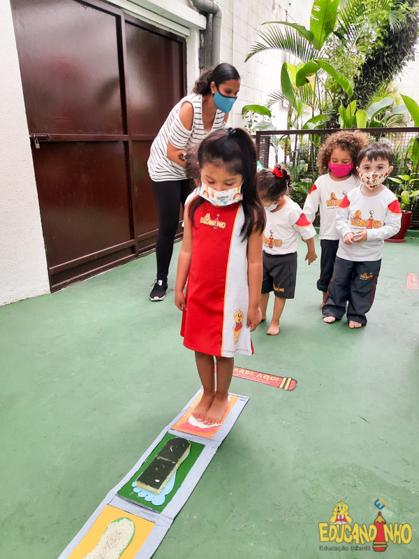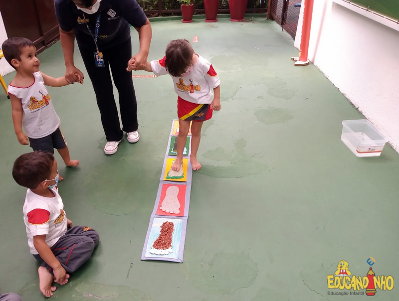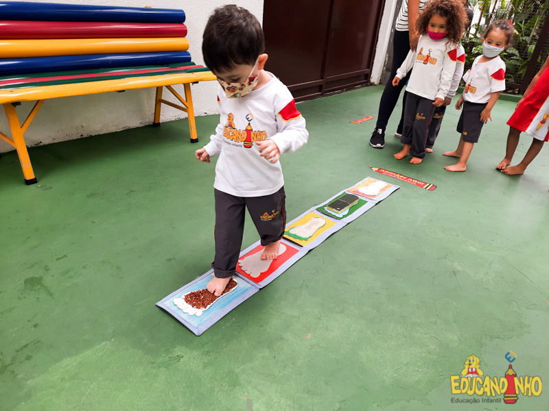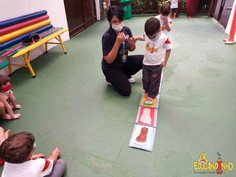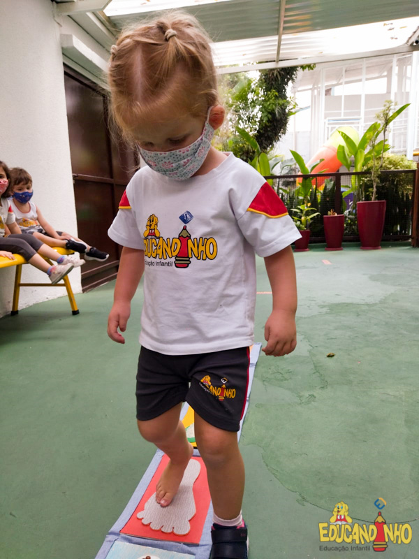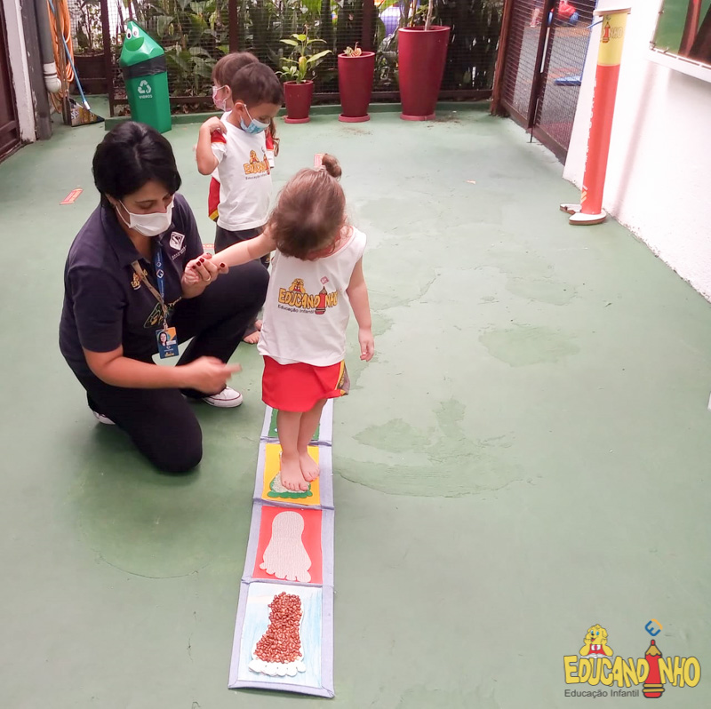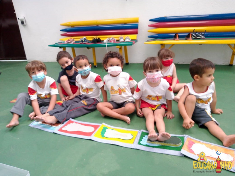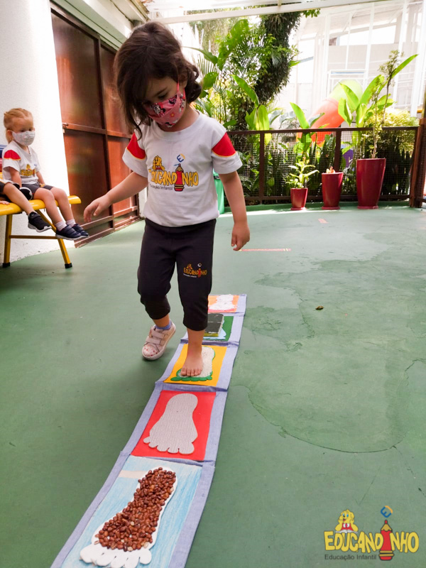 Brincando e aprendendo as crianças do Infantil 2, reconheceram as partes do corpo desenhando-as em papel Kraft. Depois, andaram em um tapete sensorial, para sentir diferentes texturas através dos pés.