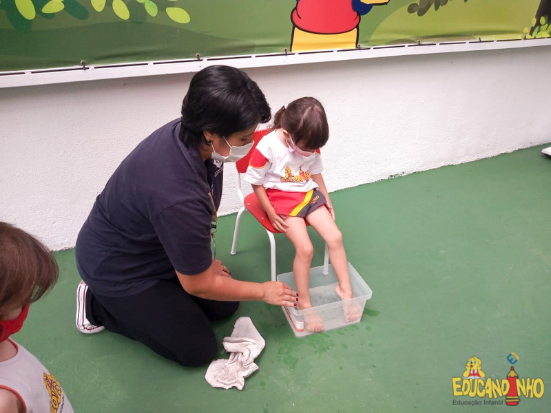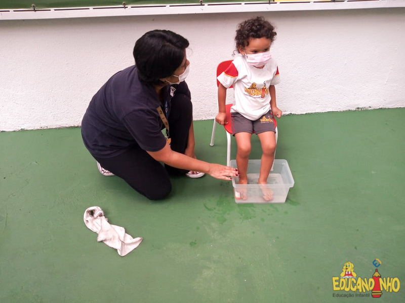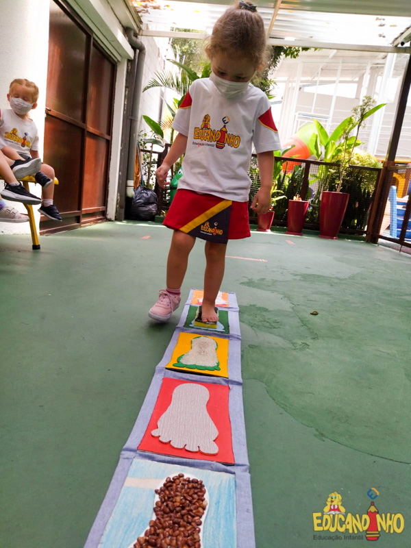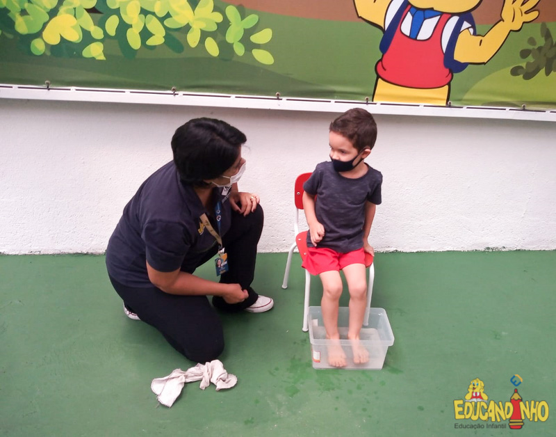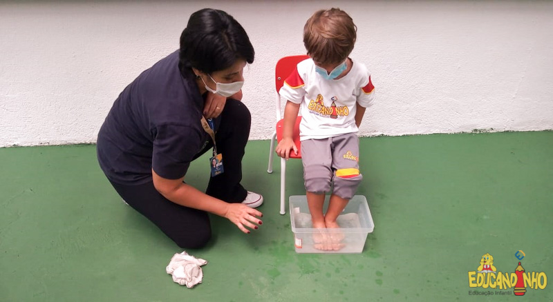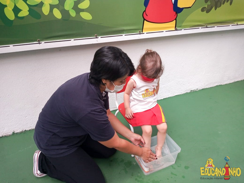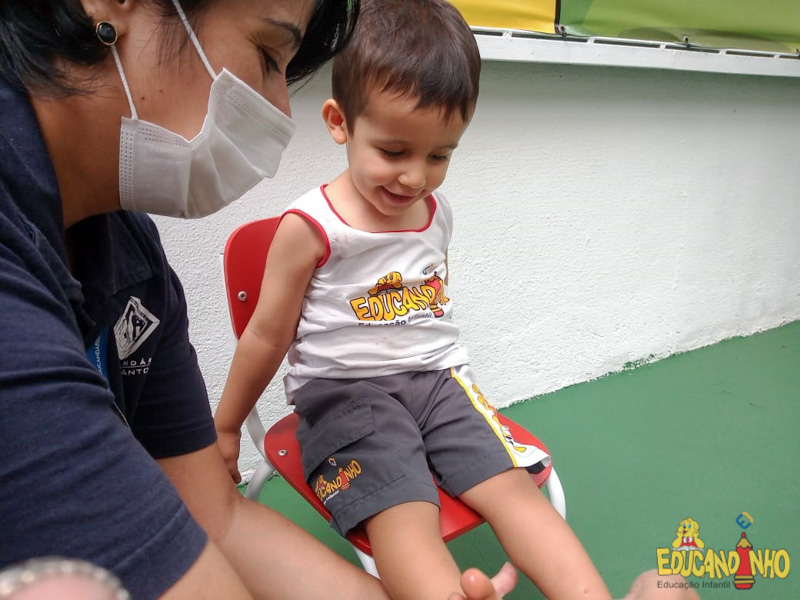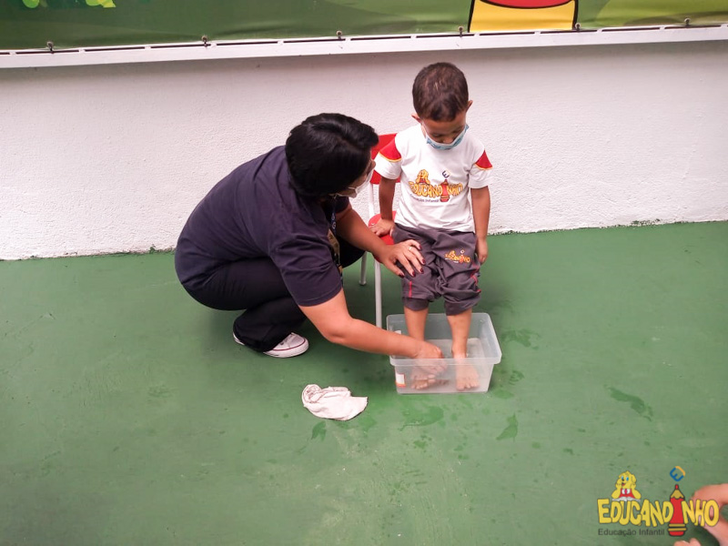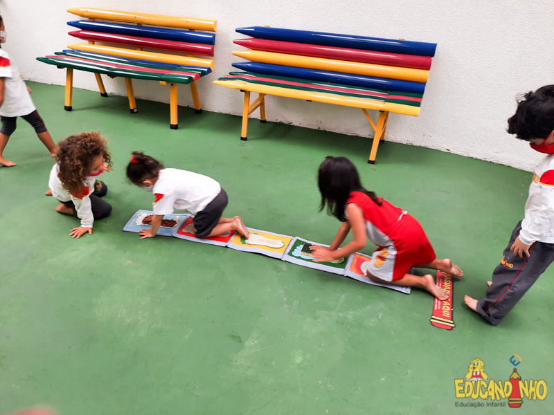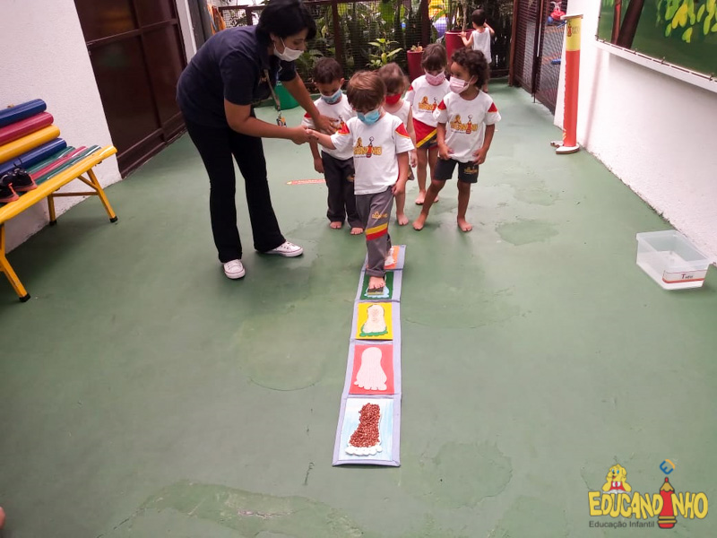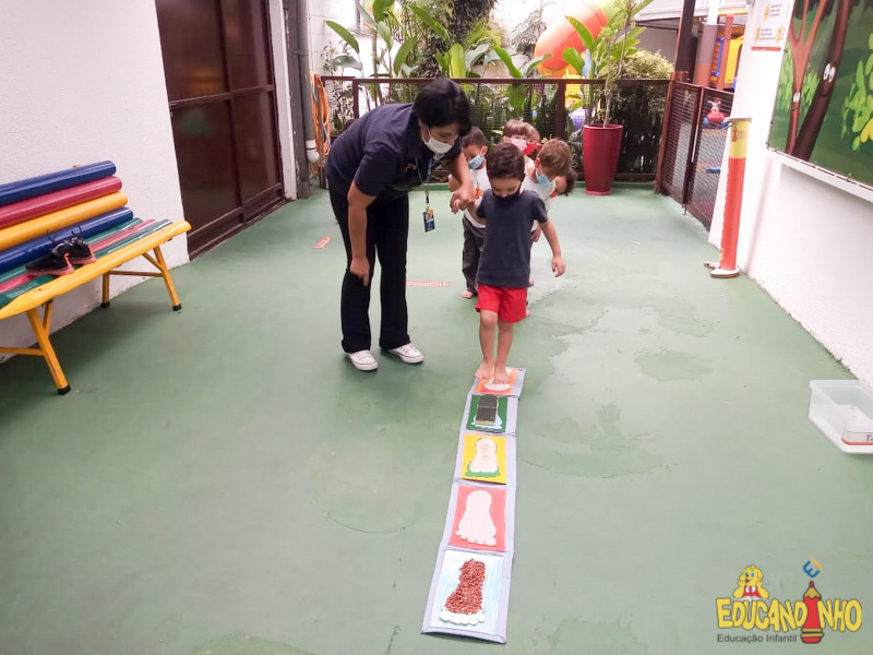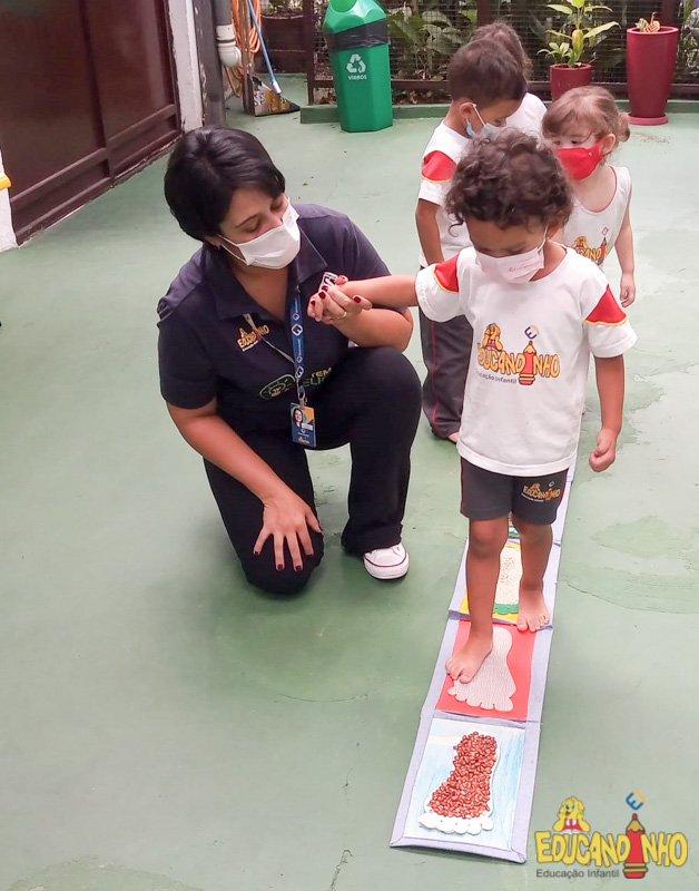 Brincando e aprendendo as crianças do Infantil 2, reconheceram as partes do corpo desenhando-as em papel Kraft. Depois, andaram em um tapete sensorial, para sentir diferentes texturas através dos pés.