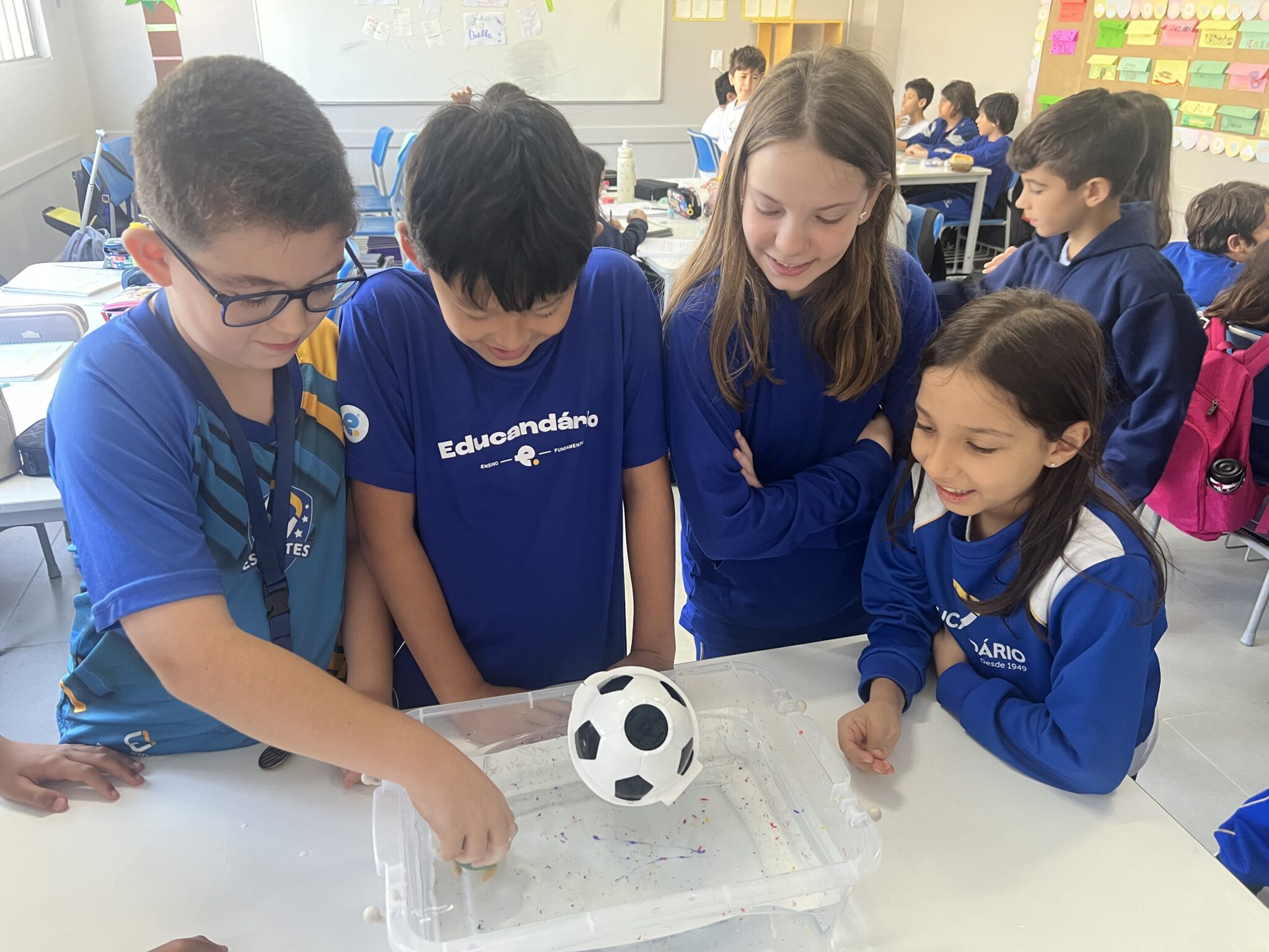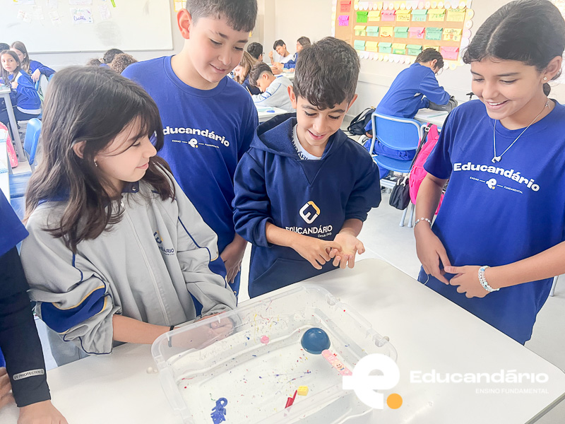 Na aula de Ciências, os alunos do 5º ano participaram de um experimento muito interessante. Cada estudante trouxe de casa um objeto para descobrir se ele flutuaria ou afundaria na água. Durante a atividade, eles observaram atentamente o que acontecia com cada objeto dentro do recipiente com água, levantando hipóteses e comparando resultados.