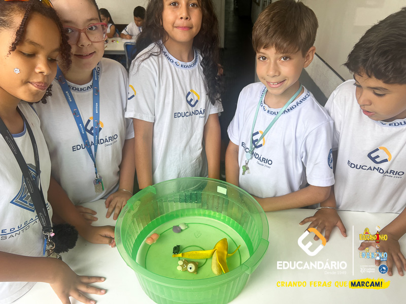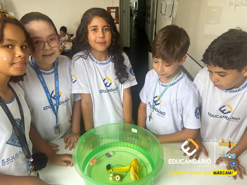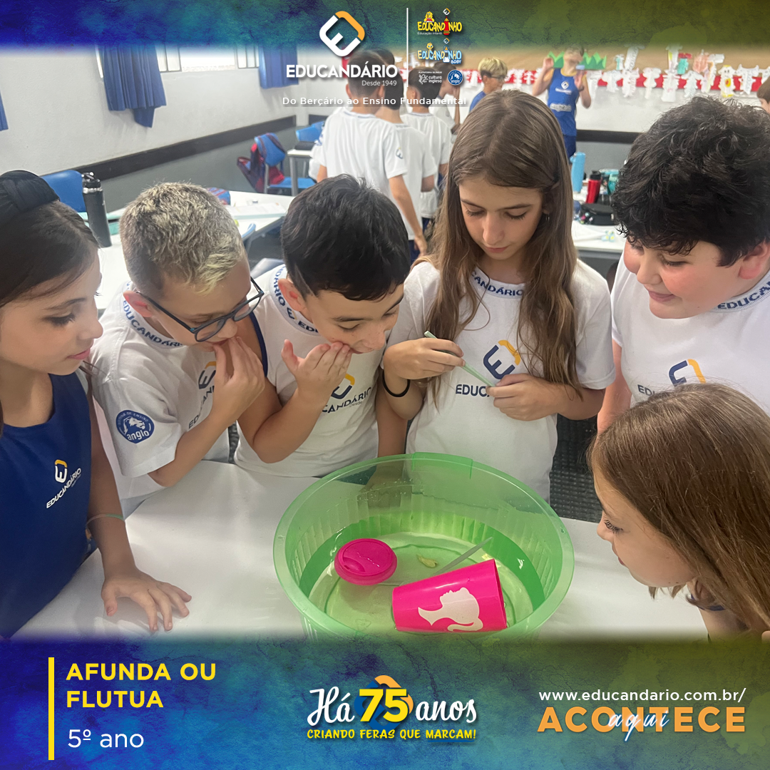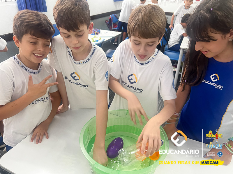 Os alunos trouxeram objetos de casa e testaram se eles iriam afundar ou flutuar, com isso aprenderam sobre a densidade dos objetos.