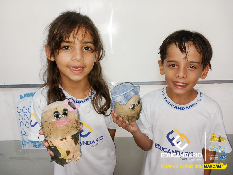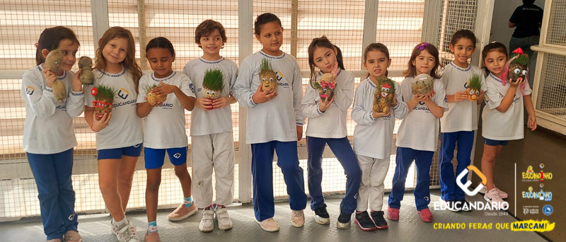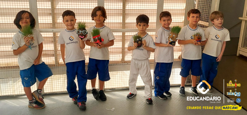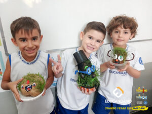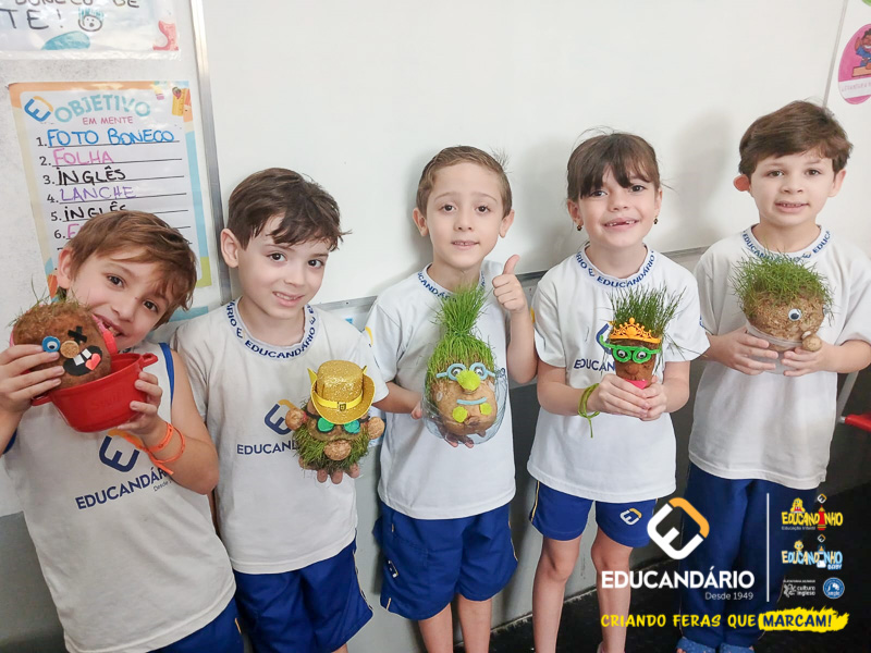 Com os bonecos de alpiste, puderam acompanhar cada etapa do crescimento e ainda soltaram a criatividade personalizando seus novos amiguinhos verdes.