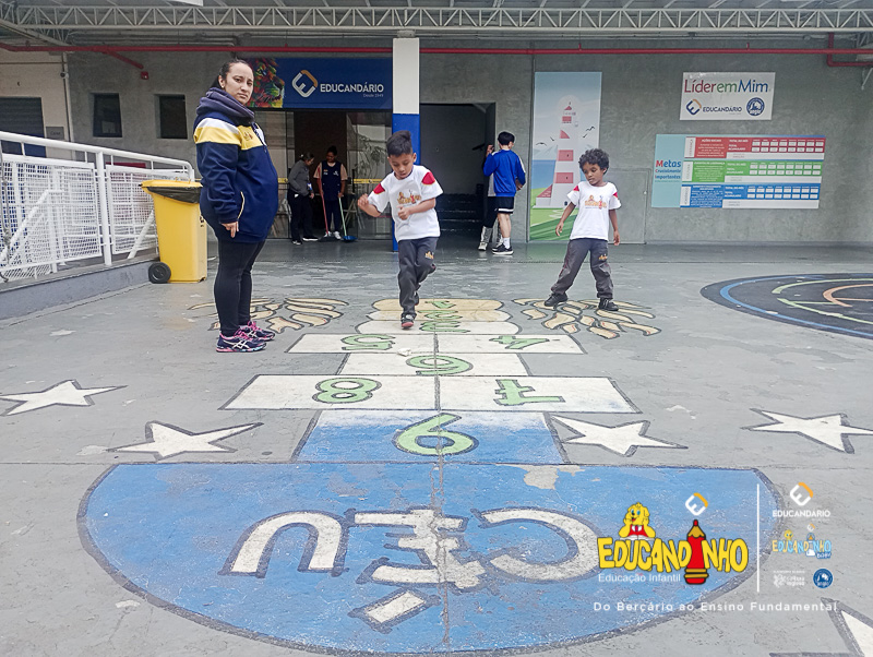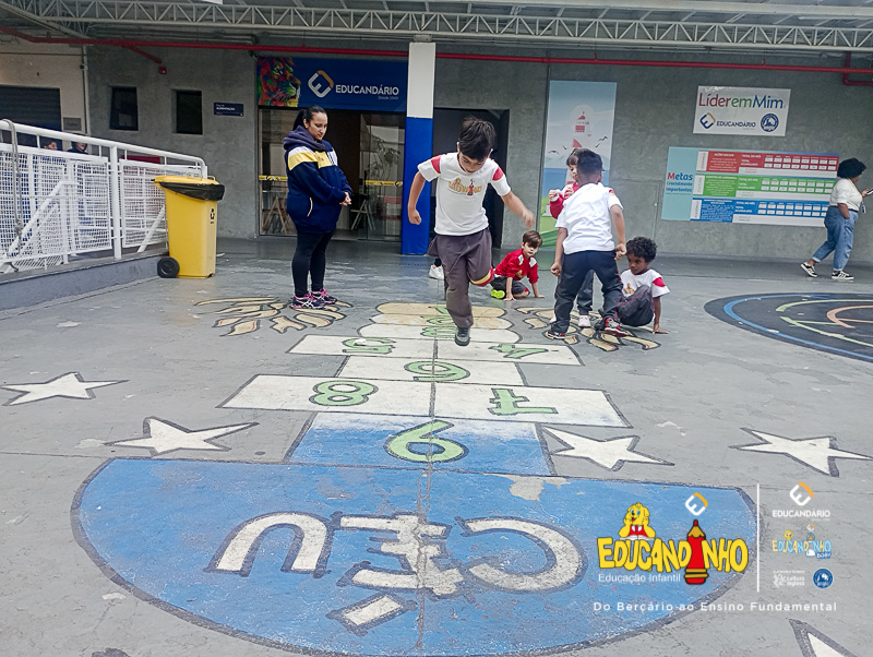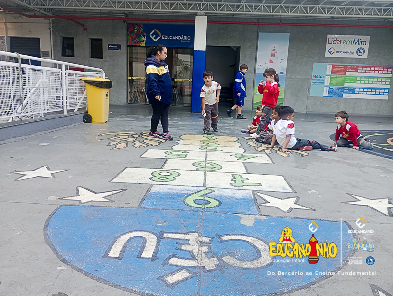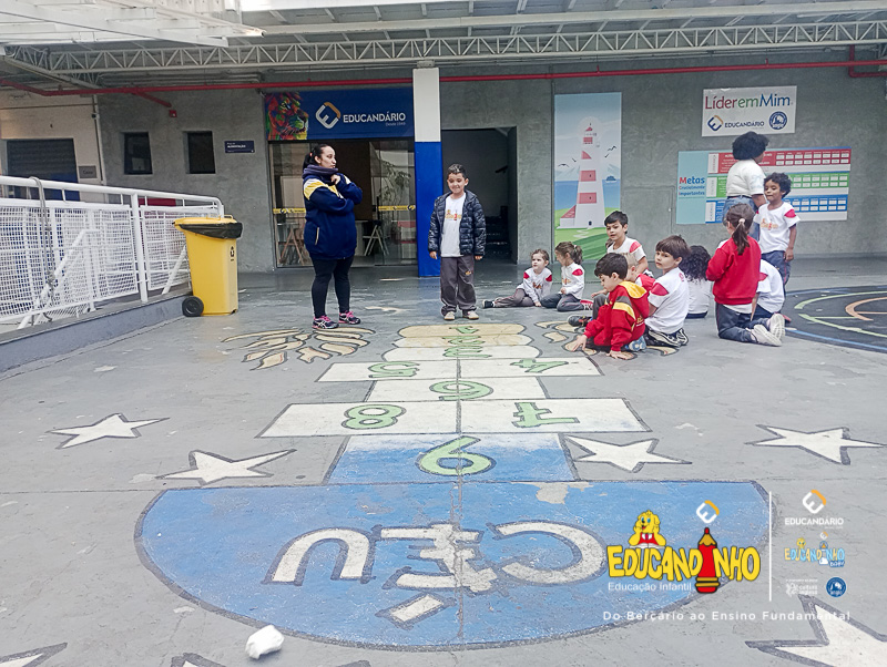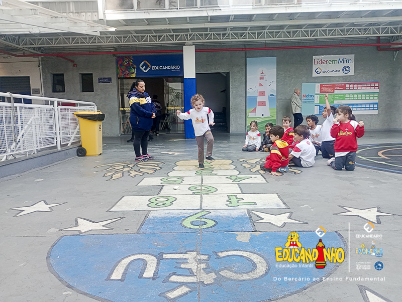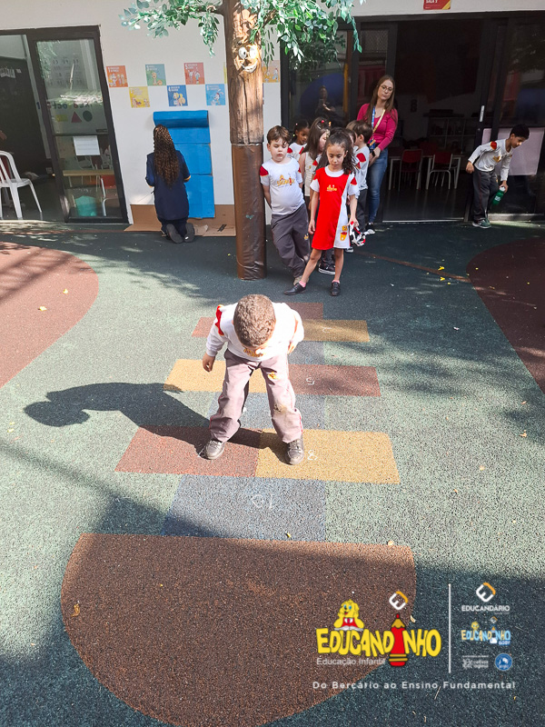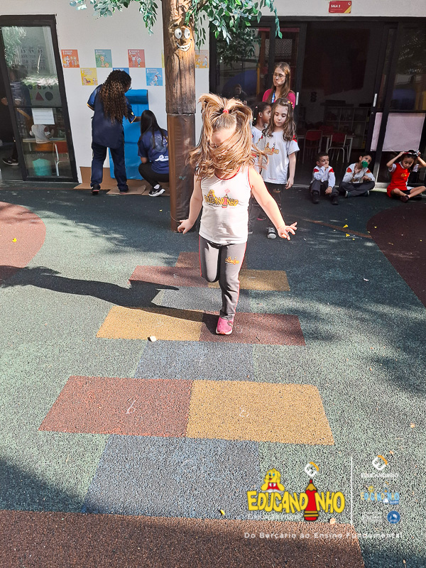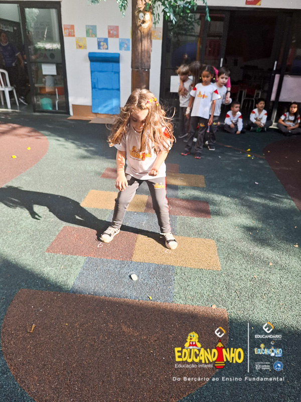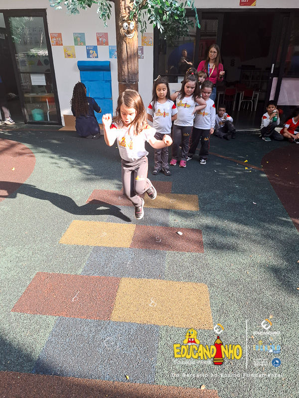 A amarelinha é uma brincadeira muito divertida! As crianças pulam com um pé só e depois com os dois, seguindo os números desenhados no chão. Além de se divertirem, as crianças aprendem a contar, equilibrar o corpo e trabalhar a coordenação motora. É uma forma alegre de brincar e aprender ao mesmo tempo!