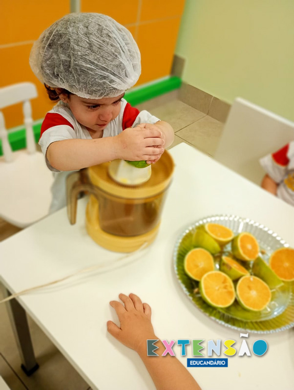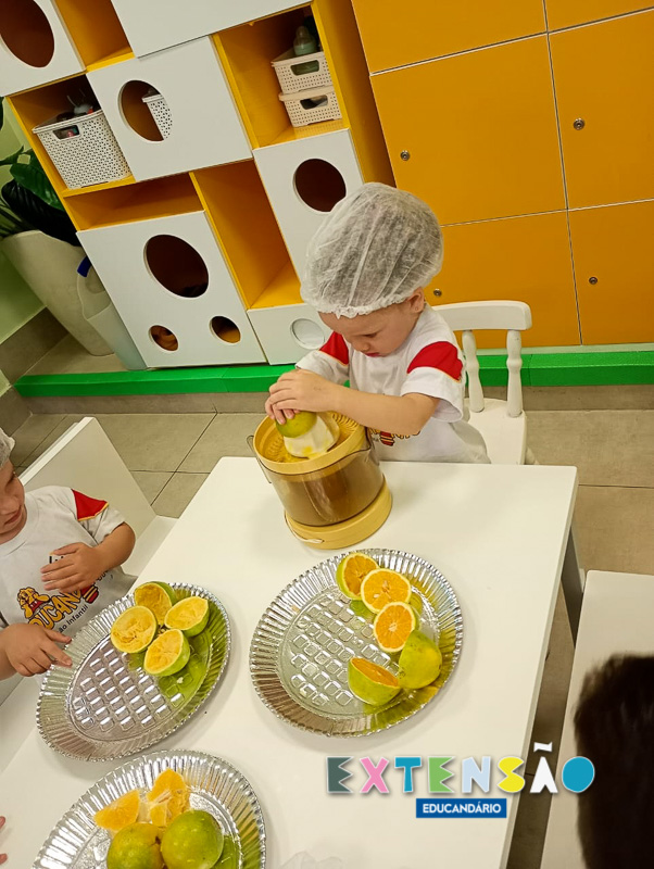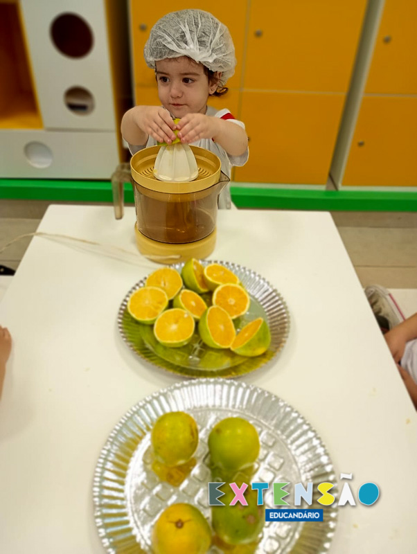 Observaram a fruta, a casca, o caroço, sentiram a textura, ajudaram a espremer com o processador e… claro, também comeram a laranja!