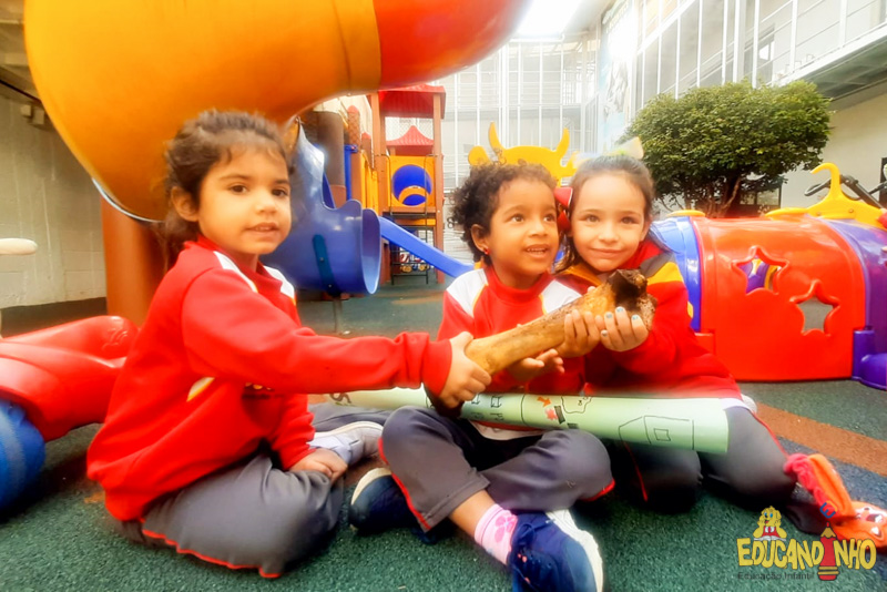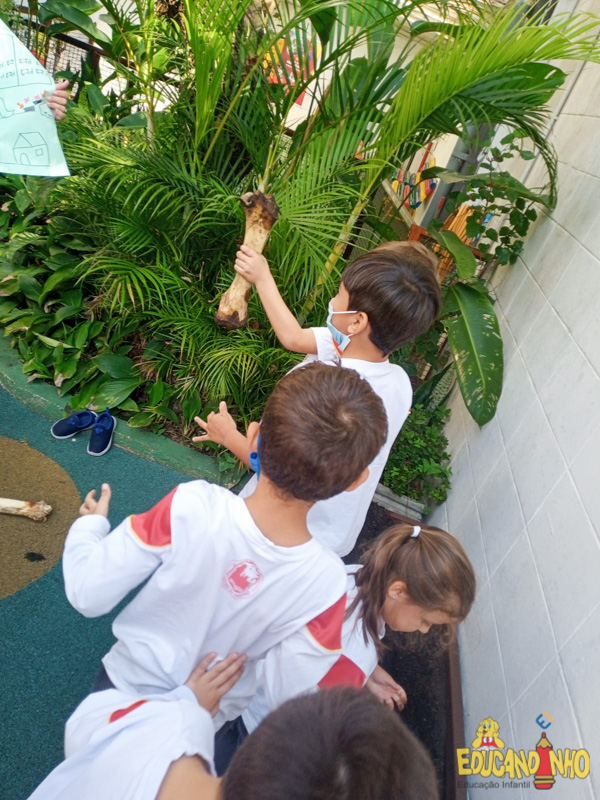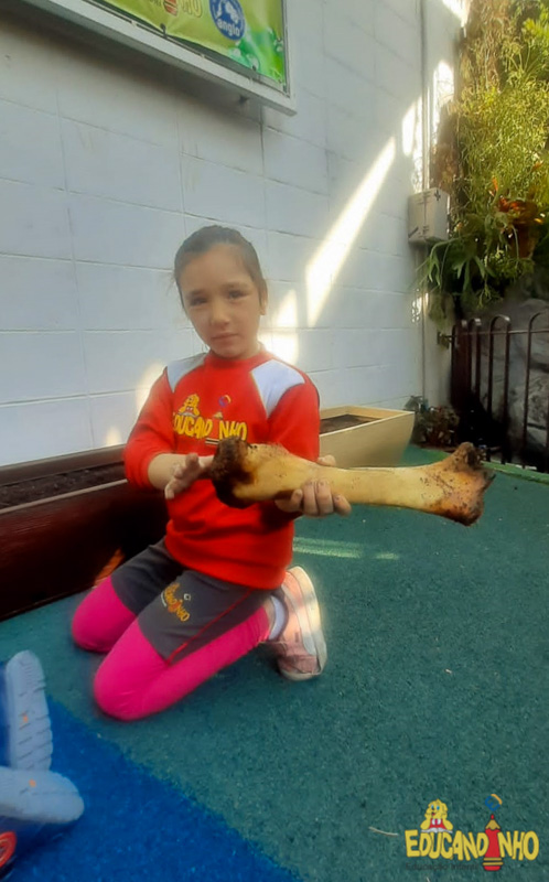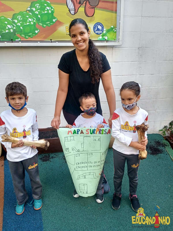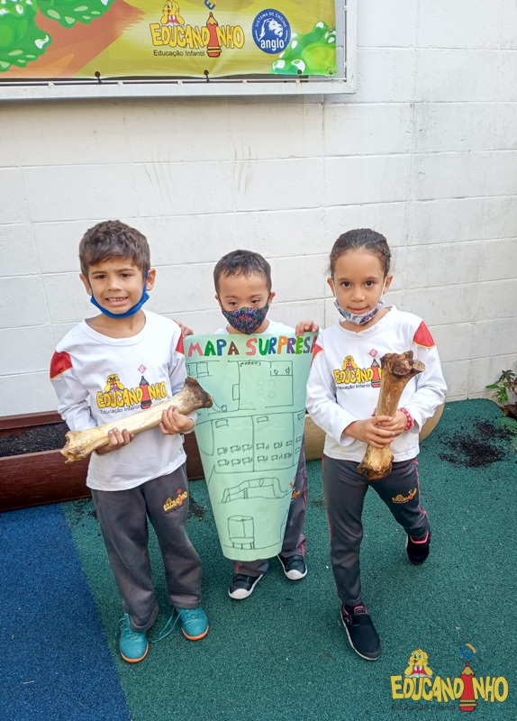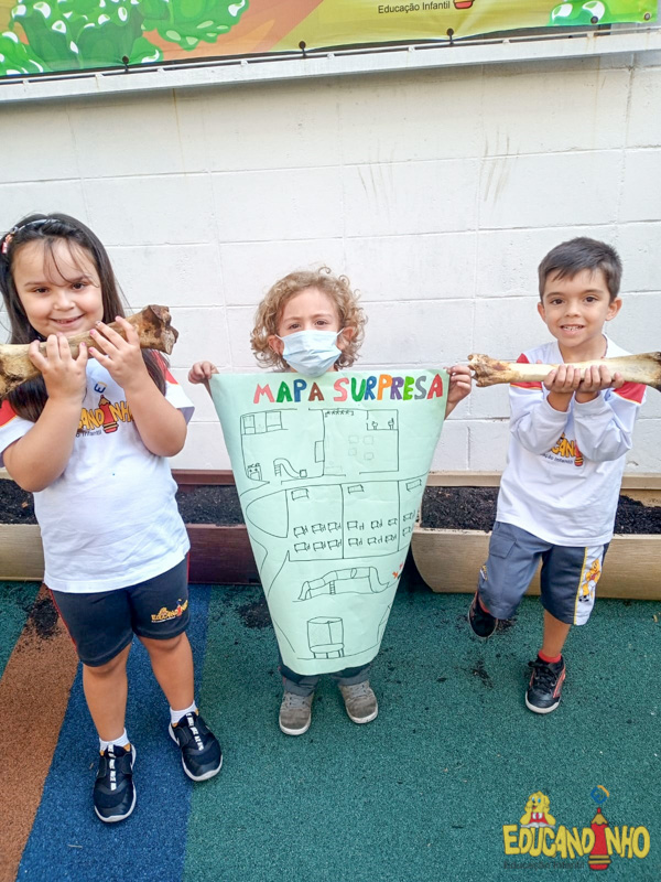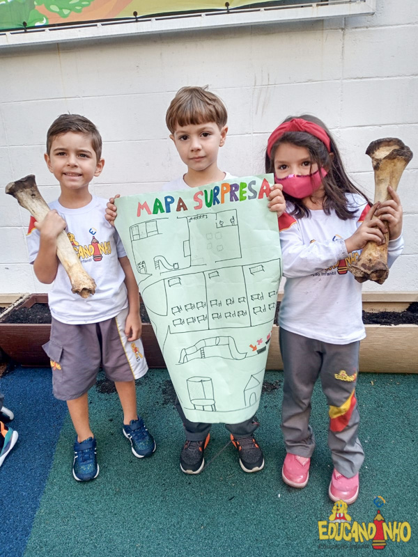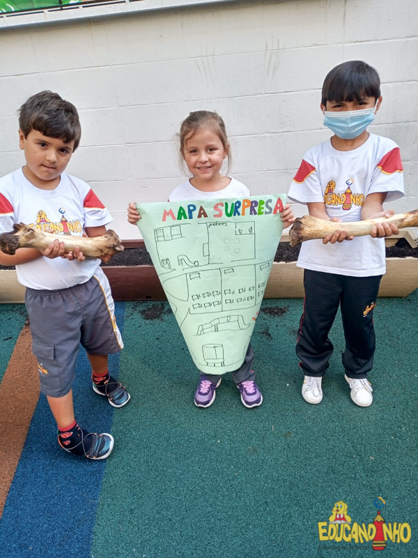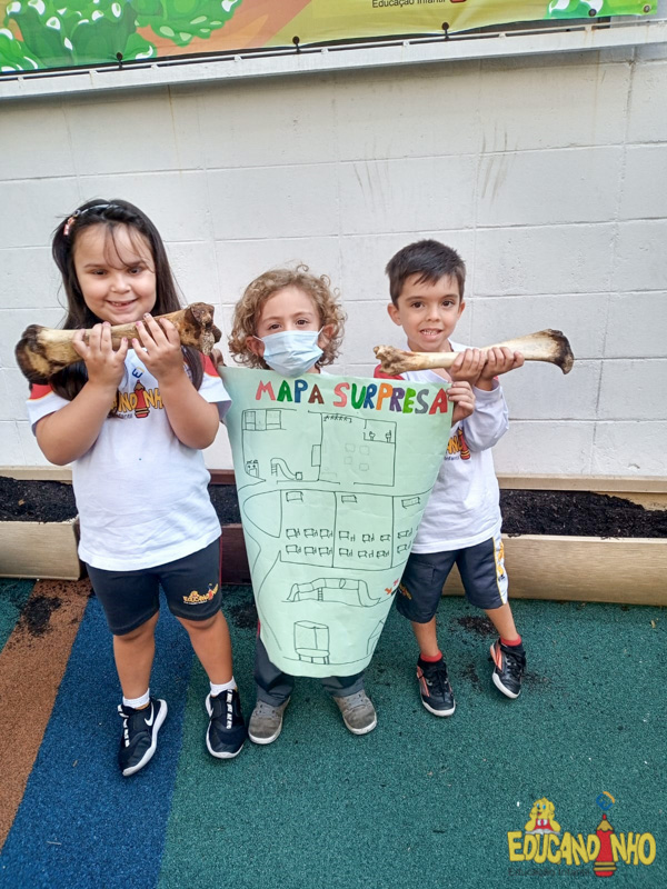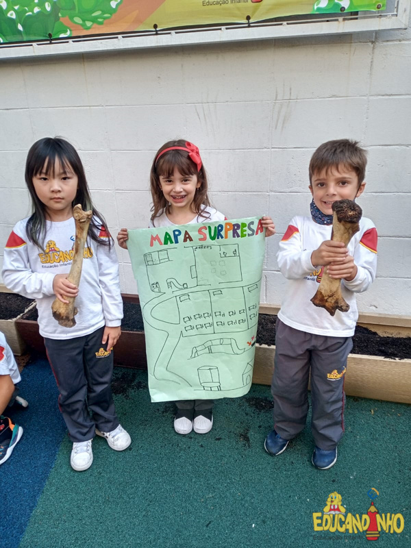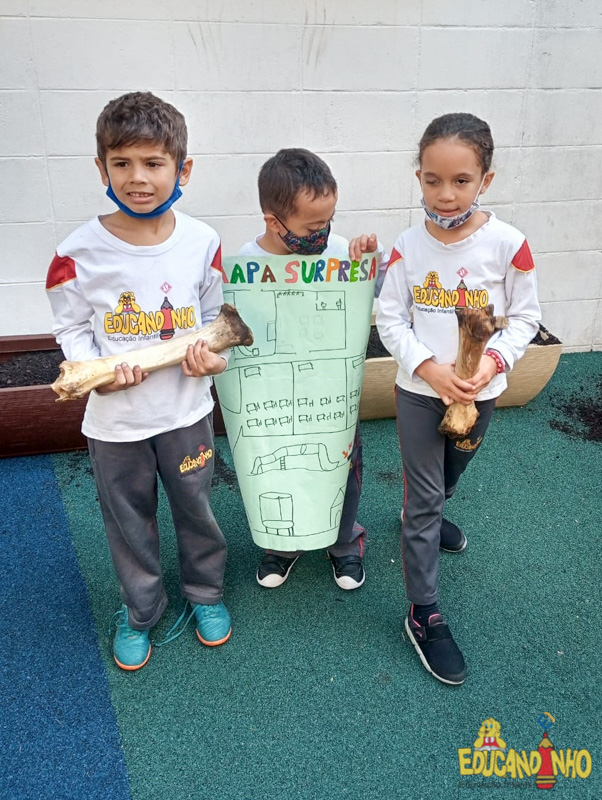 Depois de conhecer a história “A Incrível Descoberta“, a nossa turma embarcou em uma grande caça preparada pelo Eduzinho. Ao chegarem na sala, encontraram uma mensagem do nosso mascote dizendo que teriam que encontrar uma surpresa. E para isto, seria necessário seguir o mapa que estava escondido. Depois que desvendarem a charada, encontraram o mapa na brinquedoteca, e foi assim que a grande brincadeira começou. Seguiram o mapa até a parte indicada e depois uma escavação. Nossos pequenos paleontólogos encontraram dois grandes ossos. Agora teremos que descobrir de que dinossauro pertencem esses ossos, você arrisca um palpite?