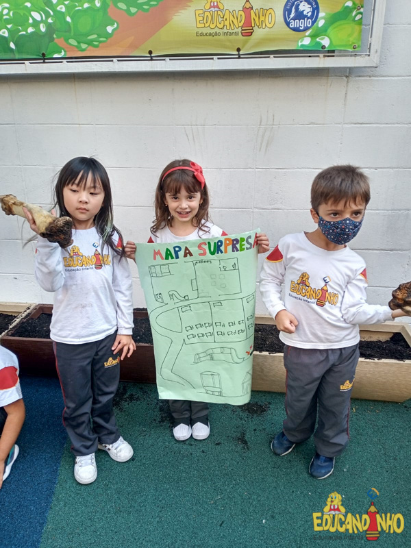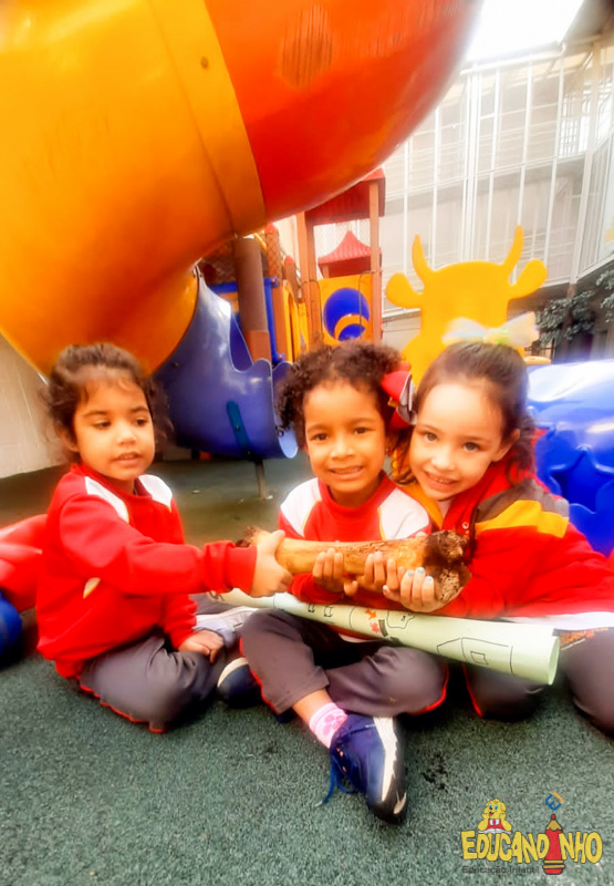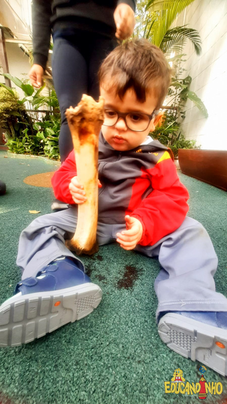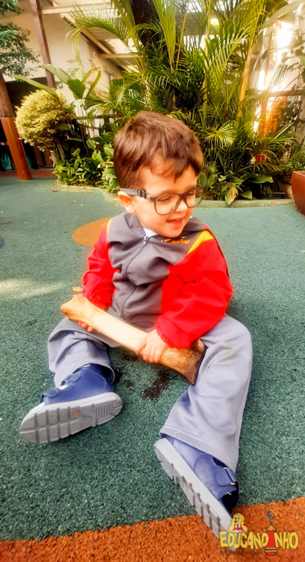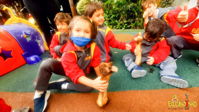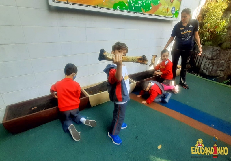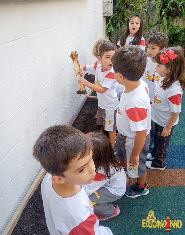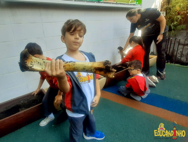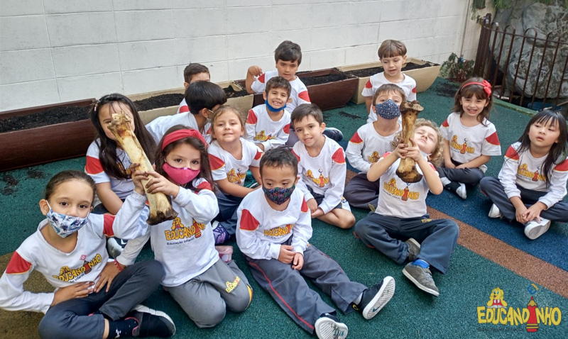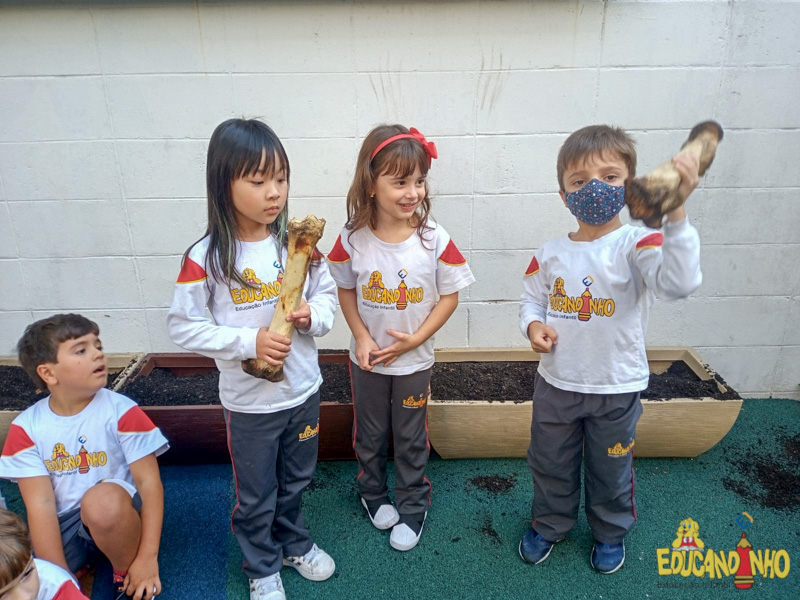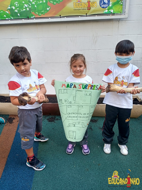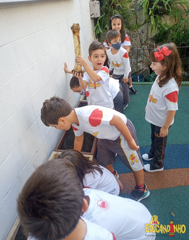Depois de conhecer a história “A Incrível Descoberta“, a nossa turma embarcou em uma grande caça preparada pelo Eduzinho. Ao chegarem na sala, encontraram uma mensagem do nosso mascote dizendo que teriam que encontrar uma surpresa. E para isto, seria necessário seguir o mapa que estava escondido. Depois que desvendarem a charada, encontraram o mapa na brinquedoteca, e foi assim que a grande brincadeira começou. Seguiram o mapa até a parte indicada e depois uma escavação. Nossos pequenos paleontólogos encontraram dois grandes ossos. Agora teremos que descobrir de que dinossauro pertencem esses ossos, você arrisca um palpite?