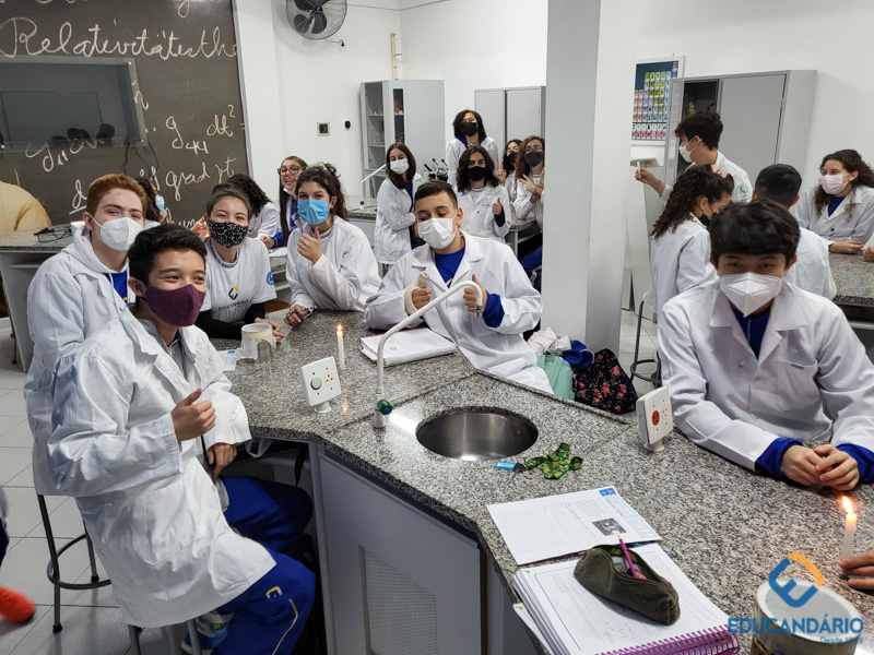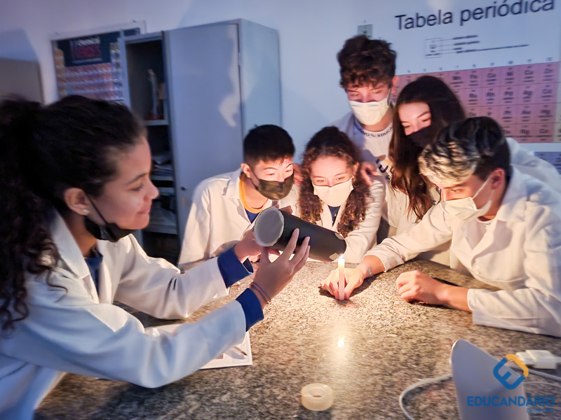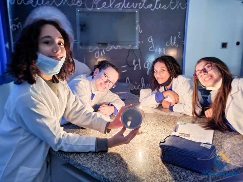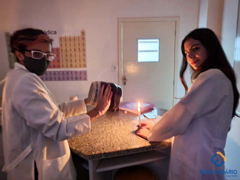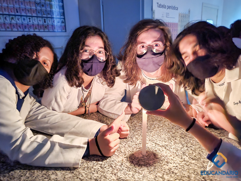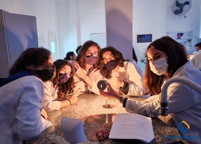 As câmeras fotográficas atuais foram possíveis graças a um conceito chamado de câmara escura. Os alunos do 9º ano, através desse experimento, puderam comprovar o princípio da propagação retilínea da luz, onde a luz entra pelo orifício e atinge o anteparo da câmara formando uma imagem invertida. Caso a luz não se propagasse em linha reta, isso não aconteceria e, relacionaram com a imagem que forma na nossa retina e como o nosso cérebro decodifica essa imagem para vermos da forma correta.