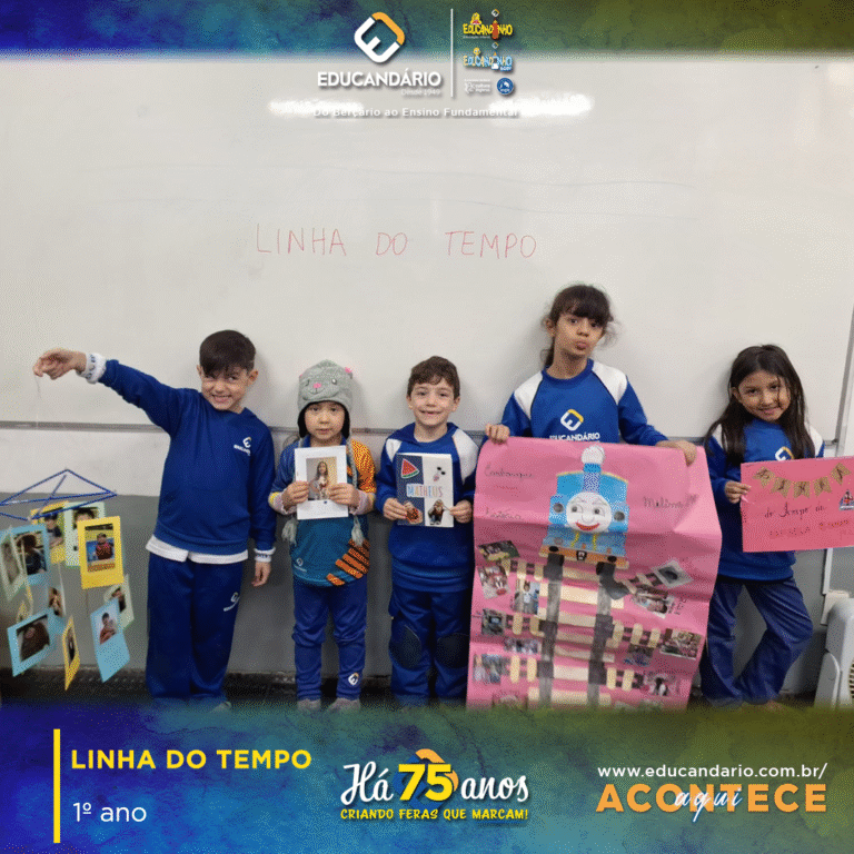 Linha do tempo: Aprendendo com o passado e projetando o futuro! A linha do tempo é uma ferramenta essencial para compreender a sequência dos acontecimentos e suas conexões. Os alunos dos primeiros anos exploraram esse conceito a partir de suas próprias trajetórias pessoais, desenvolvendo habilidades como organização cronológica, interpretação de