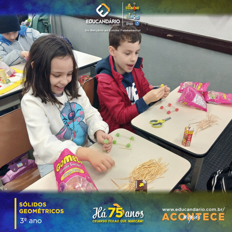 Os alunos dos 3⁰A e B participaram de uma atividade divertida e educativa sobre sólidos geométricos. Eles usaram balas de goma e palitos de dente para montar modelos que representam diferentes sólidos, como cubos, cilindros e pirâmides. Essa atividade ajudou as crianças a visualizarem e compreenderem melhor as formas tridimensionais