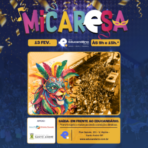 O Educandário convida toda a comunidade do bairro Vila Alpina para participar da nossa MICARESA 2026, que acontecerá no dia 13 de fevereiro de 2026 (sexta-feira). O evento celebra o espírito do Carnaval, promovendo interação, cultura e entusiasmo entre alunos, famílias e vizinhos.