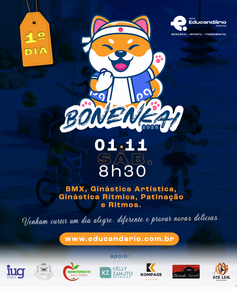 No dia 8 de novembro de 2025, nossa escola abre as portas para o 2º dia do nosso tradicional BONENKAI, um momento em que o talento, o esforço e a alegria dos nossos alunos ganham o centro do palco.Nesse dia, viveremos o verdadeiro espírito esportivo. Teremos apresentações de Judô e Xadrez. Cada