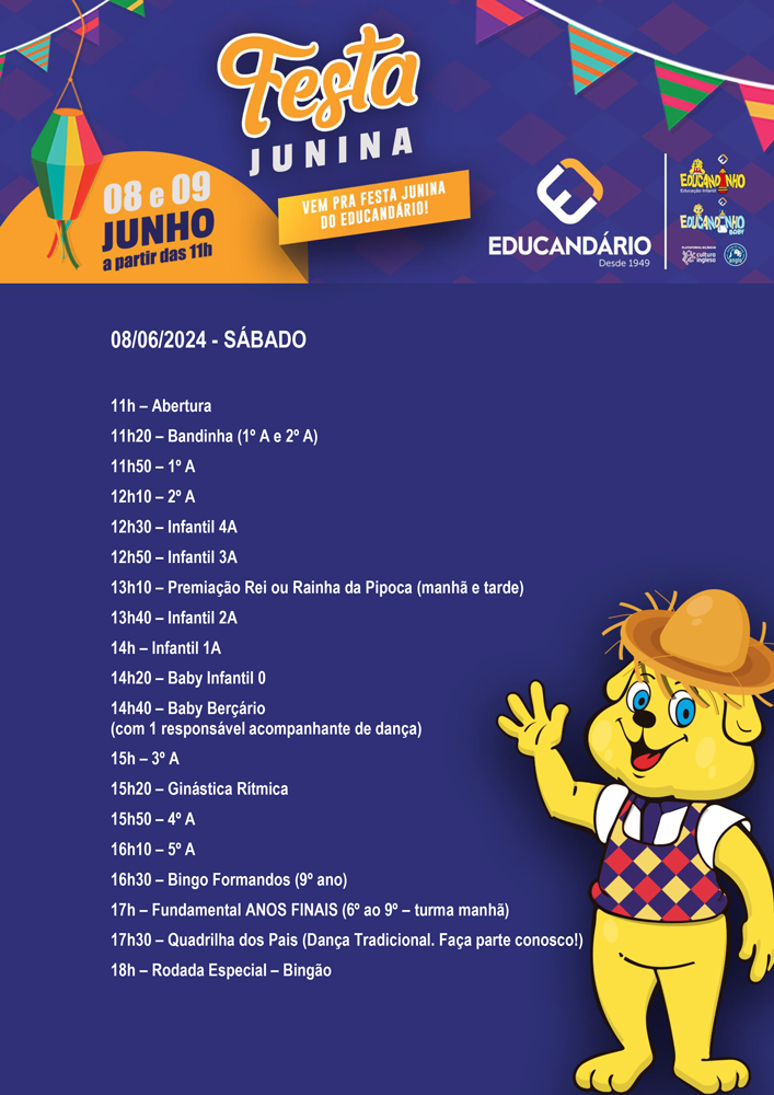 • 08/06 (sábado) – alunos do Berçário, da Educação Infantil e do Ensino Fundamental da manhã. Alunos do Projeto Extra de Ginástica Rítmica (manhã e tarde). Premiação do Rei ou Rainha da Pipoca (Berçário e Infantil – manhã e tarde).