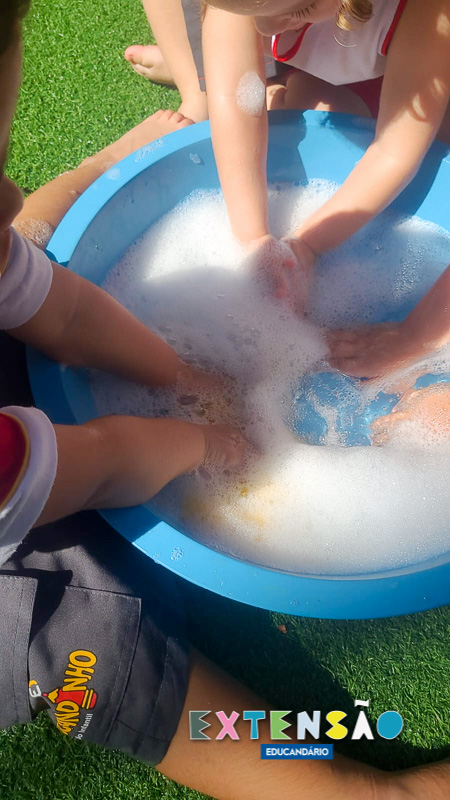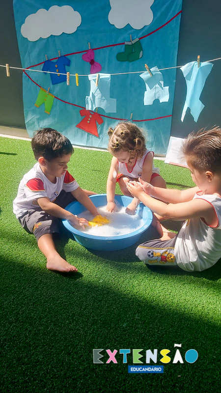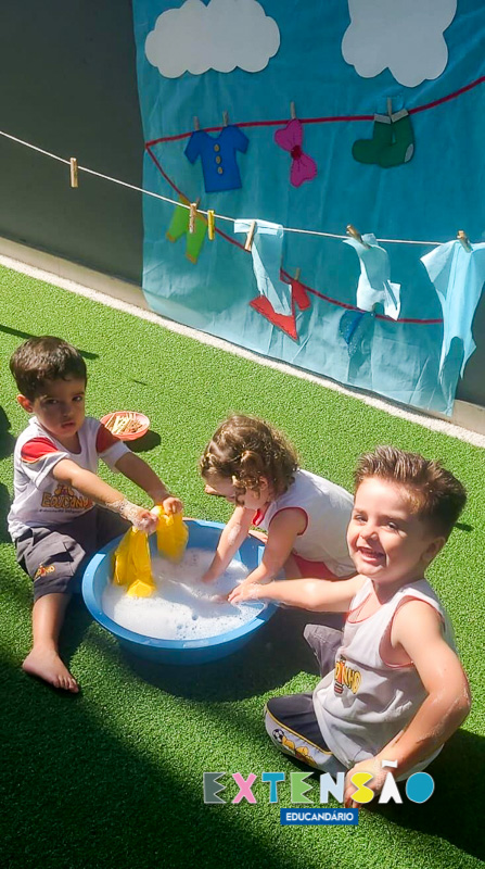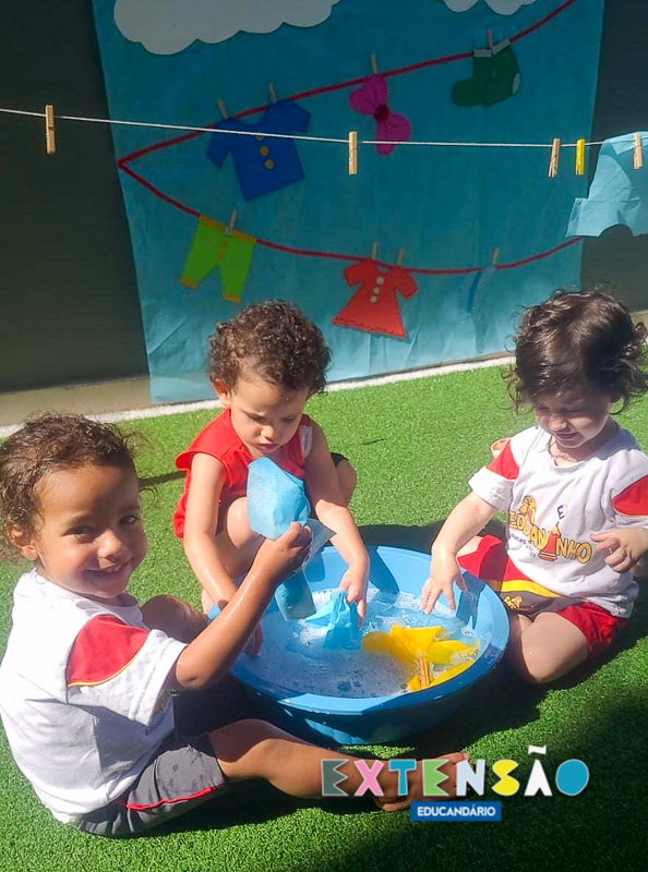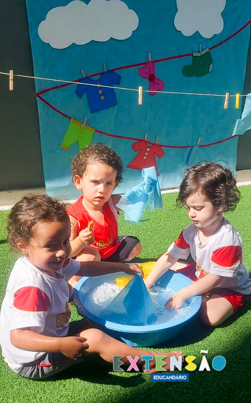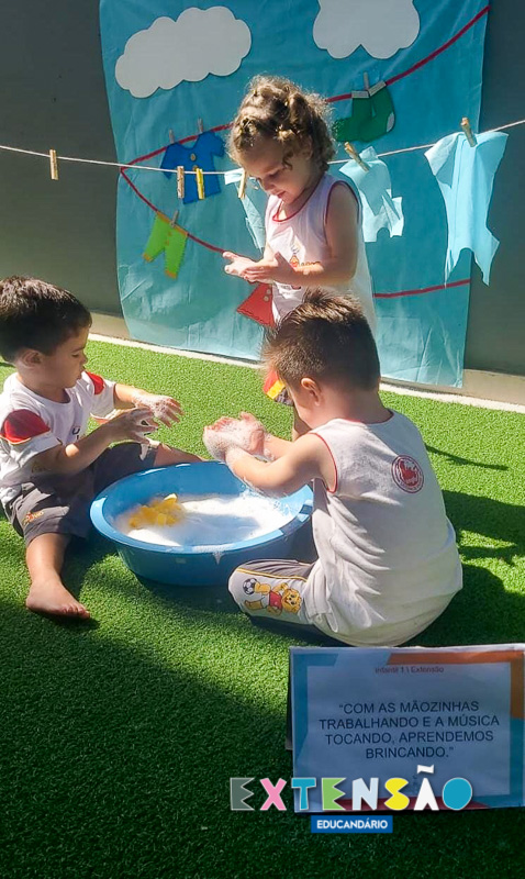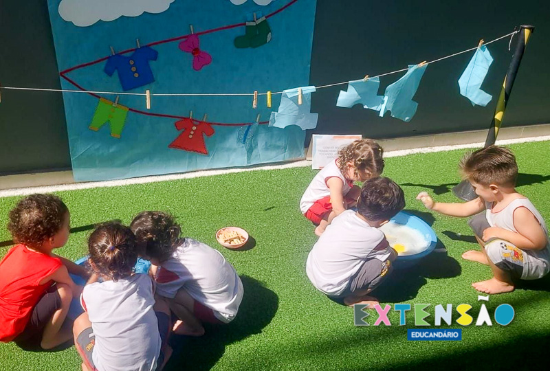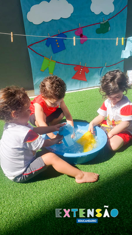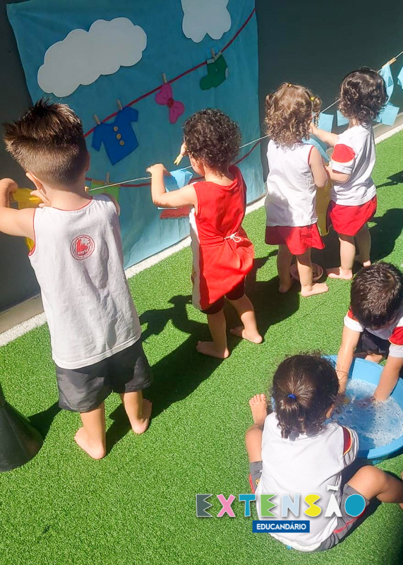No Infantil 1 – Extensão, a diversão e o aprendizado caminham juntos! Ao som da música “Lavando a Roupa”, do Prof. Shauan Bencks, as crianças lavaram seus paninhos com muita dedicação e, concentradas, estenderam-nos para secar.