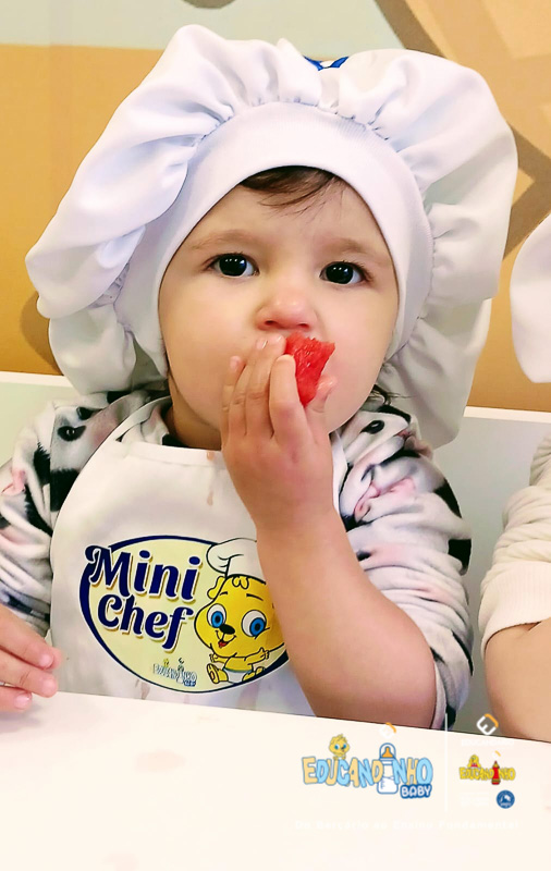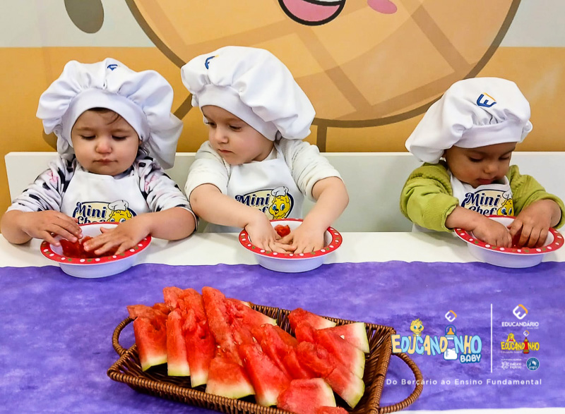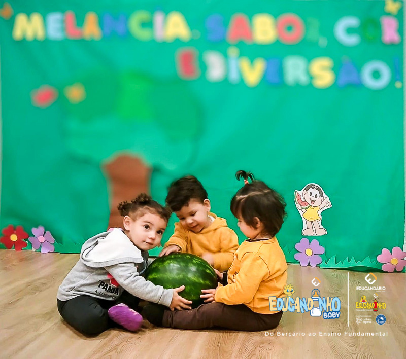 Nossos pequenos exploraram a melancia de um jeito muito especial: tocaram, sentiram, apertaram com as mãozinhas e até prepararam seu próprio suco!