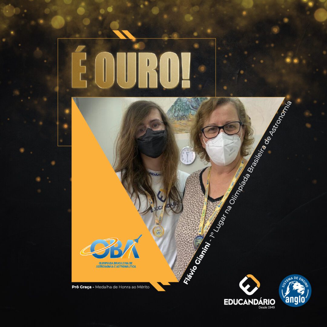 É com muita alegria, que o Educandário-Anglo anuncia o nosso aluno – Flávio Gianini (8º ano A) medalhista de ouro na “OLIMPÍADA BRASILEIRA DE ASTRONOMIA (OBA). E estendemos os agradecimentos à professora – Graça, medalhista de Honra ao Mérito por toda base e estudos realizados. Para termos um ensino campeão, é com base de todo o nosso time pedagógico.