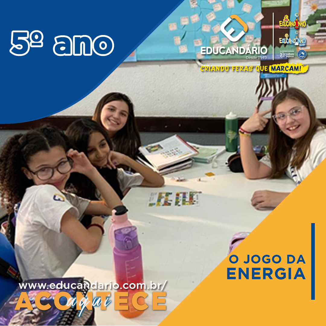 Os alunos do 5º ano estão estudando energias renováveis, sustentáveis e limpas, além das energias não renováveis e suas consequências no meio ambiente, para, no futuro próximo, entender como ajudar a sociedade. A atividade incluiu um jogo que trouxe curiosidades sobre aparelhos que usamos em casa, mostrando quanto consomem e dicas de economia de energia. Quem sabe eles farão a diferença num futuro bem próximo?
