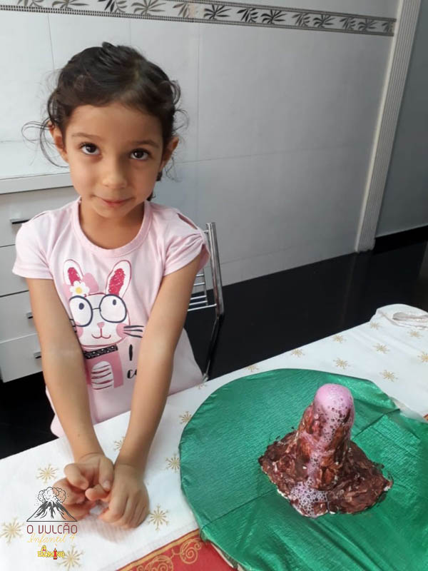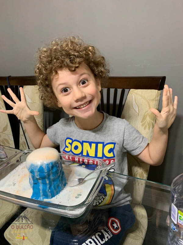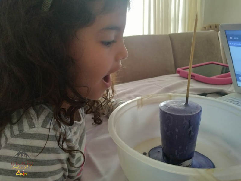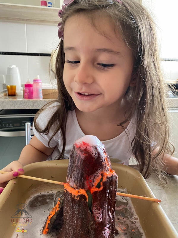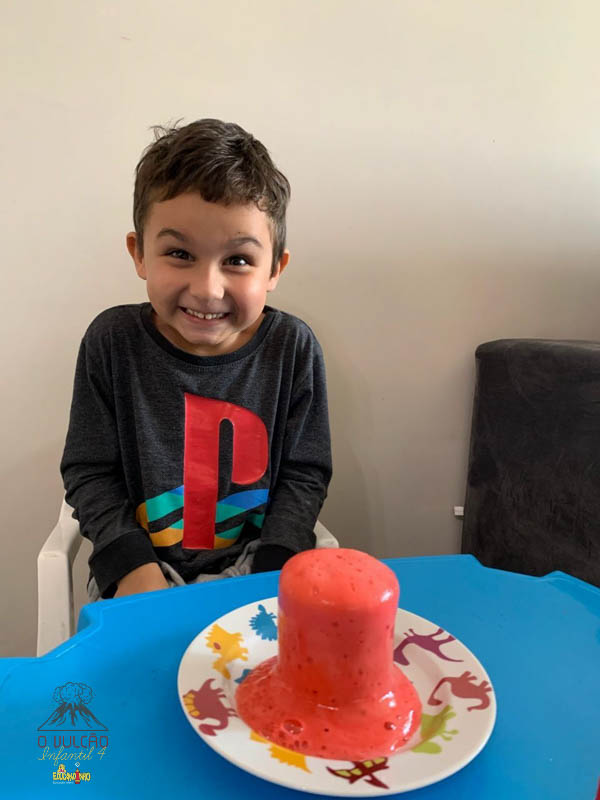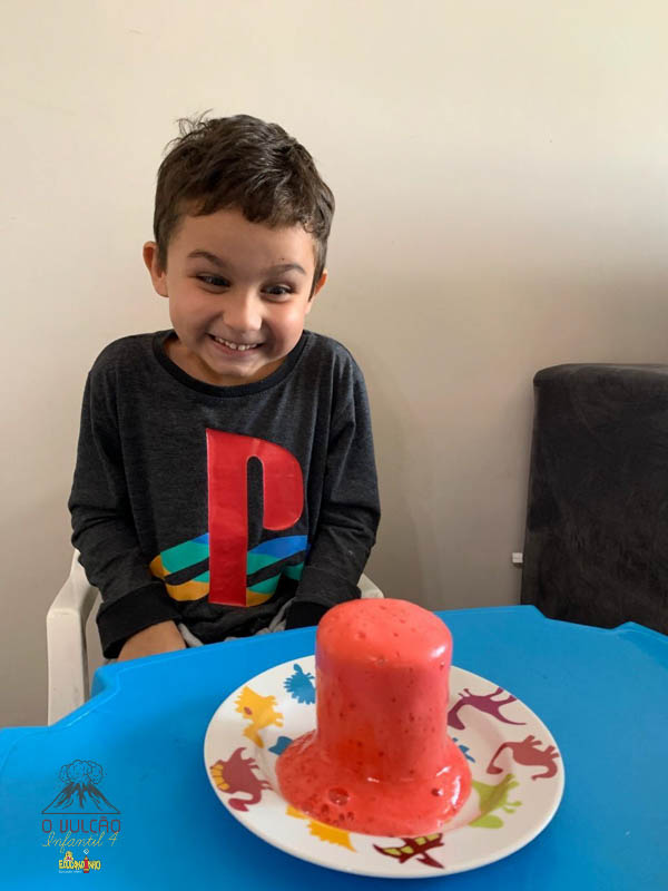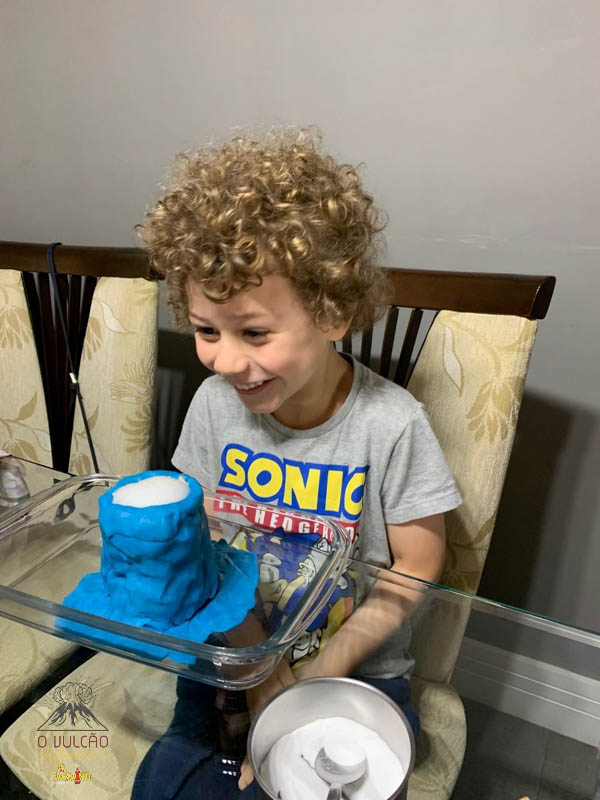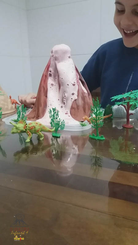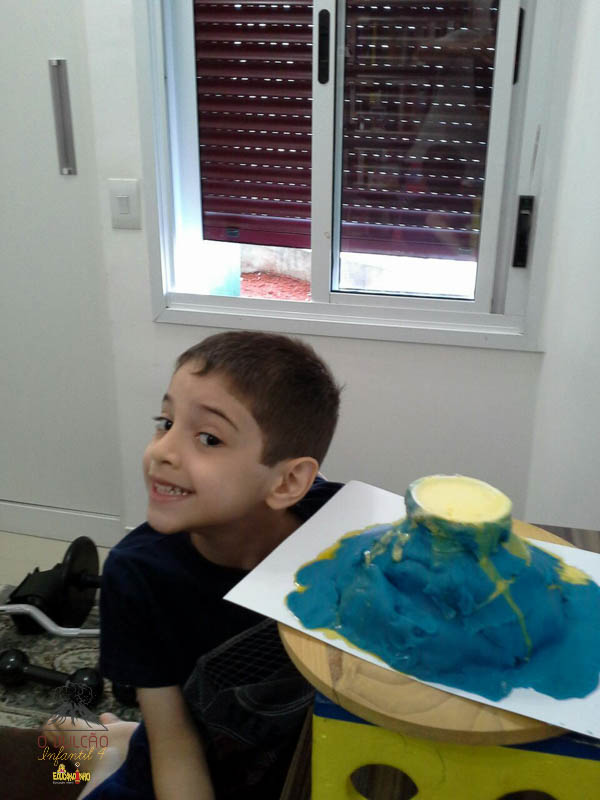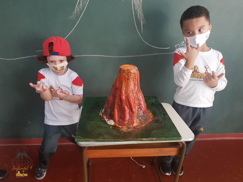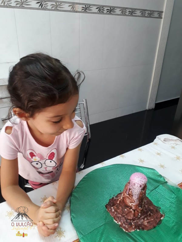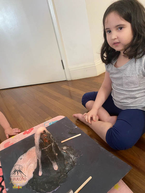 emoção de um vulcão em erupção, com a simulação que aconteceu na sala de aula e também na aula on-line.