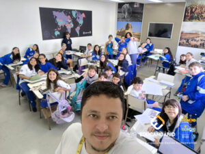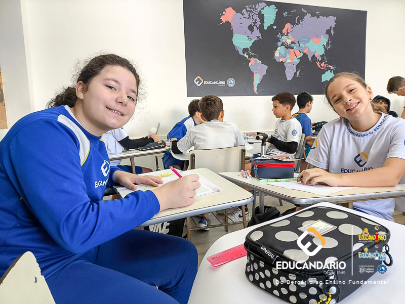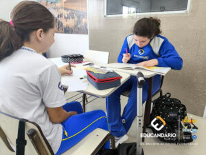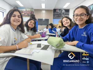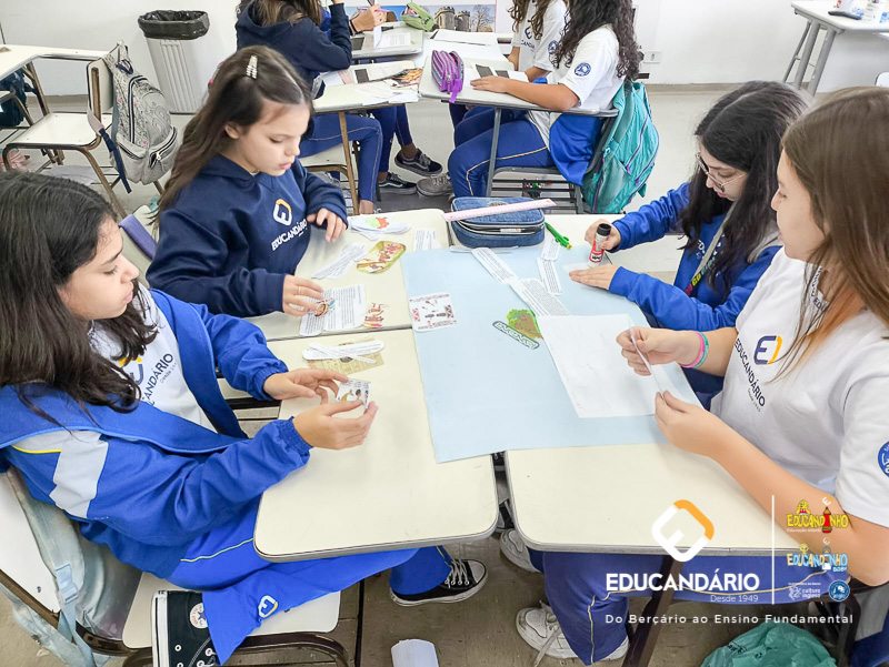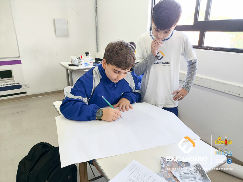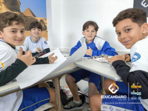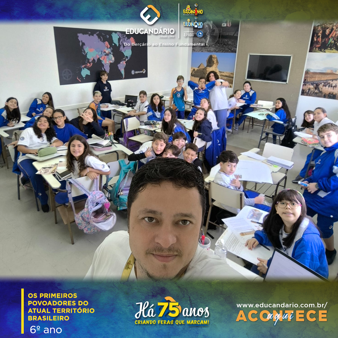 Na aula de História, sob a orientação do professor Ednaldo, os alunos do 6º ano A estão desenvolvendo uma atividade em grupo sobre os primeiros povoadores do território que hoje corresponde ao Brasil. Os estudantes trouxeram pesquisas realizadas em casa, imagens ilustrativas e, com base nesse material, produziram cartazes temáticos. Ao longo da atividade, também realizaram a leitura dos textos pesquisados e elaboraram resumos interpretativos, exercitando habilidades como análise crítica, síntese de informações e trabalho em equipe.