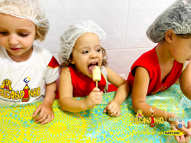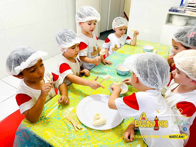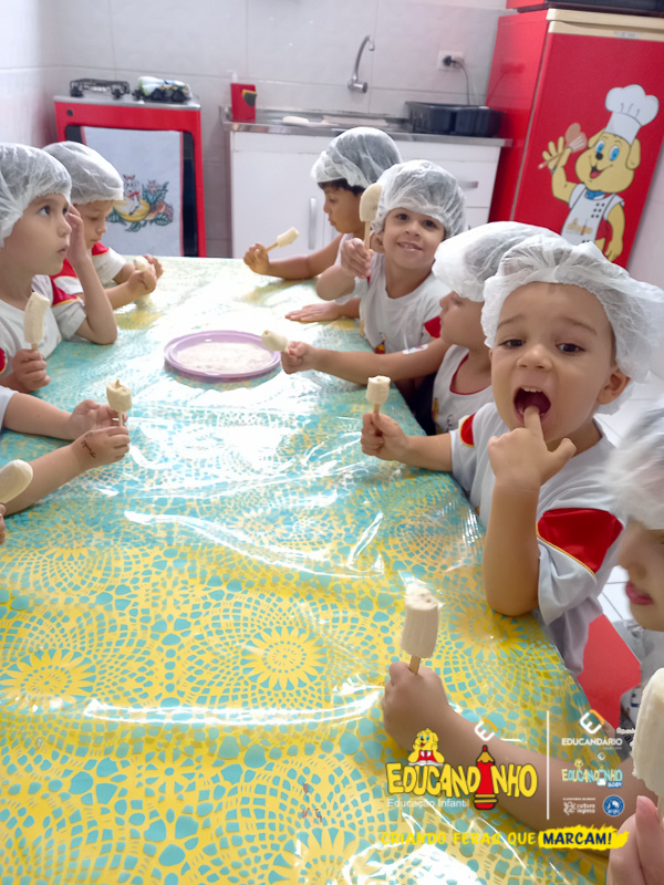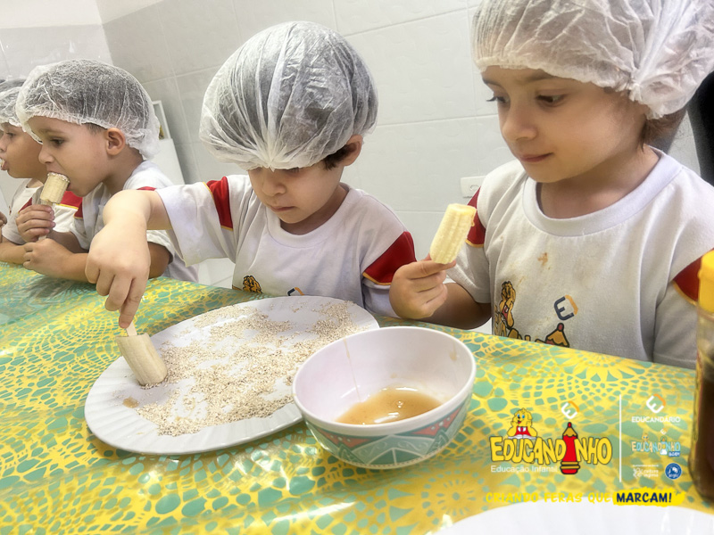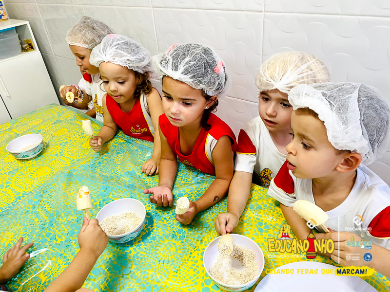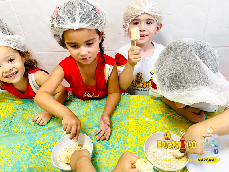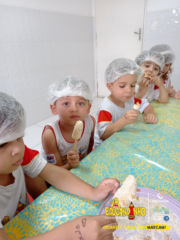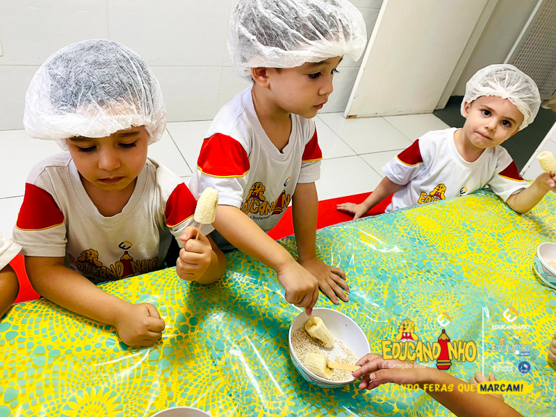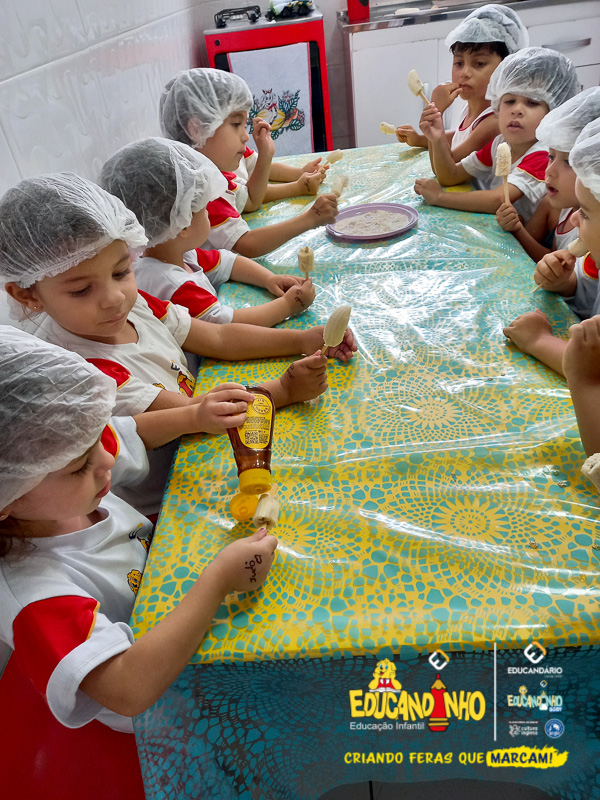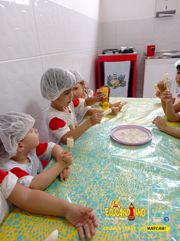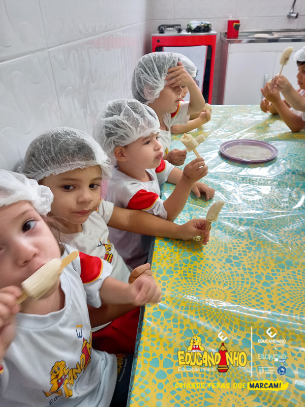 Hoje as crianças do Infantil 2 se transformaram em pequenos chefs e participaram de uma atividade deliciosa e saudável: a criação de picolés de banana com aveia e mel!