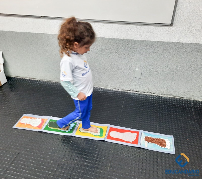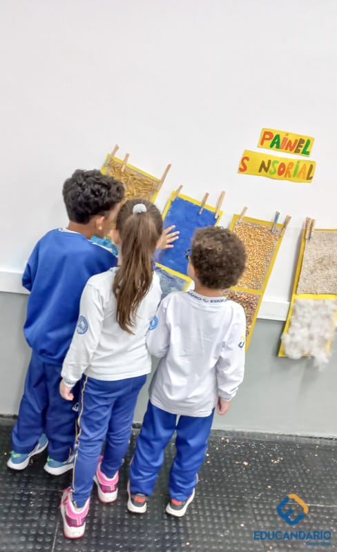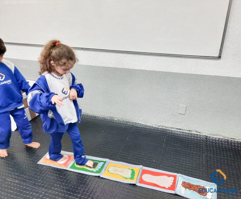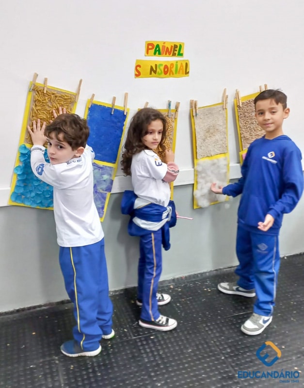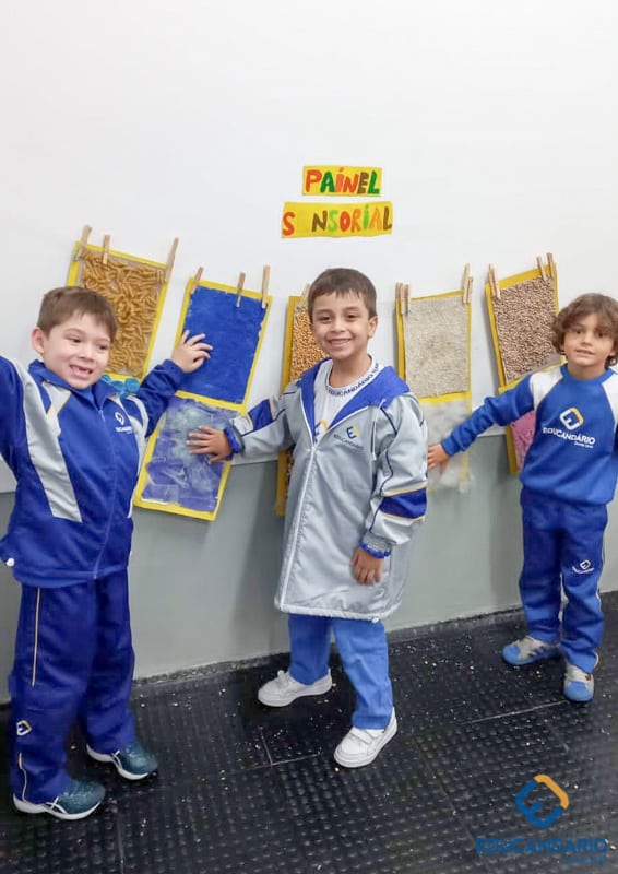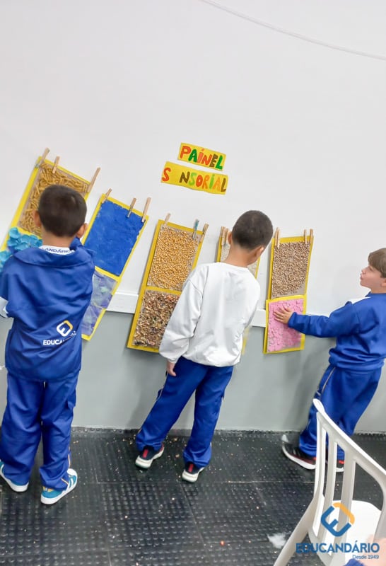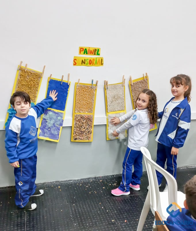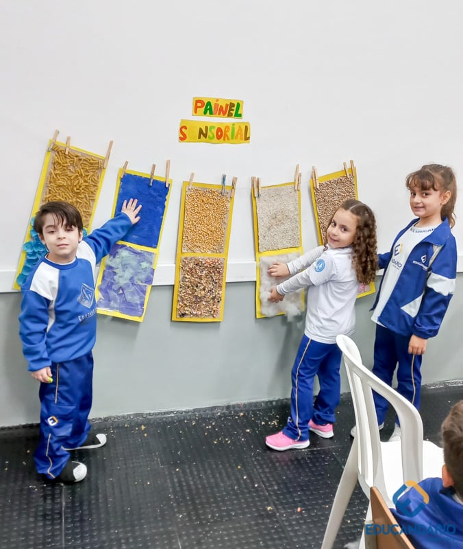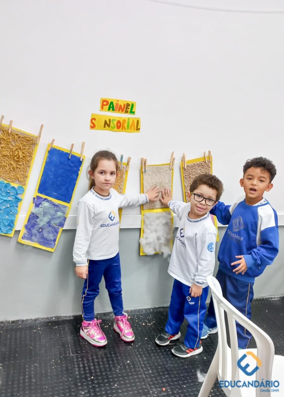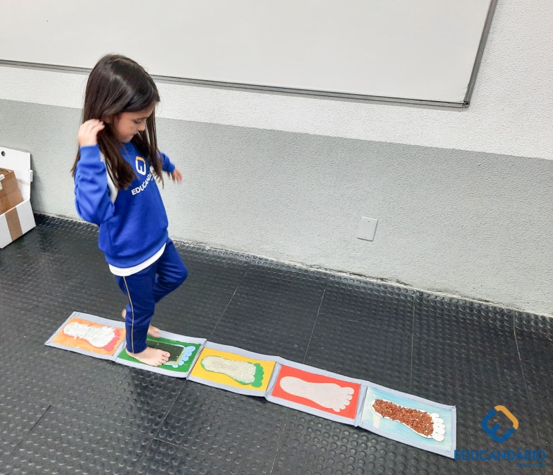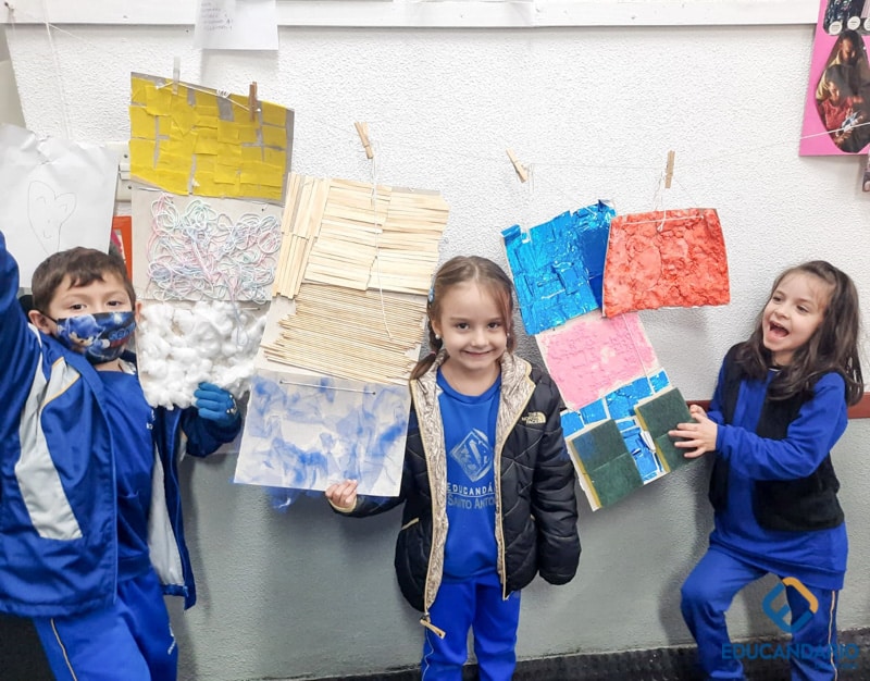 Brincando de sentir as mãos e os pés, o 1º ano confeccionou uma parede sensorial,