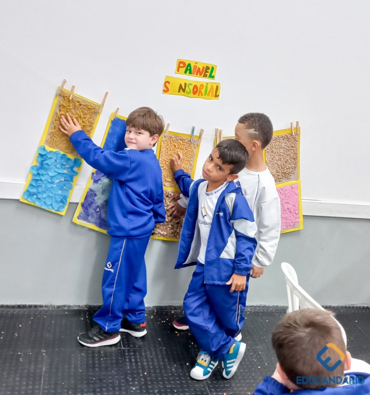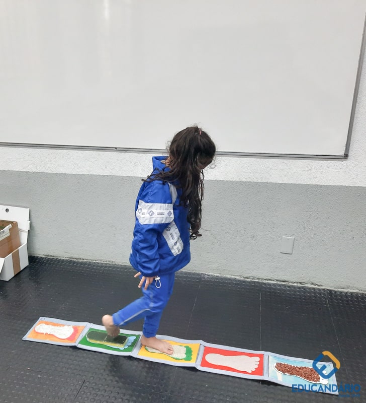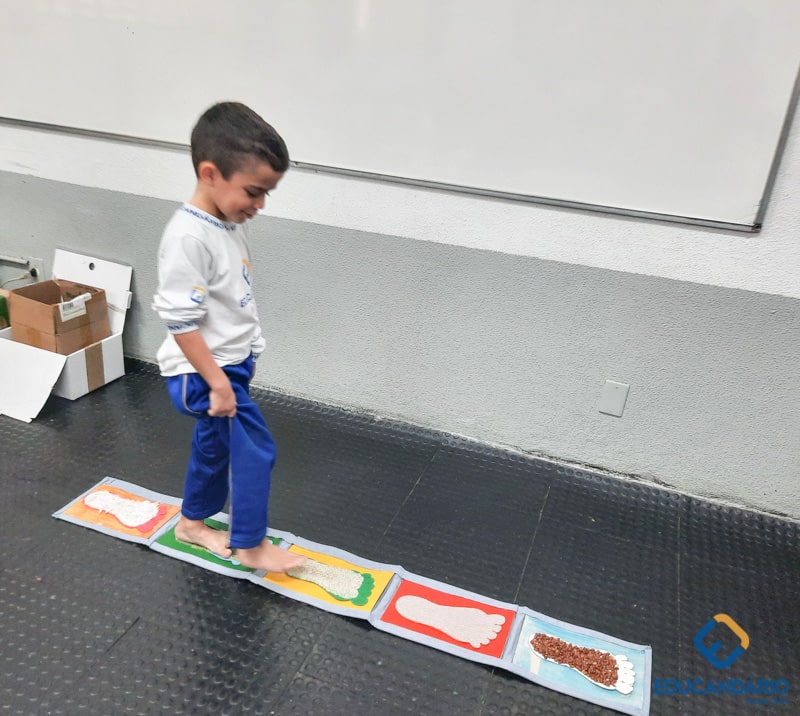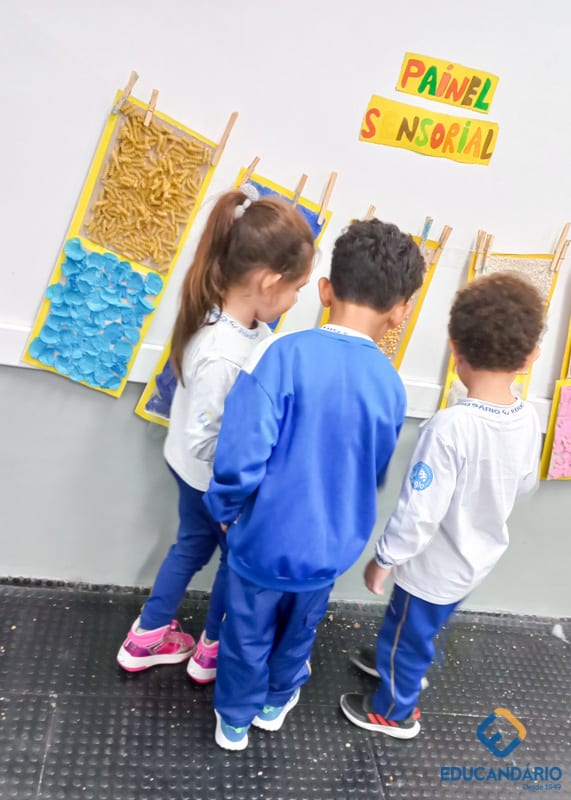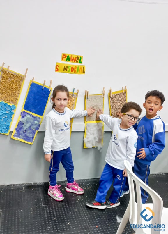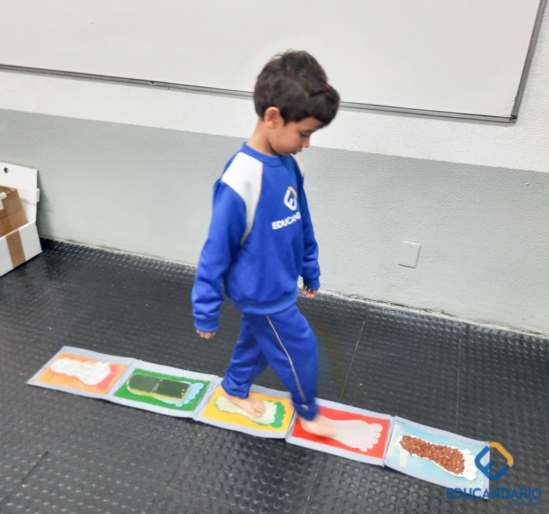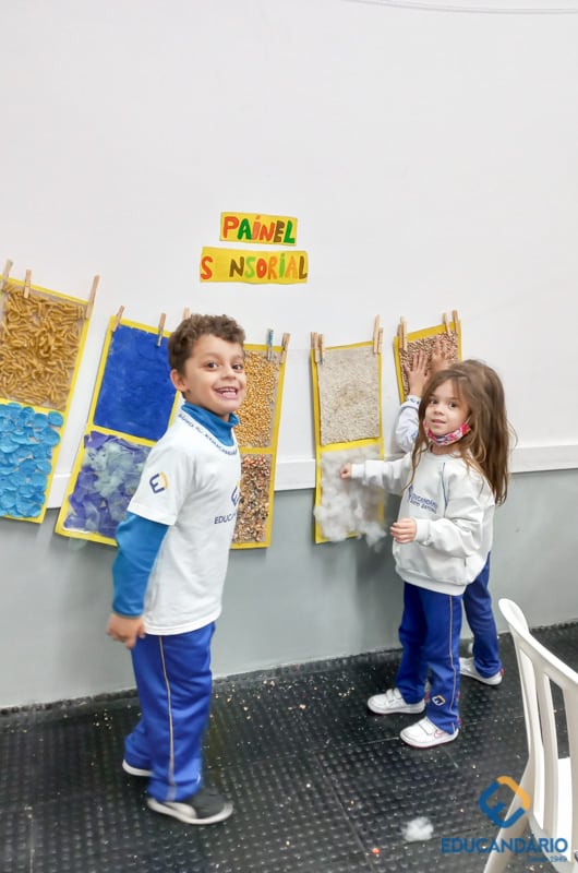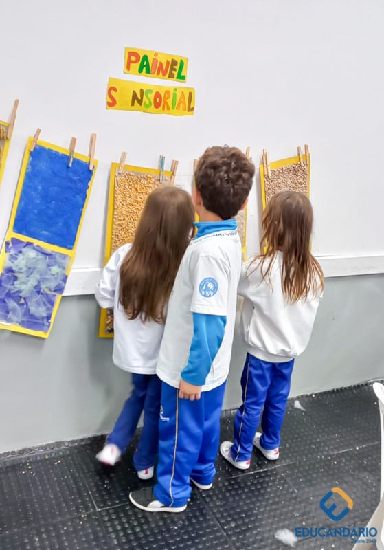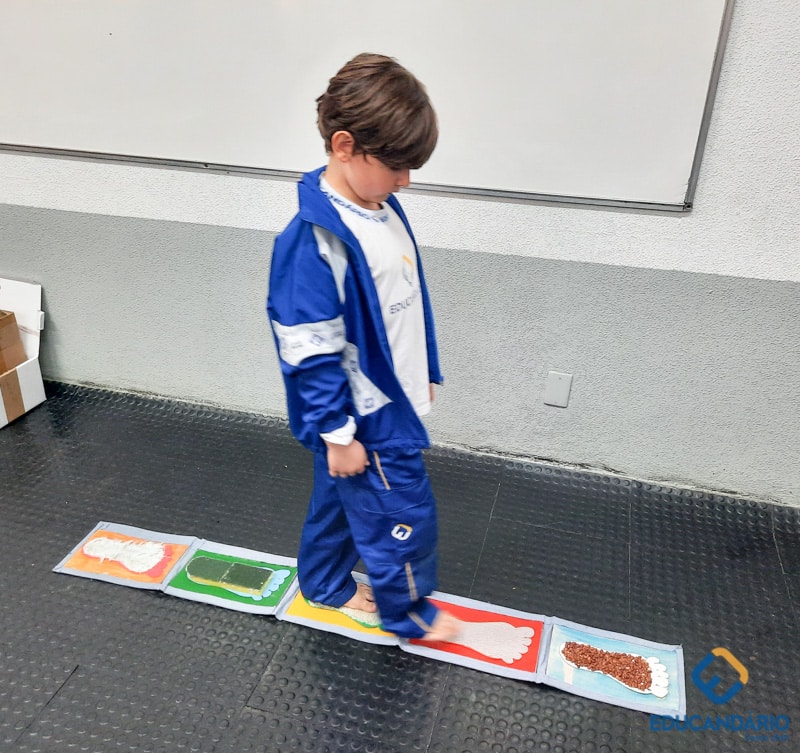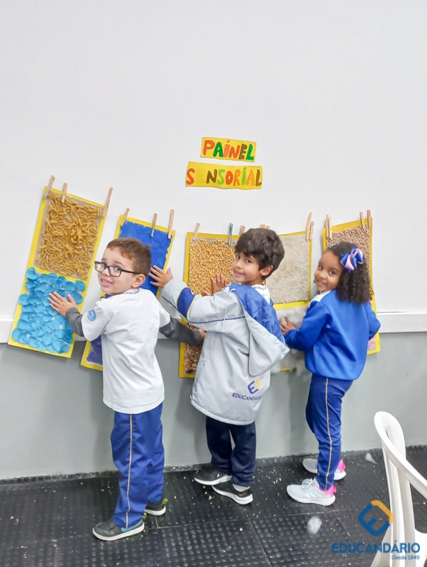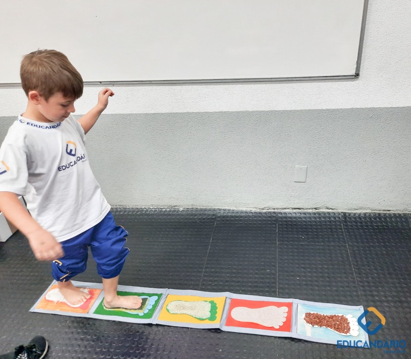 Brincando de sentir as mãos e os pés, o 1º ano confeccionou uma parede sensorial,