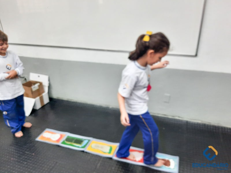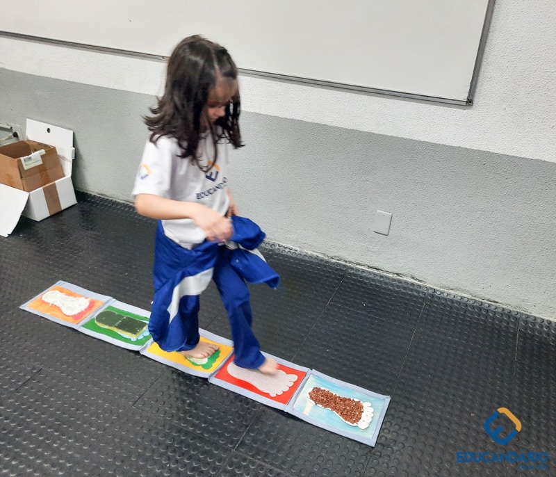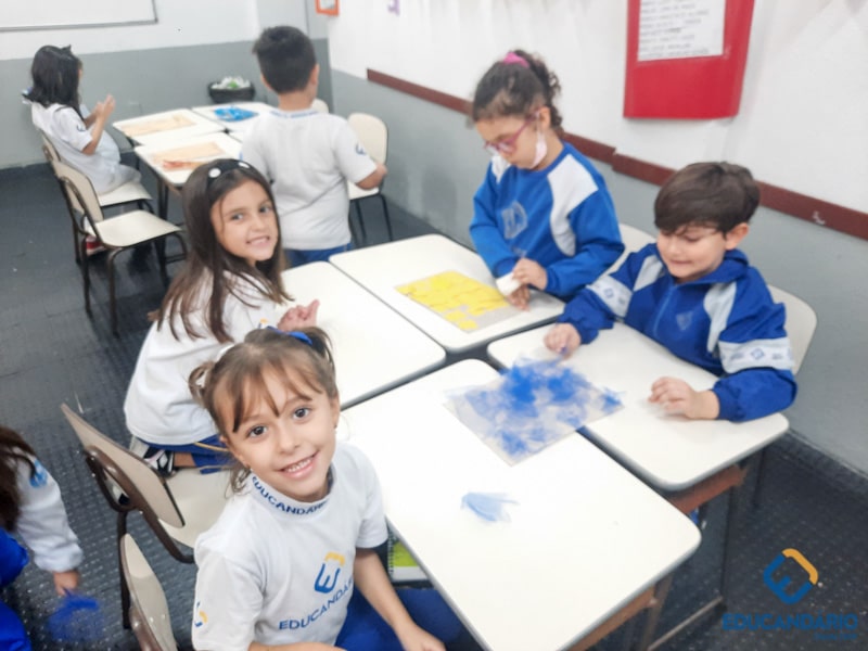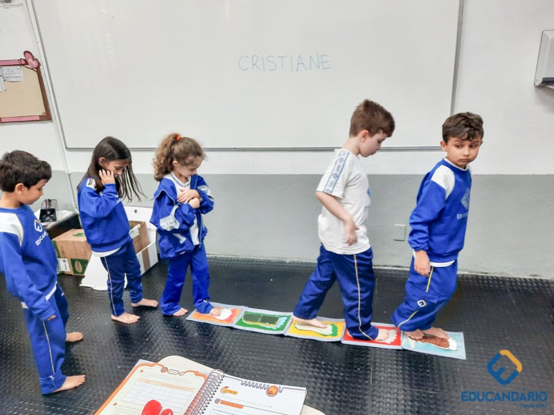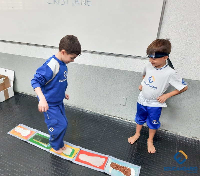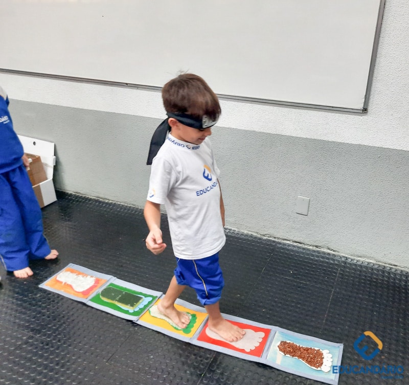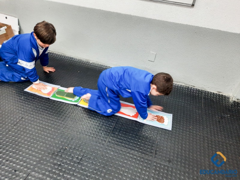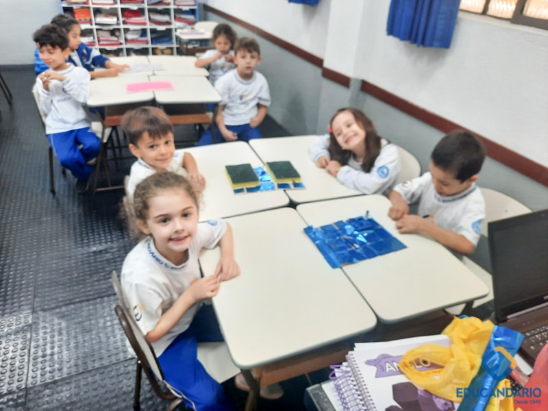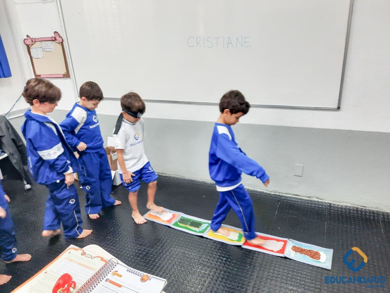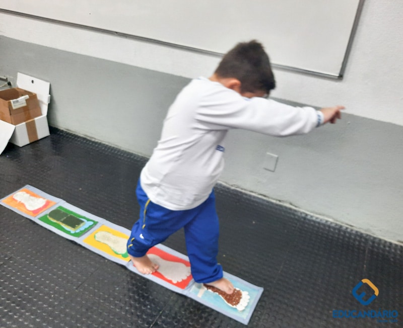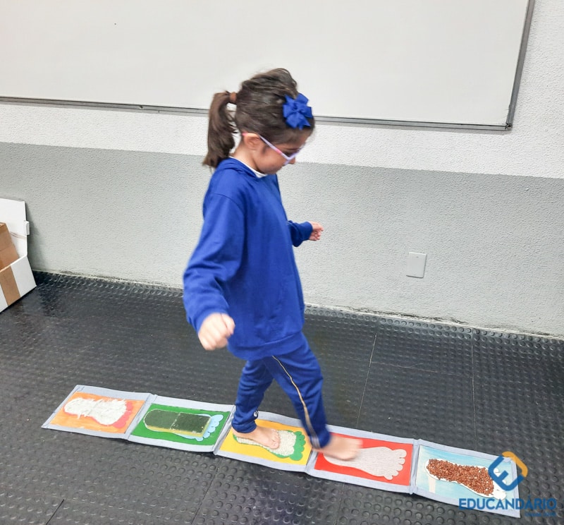 Brincando de sentir as mãos e os pés, o 1º ano confeccionou uma parede sensorial,