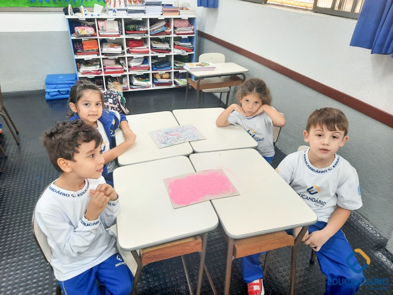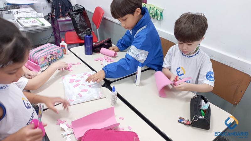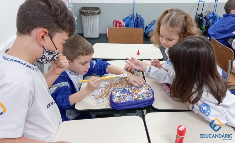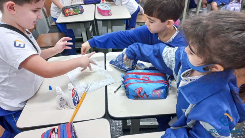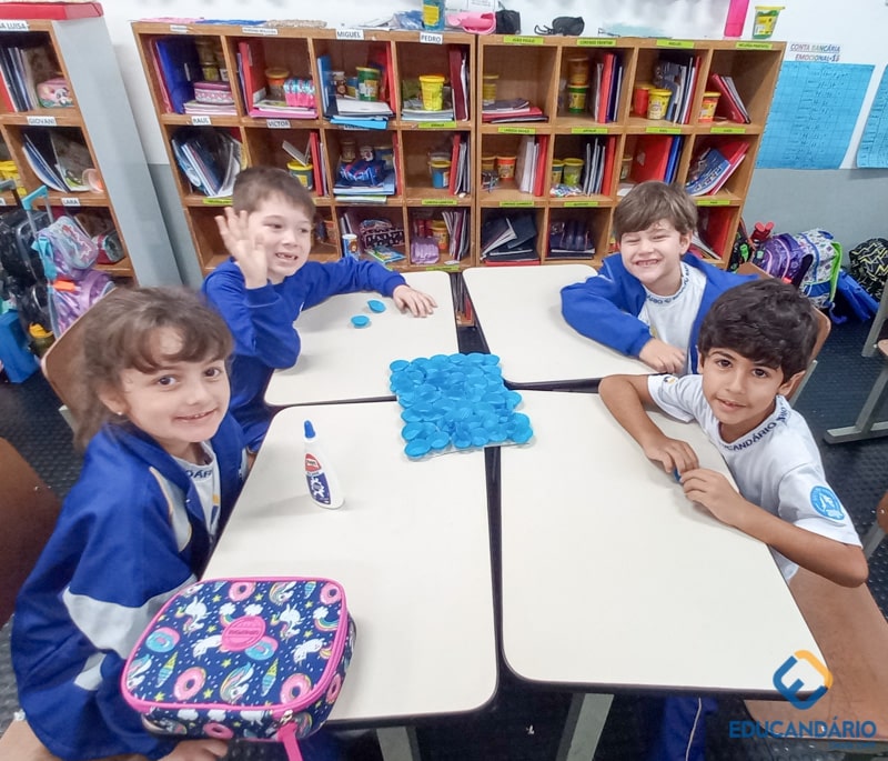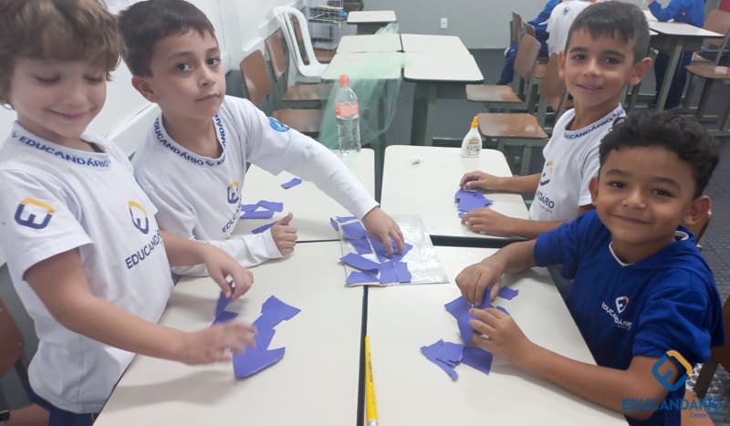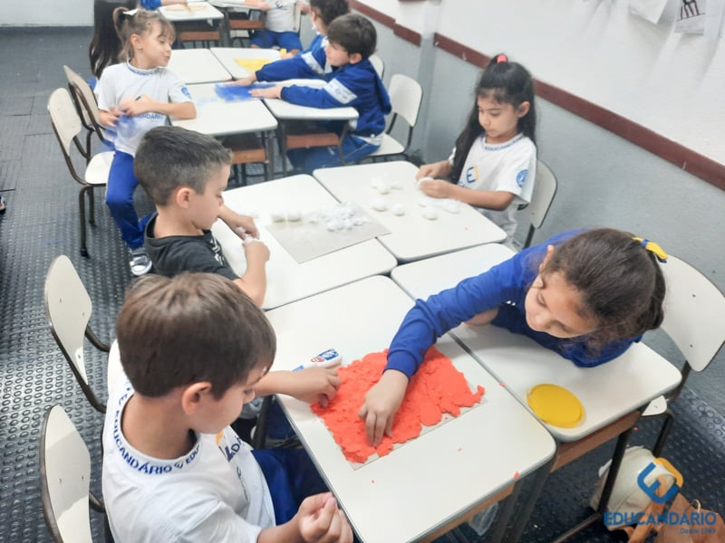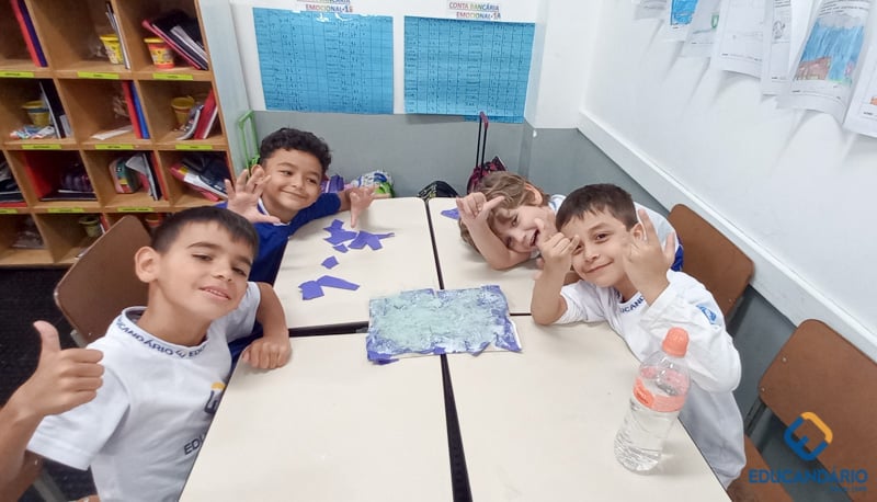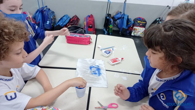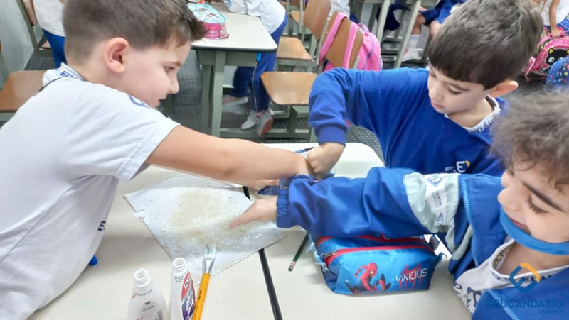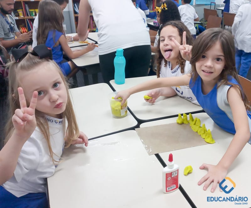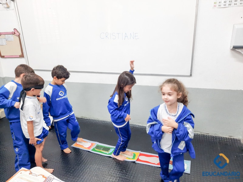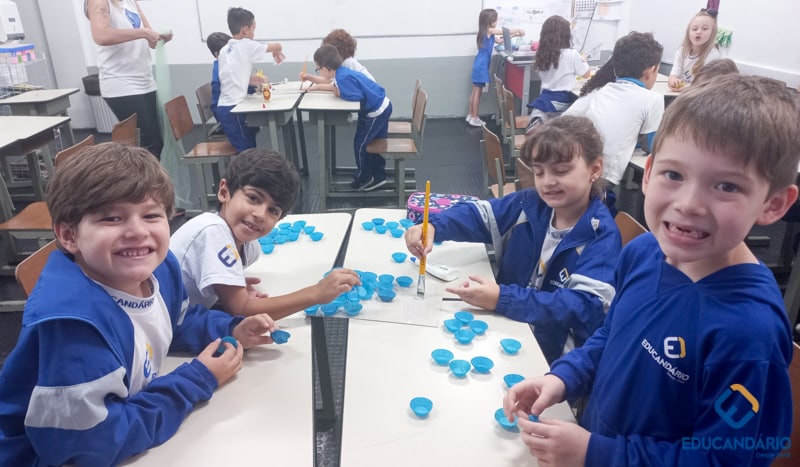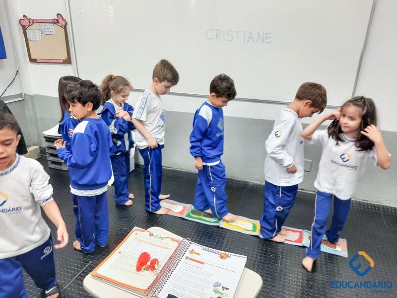Brincando de sentir as mãos e os pés, o 1º ano confeccionou uma parede sensorial,