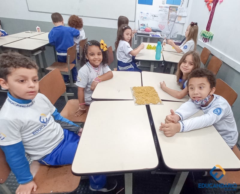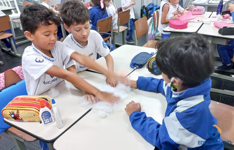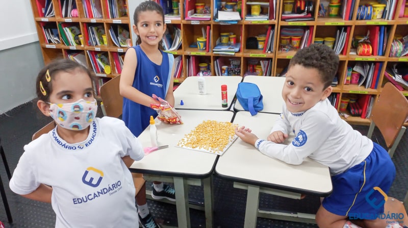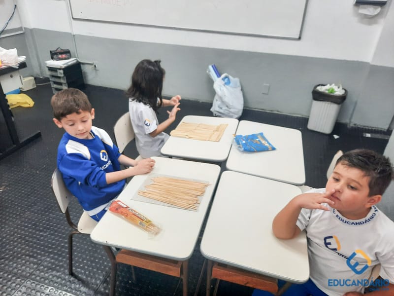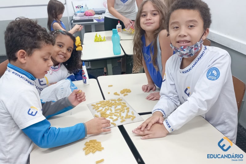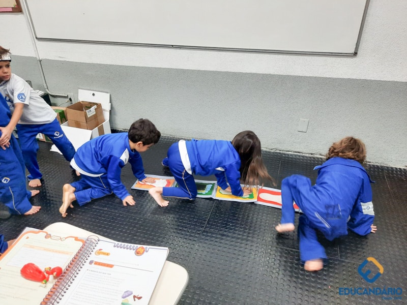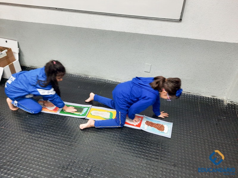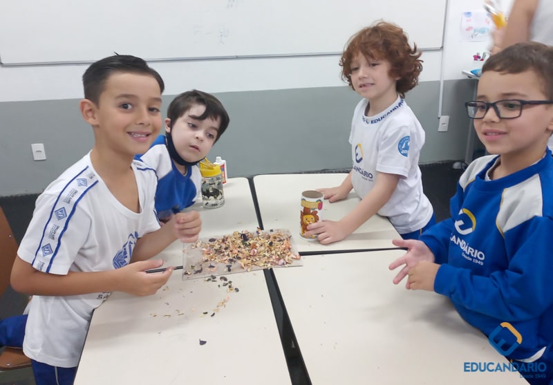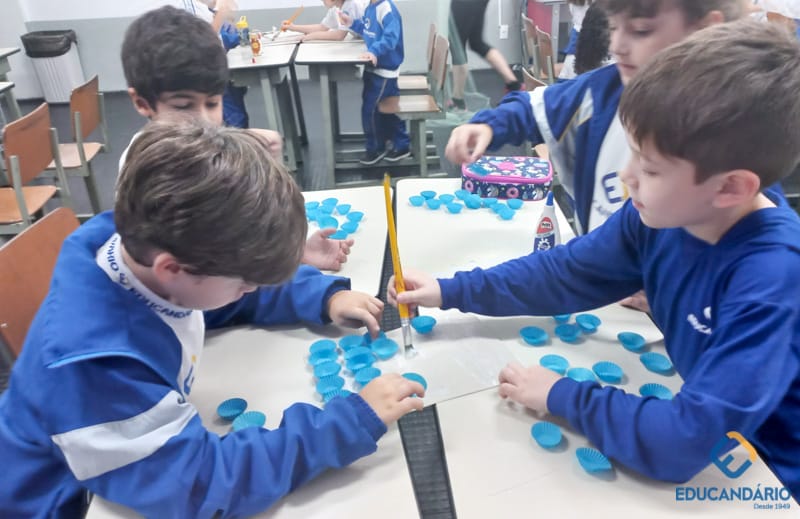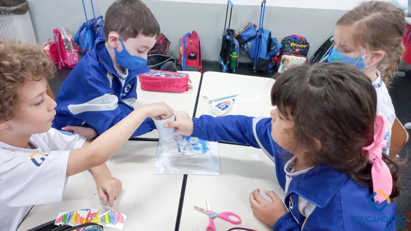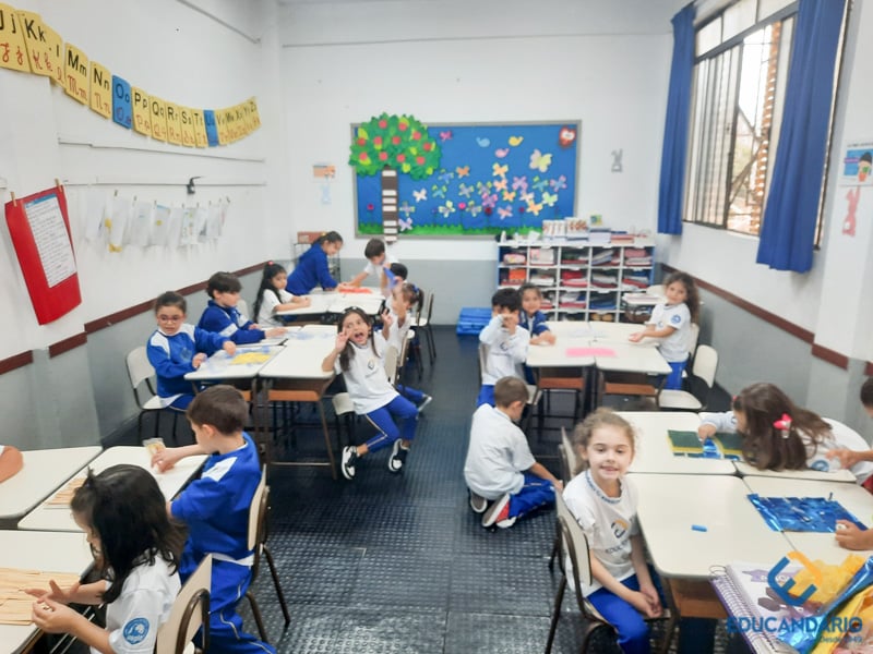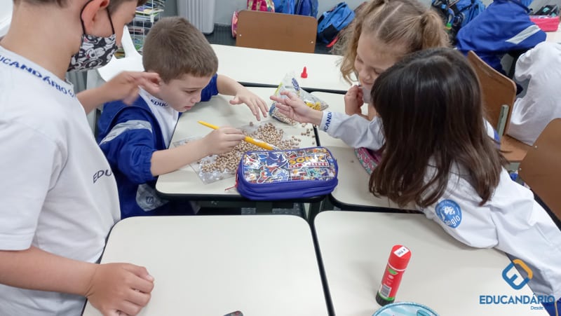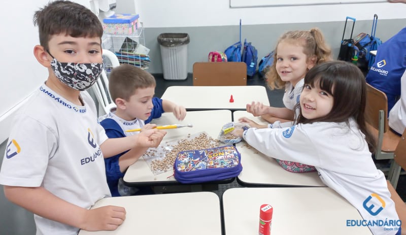 Brincando de sentir as mãos e os pés, o 1º ano confeccionou uma parede sensorial,