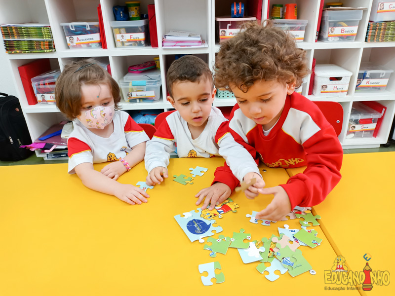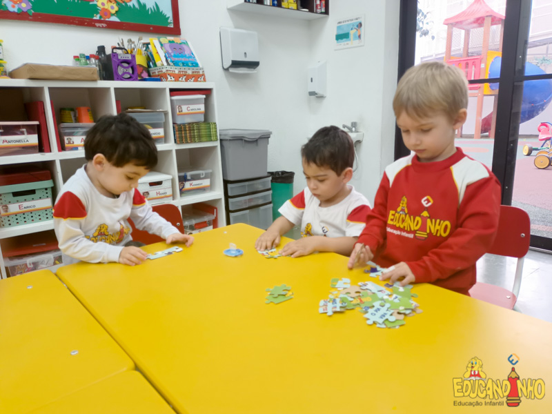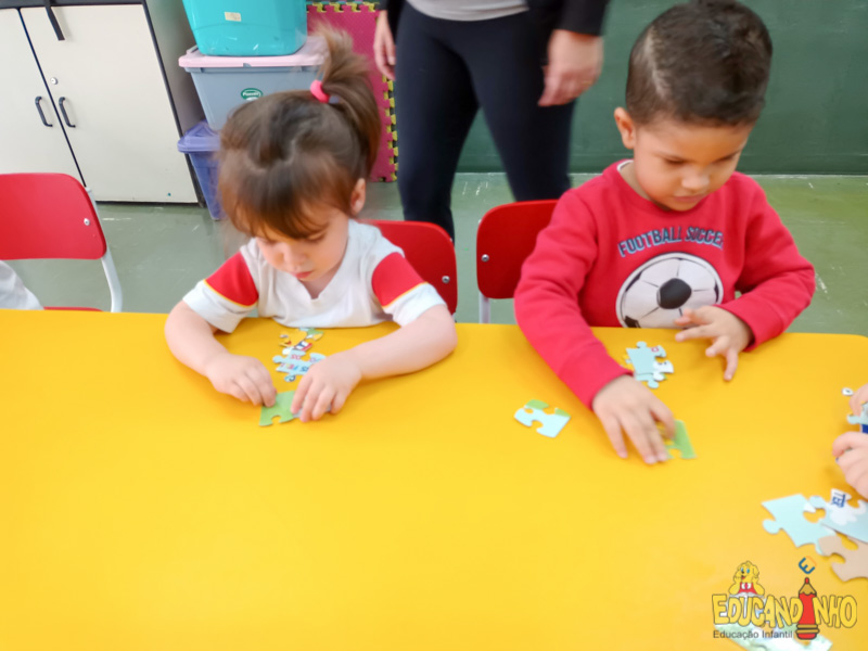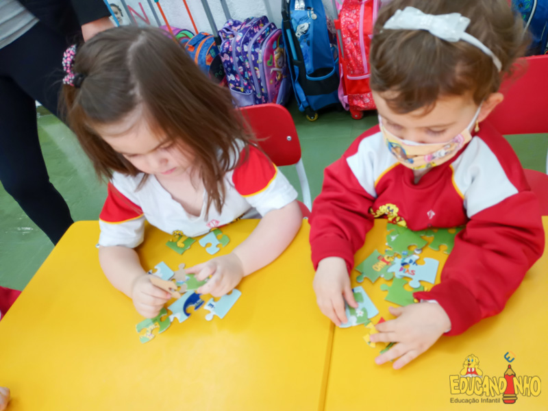 Durante as aulas de inglês as crianças do Infantil 1 conheceram o Puzzle – quebra cabeça. Elas se divertiram muito ao tentar completar o desafio, e tiveram seu raciocínio lógico, coordenação motora e atenção estimulados.