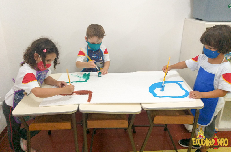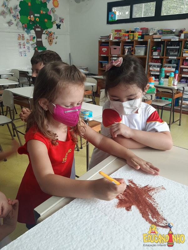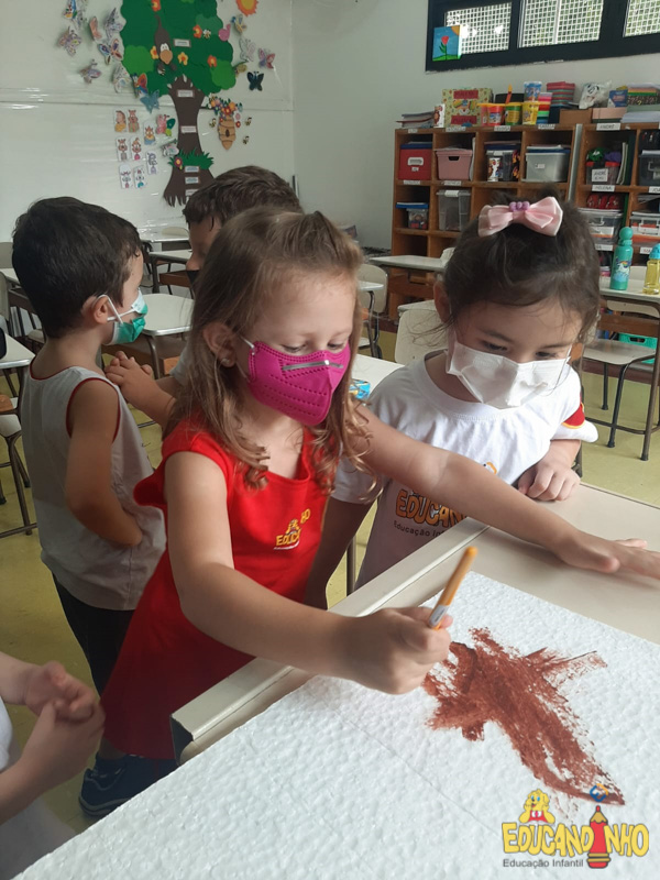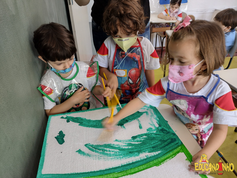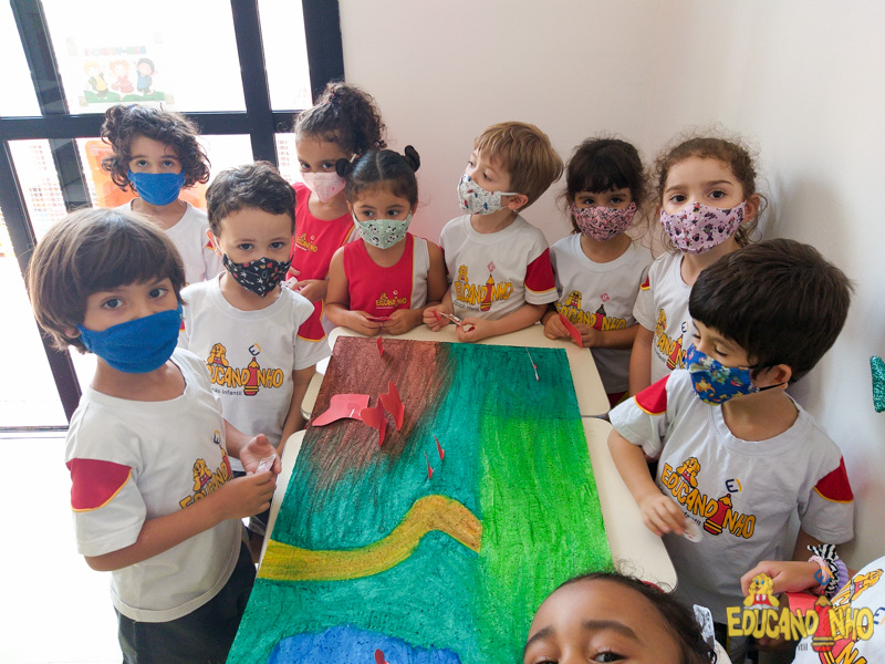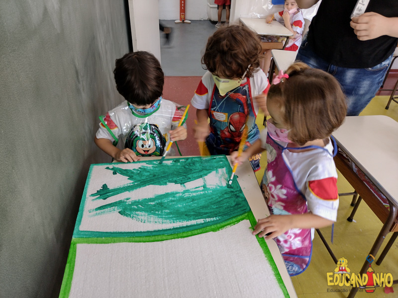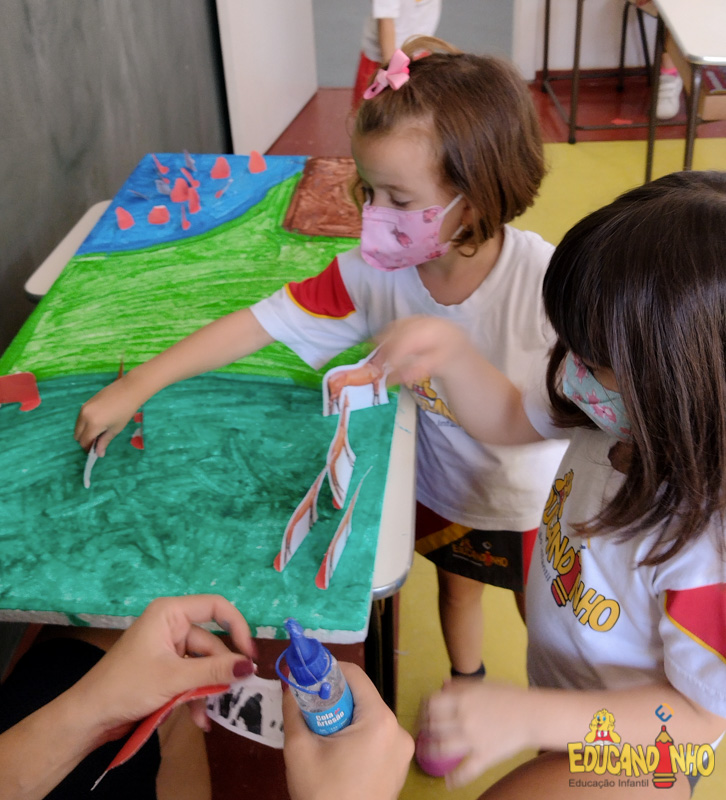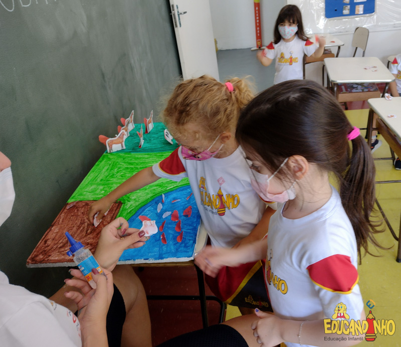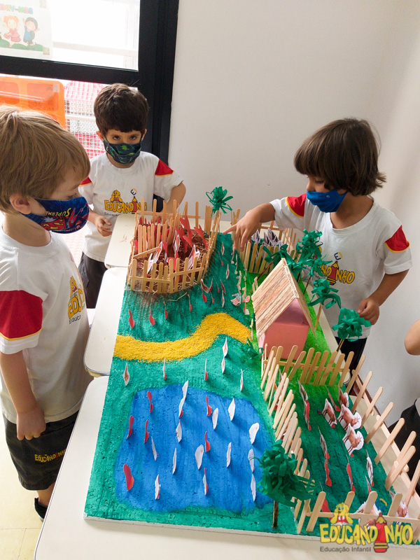 “Os quatro guardiões”, os alunos do Infantil 3 construíram um sítio usando isopor, palitos de sorvete, palha, papel crepom, papelão, tinta, etc. Para representar os animais, usaram as figuras do anexo da apostila Anglo, criando os ambientes, dentro do sítio, para alguns grupos de animais.