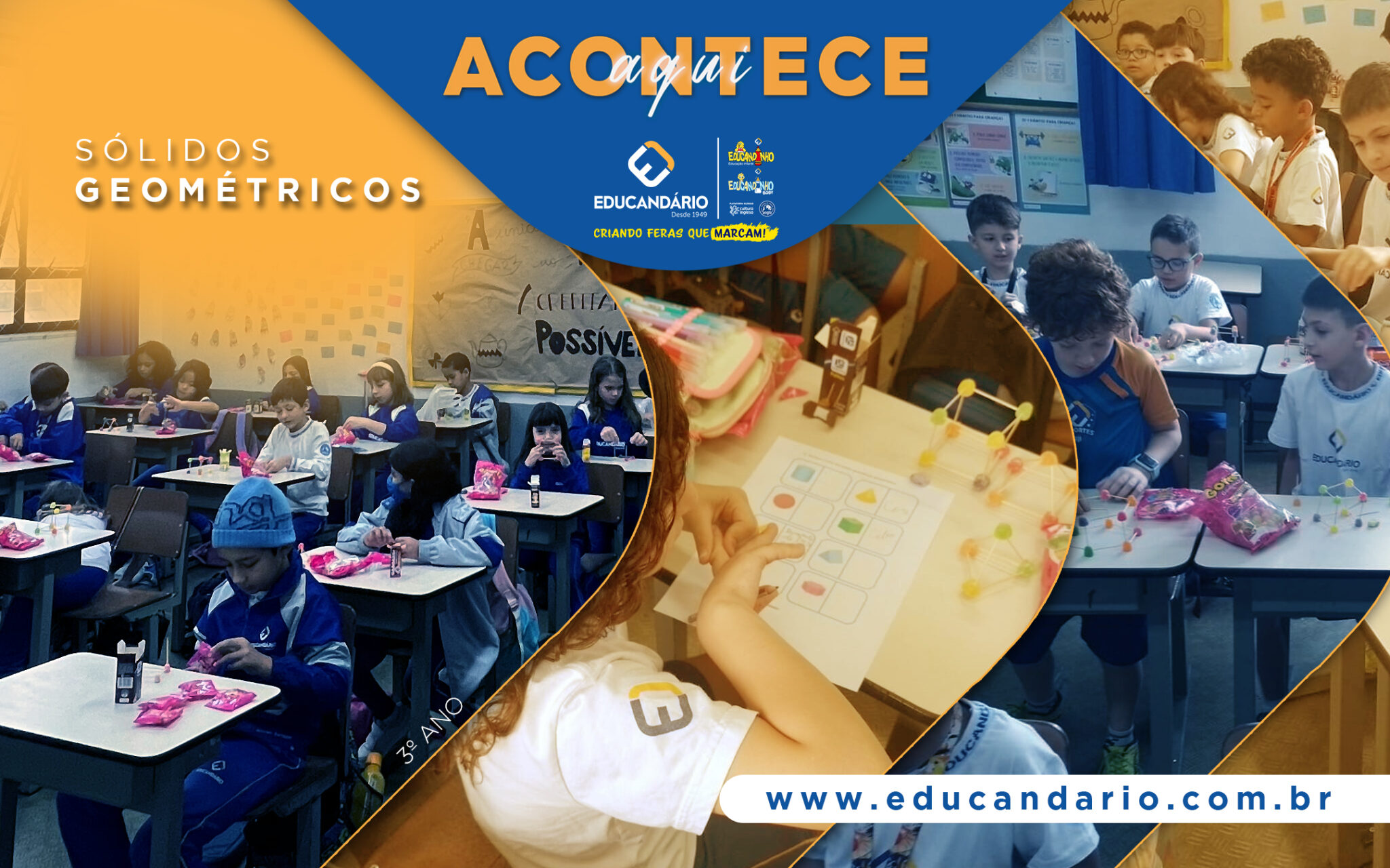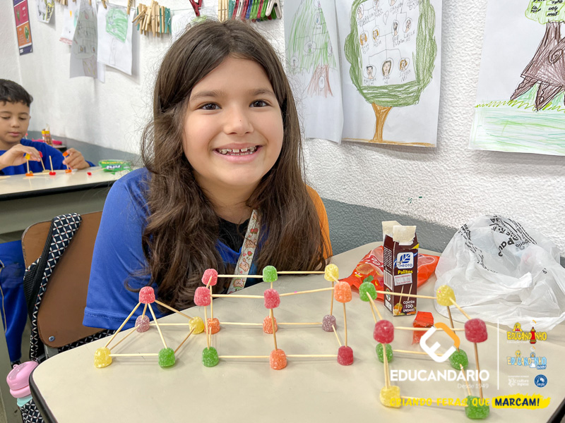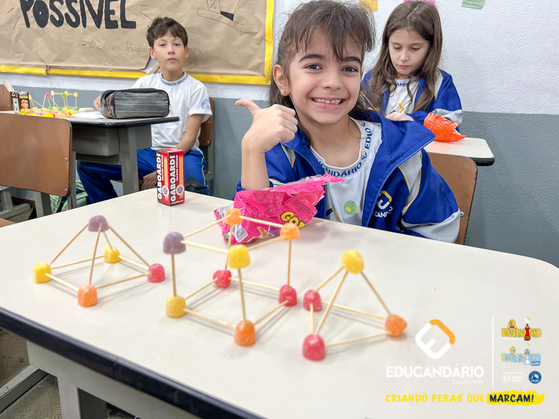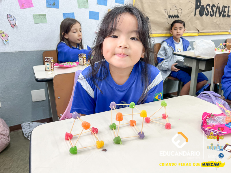 Durante o mês de maio, os alunos dos 3º anos ABC exercitaram os conceitos dos sólidos geométricos previamente estudados nos cadernos Anglo, com o objetivo de proporcionar uma aprendizagem significativa sobre sólidos geométricos, incluindo a classificação entre poliedros e não-poliedros, além de conceitos sobre arestas, vértices e faces. As professoras retomaram e explicaram os conteúdos de maneira diversificada, demonstrando experimentalmente a diferença entre os objetos que rolam (não-poliedros) e os que não rolam (poliedros). Para tornar a aprendizagem mais significativa, os alunos construíram sólidos geométricos utilizando bala de goma e palitos de dente, investigaram suas principais propriedades e registraram o conhecimento adquirido em uma ficha avaliativa. As crianças adoraram explorar e aprender de maneira lúdica, concreta e deliciosa!