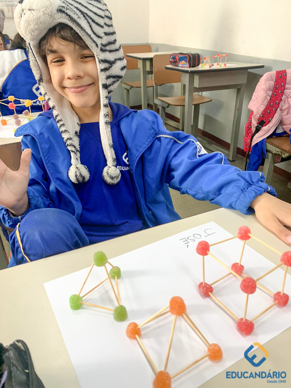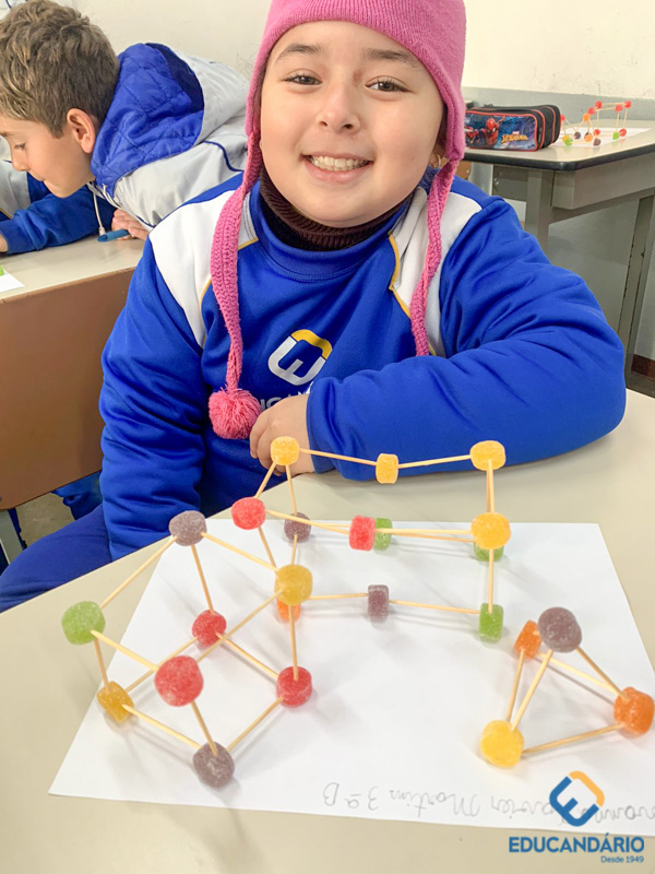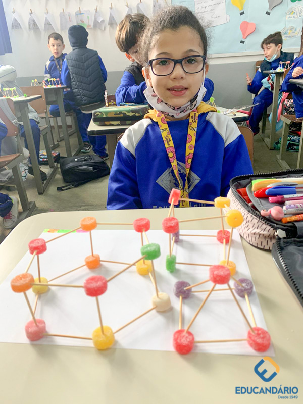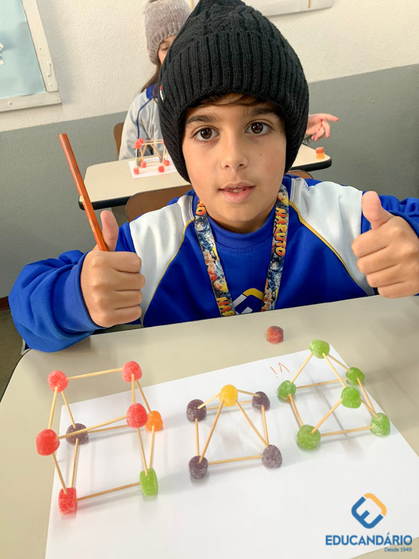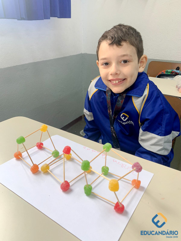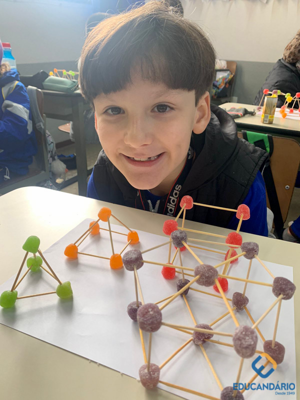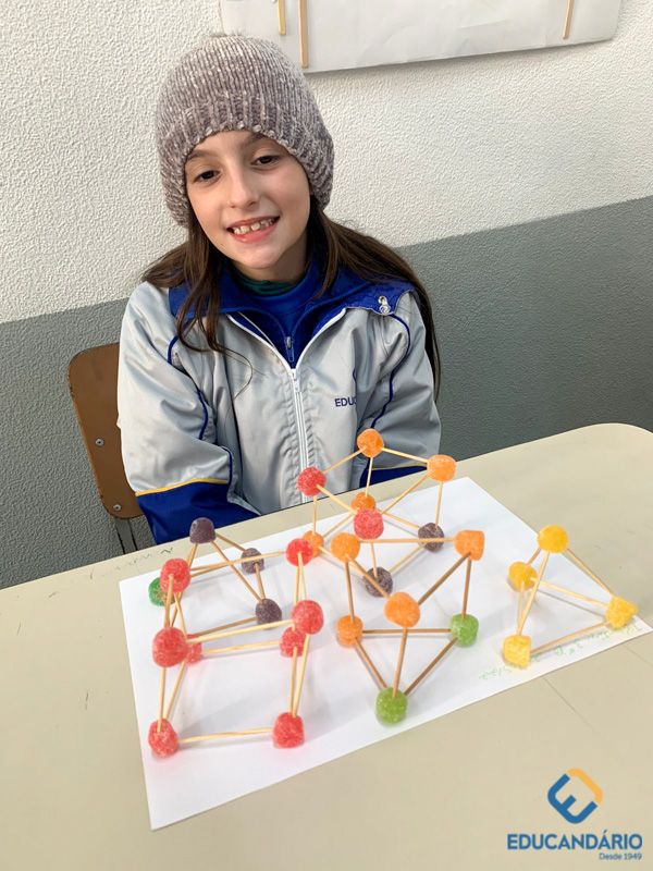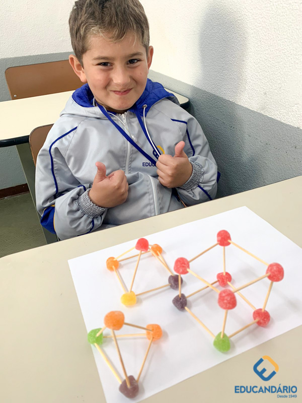 Entendendo a geometria de maneira fácil e gostosa, o 3º ano montou com palitos de dente e balinhas de gomas os Sólidos Geométricos. Acreditamos que a montagem não durou muito tempo…. rs.