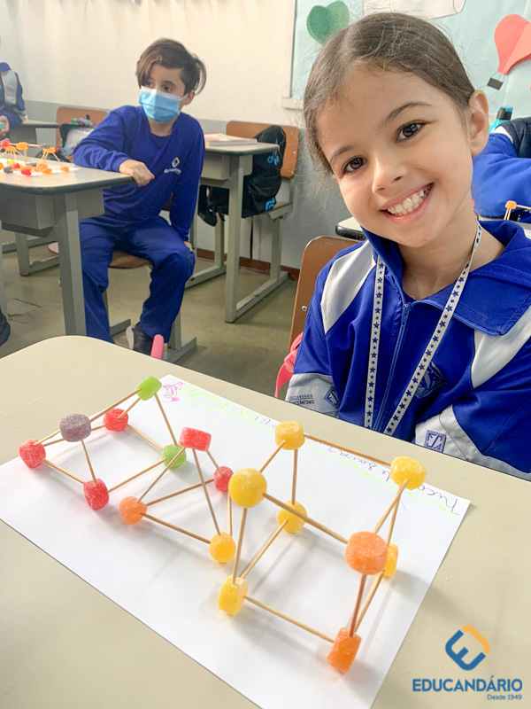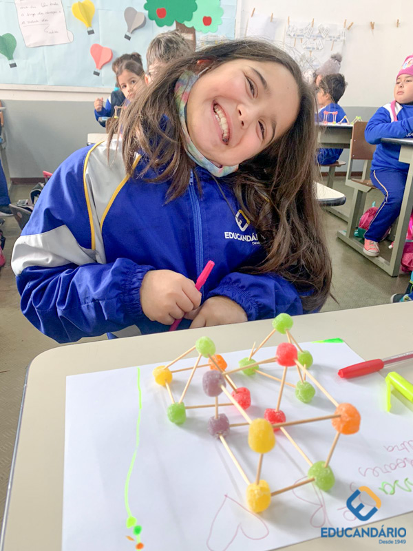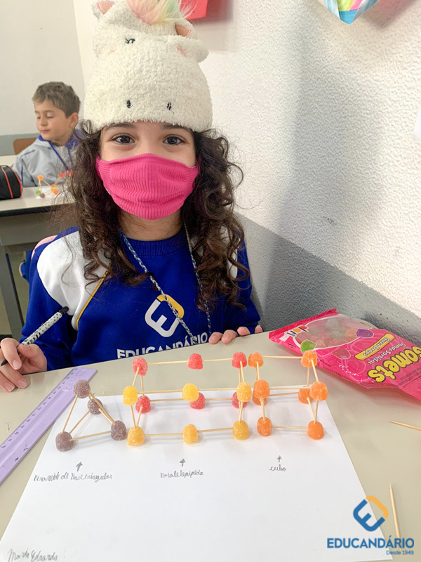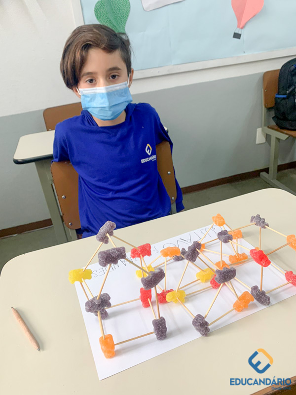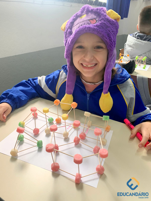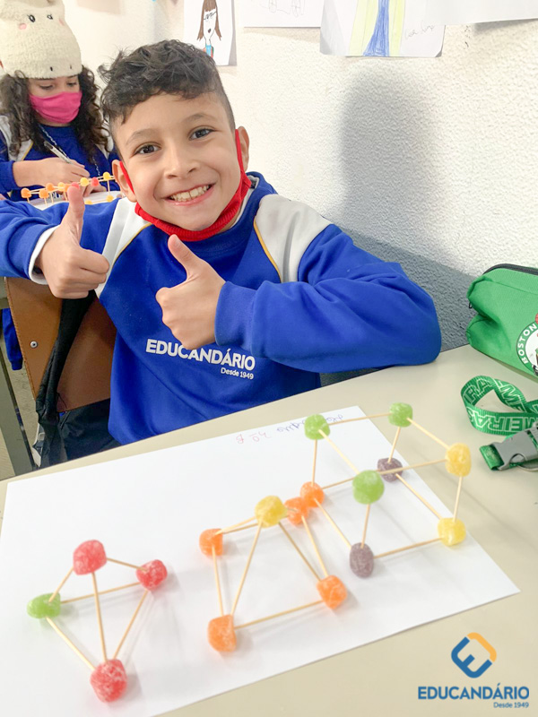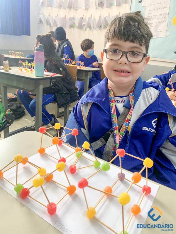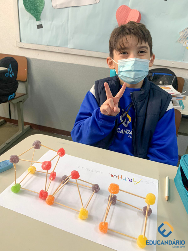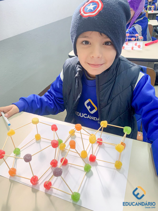 Entendendo a geometria de maneira fácil e gostosa, o 3º ano montou com palitos de dente e balinhas de gomas os Sólidos Geométricos. Acreditamos que a montagem não durou muito tempo…. rs.