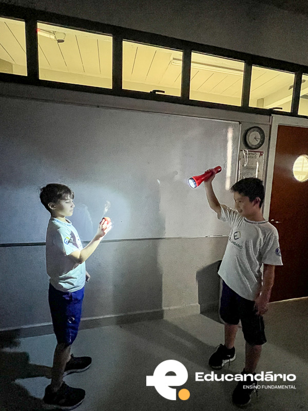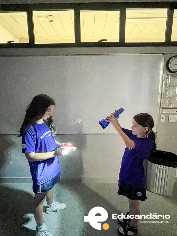 Os alunos trouxeram de casa uma maçã e, em sala de aula, usamos uma lanterna para representar o Sol. A maçã simbolizou o nosso planeta Terra, enquanto a luz da lanterna mostrou como o Sol ilumina apenas uma parte do planeta por vez.